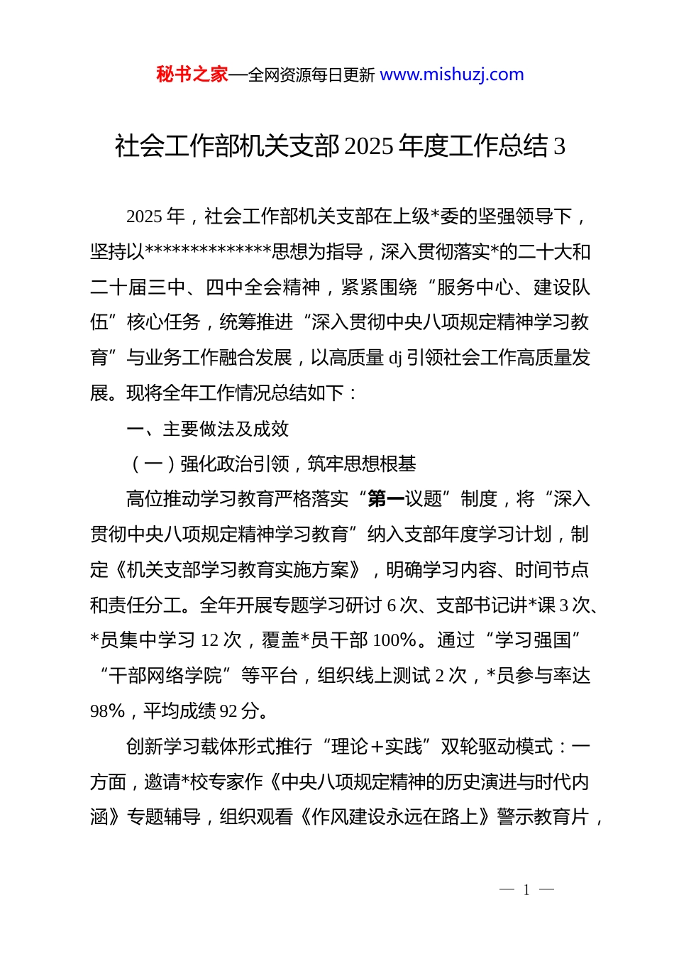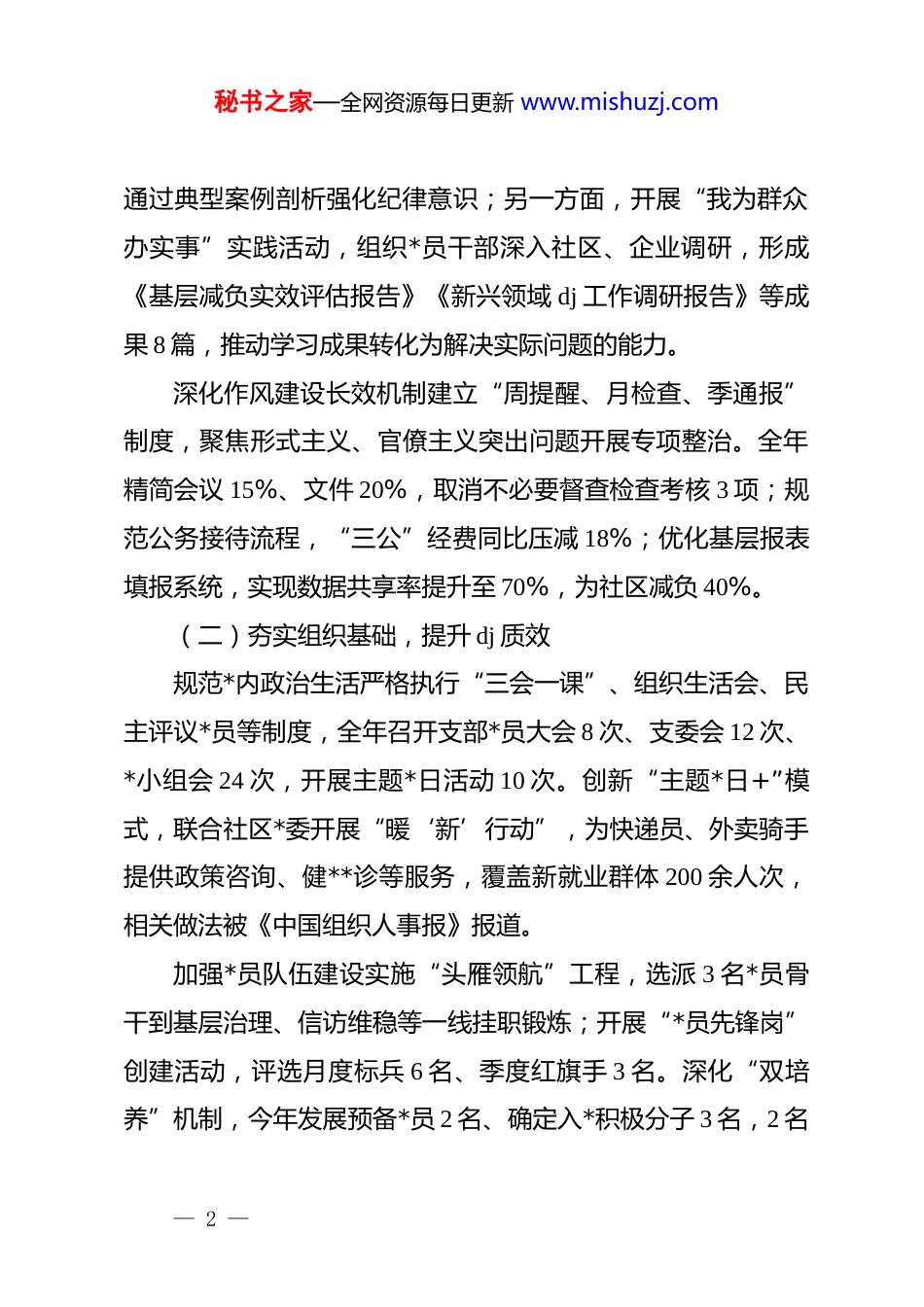 秘书之家—全网资源每日更新 www.mishuzj.com社会工作部机关支部 2025 年度工作总结 32025 年,社会工作部机关支部在上级*委的坚强领导下,坚持以**************思想为指导,深入贯彻落实*的二十大和二十届三中、四中全会精神,紧紧围绕“服务中心、建设队伍”核心任务,统筹推进“深入贯彻中央八项规定精神学习教育”与业务工作融合发展,以高质量 dj 引领社会工作高质量发展。现将全年工作情况总结如下:一、主要做法及成效(一)强化政治引领,筑牢思想根基高位推动学习教育严格落实“第一议题”制度,将“深入贯彻中央八项规定精神学习教育”纳入支部年度学习计划,制定《机关支部学习教育实施方案》,明确学习内容、时间节点和责任分工。全年开展专题学习研讨 6 次、支部书记讲*课 3 次、*员集中学习 12 次,覆盖*员干部 100%。通过“学习强国”“干部网络学院”等平台,组织线上测试 2 次,*员参与率达98%,平均成绩 92 分。创新学习载体形式推行“理论+实践”双轮驱动模式:一方面,邀请*校专家作《中央八项规定精神的历史演进与时代内涵》专题辅导,组织观看《作风建设永远在路上》警示教育片,— 1 —秘书之家—全网资源每日更新 www.mishuzj.com通过典型案例剖析强化纪律意识;另一方面,开展“我为群众办实事”实践活动,组织*员干部深入社区、企业调研,形成《基层减负实效评估报告》《新兴领域 dj 工作调研报告》等成果 8 篇,推动学习成果转化为解决实际问题的能力。深化作风建设长效机制建立“周提醒、月检查、季通报”制度,聚焦形式主义、官僚主义突出问题开展专项整治。全年精简会议 15%、文件 20%,取消不必要督查检查考核 3 项;规范公务接待流程,“三公”经费同比压减 18%;优化基层报表填报系统,实现数据共享率提升至 70%,为社区减负 40%。(二)夯实组织基础,提升 dj 质效规范*内政治生活严格执行“三会一课”、组织生活会、民主评议*员等制度,全年召开支部*员大会 8 次、支委会 12 次、*小组会 24 次,开展主题*日活动 10 次。创新“主题*日+”模式,联合社区*委开展“暖‘新’行动”,为快递员、外卖骑手提供政策咨询、健**诊等服务,覆盖新就业群体 200 余人次,相关做法被《中国组织人事报》报道。加强*员队伍建设实施“头雁领航”工程,选派 3 名*员骨干到基层治理、信访维稳等一线挂职锻炼;开展“*员先锋岗”创建活动,评选月度标兵 6 名、季度红旗手 3 名。深化“双培养”机制,今年发展预备*员 2 名、确定入*积极分子 3 名,2 名— 2 —秘书之家—全网资源每日更新 www.mishuzj.com同志通过高级社会工作师评审,持证社工比例提升至 65%。推进 dj 业务融合围绕中心工作设立“*员攻坚项目”,组建“基层治理专班”“新兴领域 dj 专班”,推动解决重点难点问题。在新兴领域 dj 方面,新建*组织 53 个,*组织覆盖率达89%,培育“六合工作法”“税润三新”等 dj 品牌 19 个;在基层治理方面,建成 197 个综合服务驿站,化解群众矛盾纠纷 300余件,群众满意度达 95%。(三)聚焦主责主业,服务发展大局深化基层治理创新牵头建立市县两级 dj 引领基层治理协调机制,制定《破解基层治理“小马拉大车”任务清单》,清理村(社区)不规范挂牌 1468 个,规范证明事项 22 项,入选全省基层减负典型案例。探索建立“市区联合调度中心”,整合12345 热线、网格巡查等数据资源,实现问题处置效率提升30%,相关经验在全省现场会上作交流发言。强化新兴领域 dj 成立互联网、交通运输等行业*委 42 个,组建“两新”组织联合*支部 94 个,推动 531 家新经济组织、新社会组织实现*的工作覆盖。打造“云岭先锋新家园”暖“新”阵地 204 个,构建“10 分钟暖心服务圈”,解决新就业群体急难愁盼问题 300 余个,2 个案例获全国新业态 dj 优秀案例二、三等奖。— 3 —秘书之家—全网资源每日更新 www.mishuzj.com提升服务群众能力开展“社工+志愿者”联动服务,注册志愿者 27.8 万人次,实施志愿服务项目 48157 个,惠及群众83.4 万人次。创新“情倾故乡...