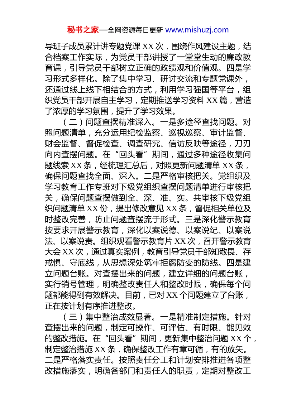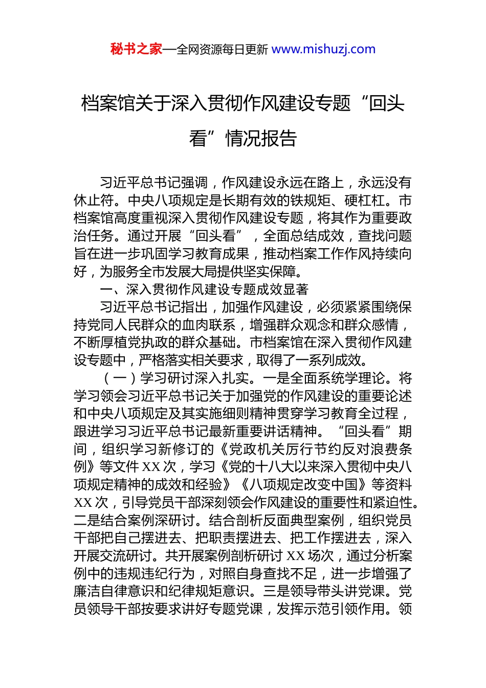 秘书之家—全网资源每日更新 www.mishuzj.com档案馆关于深入贯彻作风建设专题“回头看”情况报告习近平总书记强调,作风建设永远在路上,永远没有休止符。中央八项规定是长期有效的铁规矩、硬杠杠。市档案馆高度重视深入贯彻作风建设专题,将其作为重要政治任务。通过开展“回头看”,全面总结成效,查找问题旨在进一步巩固学习教育成果,推动档案工作作风持续向好,为服务全市发展大局提供坚实保障。一、深入贯彻作风建设专题成效显著习近平总书记指出,加强作风建设,必须紧紧围绕保持党同人民群众的血肉联系,增强群众观念和群众感情,不断厚植党执政的群众基础。市档案馆在深入贯彻作风建设专题中,严格落实相关要求,取得了一系列成效。(一)学习研讨深入扎实。一是全面系统学理论。将学习领会习近平总书记关于加强党的作风建设的重要论述和中央八项规定及其实施细则精神贯穿学习教育全过程,跟进学习习近平总书记最新重要讲话精神。“回头看”期间,组织学习新修订的《党政机关厉行节约反对浪费条例》等文件 XX 次,学习《党的十八大以来深入贯彻中央八项规定精神的成效和经验》《八项规定改变中国》等资料XX 次,引导党员干部深刻领会作风建设的重要性和紧迫性。二是结合案例深研讨。结合剖析反面典型案例,组织党员干部把自己摆进去、把职责摆进去、把工作摆进去,深入开展交流研讨。共开展案例剖析研讨 XX 场次,通过分析案例中的违规违纪行为,对照自身查找不足,进一步增强了廉洁自律意识和纪律规矩意识。三是领导带头讲党课。党员领导干部按要求讲好专题党课,发挥示范引领作用。领秘书之家—全网资源每日更新 www.mishuzj.com导班子成员累计讲专题党课 XX 次,围绕作风建设主题,结合档案工作实际,为党员干部讲授了一堂堂生动的廉政教育课,引导党员干部树立正确的政绩观和价值观。四是学习形式多样化。除了集中学习、研讨交流和专题党课外,还通过线上线下相结合的方式,利用学习强国等平台,组织党员干部开展自主学习,定期推送学习资料 XX 篇,营造了浓厚的学习氛围,提升了学习效果。(二)问题查摆精准深入。一是多途径查找问题。对照问题清单,充分运用纪检监察、巡视巡察、审计监督、财会监督、督促检查、调查研究、信访反映等途径,刀刃向内查摆问题。在“回头看”期间,通过多种途径收集问题线索 XX 条,经梳理汇总后,对照更新问题清单 XX 条,确保问题查找全面、深入。二是严格审核把关。党组织及学习教育工作专班对下级党组织查摆问题清单进行审核把关,确保问题查摆做到全、深、准、实。共审核下级党组织问题清单 XX 份,提出修改意见 XX 条,督促相关单位及时整改完善,防止问题查摆流于形式。三是深化警示教育按要求开展警示教育,深化以案说德、以案说纪、以案说法、以案说责。组织观看警示教育片 XX 次,召开警示教育大会 XX 次,通过真实案例,教育引导党员干部知敬畏、存戒惧、守底线,从思想深处筑牢拒腐防变的防线。四是建立问题台账。对查摆出来的问题,建立详细的问题台账,实行销号管理,明确整改责任人和整改时限,确保每个问题都能得到有效解决。目前,已对 XX 个问题建立了台账,正在按计划有序推进整改。(三)集中整治成效显著。一是精准制定措施。针对查摆出来的问题,制定可操作、可评估、有时限、能见效的整改措施。在“回头看”期间,更新集中整治问题 XX 个,制定整治措施 XX 条,确保整改工作有章可循,有的放矢。二是严格落实责任。按照责任分工和计划安排推进各项整改措施落实,明确各部门和责任人的职责,定期对整改工秘书之家—全网资源每日更新 www.mishuzj.com作进行调度和督促。目前,已完成整改措施落实 XX 项,其余各项措施正在稳步推进中,确保整改工作按时序进度完成。三是专项整治突出问题。按照有关通知和工作提示要求,组织开展集中整治违规吃喝,针对违规收送礼品礼金侵害群众利益、不担当不作为等突出问题,动真碰硬开展集中整治。共开展专项检查 XX 次,发现并纠正问题 XX 个,对相关责任人进行了批评教育和问责,有效遏制了违规违纪行为的发生。四是健全长效机制。推动...