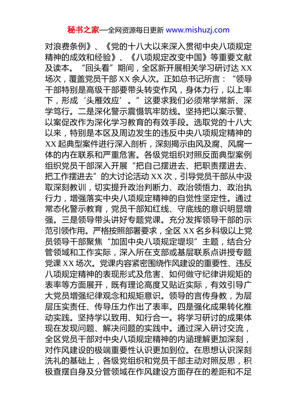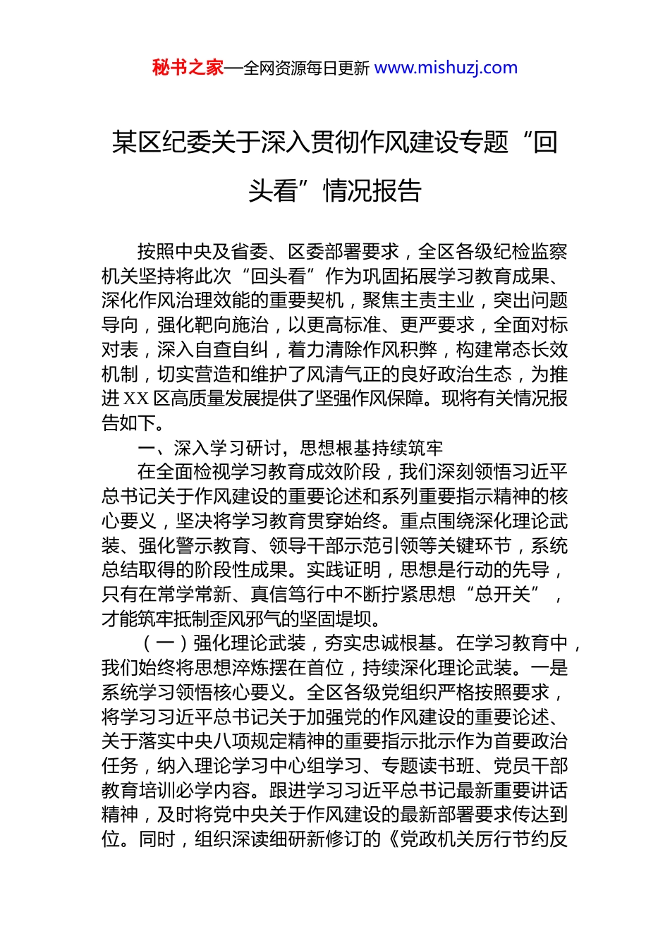 秘书之家—全网资源每日更新 www.mishuzj.com某区纪委关于深入贯彻作风建设专题“回头看”情况报告按照中央及省委、区委部署要求,全区各级纪检监察机关坚持将此次“回头看”作为巩固拓展学习教育成果、深化作风治理效能的重要契机,聚焦主责主业,突出问题导向,强化靶向施治,以更高标准、更严要求,全面对标对表,深入自查自纠,着力清除作风积弊,构建常态长效机制,切实营造和维护了风清气正的良好政治生态,为推进 XX 区高质量发展提供了坚强作风保障。现将有关情况报告如下。一、深入学习研讨,思想根基持续筑牢在全面检视学习教育成效阶段,我们深刻领悟习近平总书记关于作风建设的重要论述和系列重要指示精神的核心要义,坚决将学习教育贯穿始终。重点围绕深化理论武装、强化警示教育、领导干部示范引领等关键环节,系统总结取得的阶段性成果。实践证明,思想是行动的先导,只有在常学常新、真信笃行中不断拧紧思想“总开关”,才能筑牢抵制歪风邪气的坚固堤坝。(一)强化理论武装,夯实忠诚根基。在学习教育中,我们始终将思想淬炼摆在首位,持续深化理论武装。一是系统学习领悟核心要义。全区各级党组织严格按照要求,将学习习近平总书记关于加强党的作风建设的重要论述、关于落实中央八项规定精神的重要指示批示作为首要政治任务,纳入理论学习中心组学习、专题读书班、党员干部教育培训必学内容。跟进学习习近平总书记最新重要讲话精神,及时将党中央关于作风建设的最新部署要求传达到位。同时,组织深读细研新修订的《党政机关厉行节约反秘书之家—全网资源每日更新 www.mishuzj.com对浪费条例》、《党的十八大以来深入贯彻中央八项规定精神的成效和经验》、《八项规定改变中国》等重要文献及读本。“回头看”期间,全区新开展相关学习研讨达 XX场次,覆盖党员干部 XX 余人次。正如总书记所言:“领导干部特别是高级干部要带头转变作风,身体力行,以上率下,形成‘头雁效应’。”这要求我们必须常学常新、深学笃行。二是深化警示震慑筑牢防线。坚持把以案示警、以案促改作为深化学习教育的有效手段。选取党的十八大以来,特别是本区及周边发生的违反中央八项规定精神的XX 起典型案件进行深入剖析,深刻揭示由风及腐、风腐一体的内在联系和严重危害。各级党组织对照反面典型案例组织党员干部深入开展“把自己摆进去、把职责摆进去、把工作摆进去”的大讨论活动 XX 次,引导党员干部从中汲取深刻教训,切实提升政治判断力、政治领悟力、政治执行力,增强落实中央八项规定精神的自觉性坚定性。通过常态化警示教育,党员干部知红线、守底线的意识明显增强。三是领导带头讲好专题党课。充分发挥领导干部的示范引领作用。严格按照部署要求,全区 XX 名乡科级以上党员领导干部聚焦“加固中央八项规定堤坝”主题,结合分管领域和工作实际,深入所在支部或基层联系点讲授专题党课 XX 场次。党课内容紧密围绕作风建设的重要性、违反八项规定精神的表现形式及危害、如何做守纪律讲规矩的表率等方面展开,既有理论高度又贴近实际,有效引导广大党员增强纪律观念和规矩意识。领导的言传身教,为层层压实责任、传导压力作出了表率。四是强化成果转化推动实践。坚持学以致用、知行合一。将学习研讨的成果体现在发现问题、解决问题的实践中。通过深入研讨交流,全区党员干部对中央八项规定精神的内涵理解更加深刻,对作风建设的极端重要性认识更加到位。在思想认识深刻洗礼的基础上,各级党组织和党员干部主动对照反思,积极查摆自身及分管领域在作风建设方面存在的差距和不足秘书之家—全网资源每日更新 www.mishuzj.com为后续问题查摆和集中整治奠定了坚实的思想基础。(二)精准把脉问诊,问题查摆见筋见骨。查摆问题是解决问题的关键前提,唯有刀刃向内、真查实摆,才能找准病灶、精准施治。在本阶段,我们严格对标中央要求聚焦各级党组织和党员干部在作风建设方面存在的深层次问题,坚决把问题找准找实找透。总书记多次强调,“要深入基层、深入实际、深入群众,了解实情、倾听民意、解决问题。”这要求我们必须用好多种监督手段,确保问题查摆到点到位。一是...