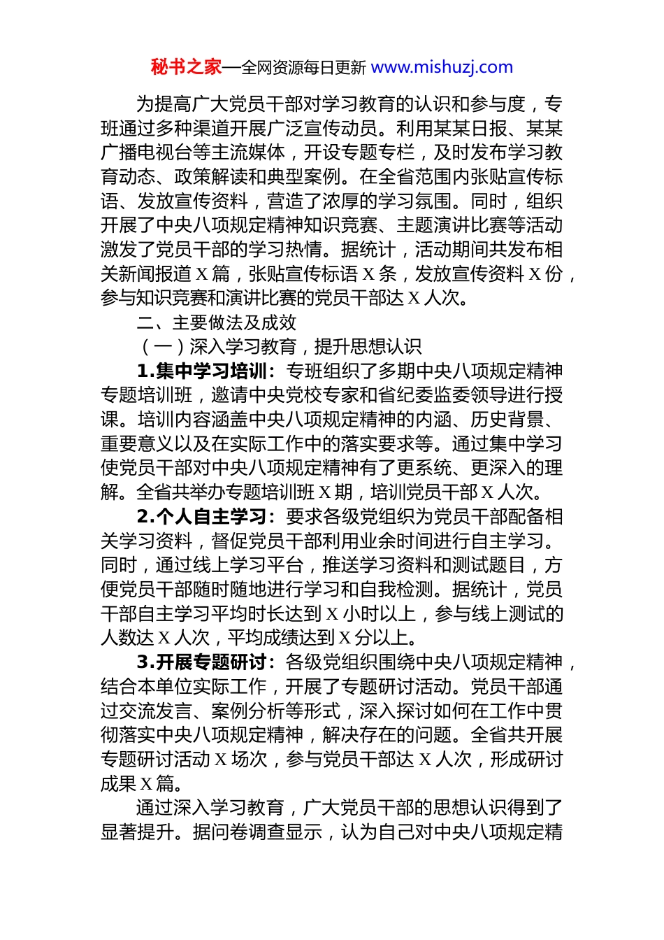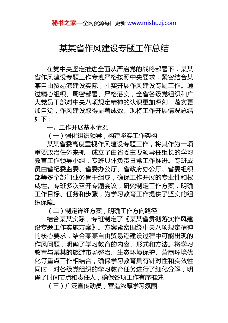 秘书之家—全网资源每日更新 www.mishuzj.com某某省作风建设专题工作总结在党中央坚定推进全面从严治党的战略部署下,某某省作风建设专题工作专班严格按照中央要求,紧密结合某某自由贸易港建设实际,扎实开展作风建设专题工作。通过精心组织、周密部署、严格落实,全省各级党组织和广大党员干部对中央八项规定精神的认识更加深刻,落实更加自觉,作风建设取得显著成效。现将工作开展情况总结如下:一、工作开展基本情况(一)强化组织领导,构建坚实工作架构某某省委高度重视作风建设专题工作,将其作为一项重要政治任务来抓。成立了由省委主要领导任组长的学习教育工作领导小组,专班具体负责日常工作推进。专班成员由省纪委监委、省委办公厅、省政府办公厅、省委组织部等多个部门业务骨干组成,确保工作开展的专业性和权威性。专班多次召开专题会议,研究制定工作方案,明确工作目标、任务和步骤,为学习教育工作提供了坚实的组织保障。(二)制定详细方案,明确工作方向路径结合某某实际,专班制定了《某某省贯彻落实作风建设专题工作实施方案》。方案紧密围绕中央八项规定精神的核心要求,结合某某自由贸易港建设过程中可能出现的作风问题,明确了学习教育的内容、形式和方法。将学习教育与某某的旅游市场整治、生态环境保护、营商环境优化等重点工作相结合,确保学习教育具有针对性和实效性同时,对各级党组织的学习教育任务进行了细化分解,明确了时间节点和责任人,确保各项工作有序推进。(三)广泛宣传动员,营造浓厚学习氛围秘书之家—全网资源每日更新 www.mishuzj.com为提高广大党员干部对学习教育的认识和参与度,专班通过多种渠道开展广泛宣传动员。利用某某日报、某某广播电视台等主流媒体,开设专题专栏,及时发布学习教育动态、政策解读和典型案例。在全省范围内张贴宣传标语、发放宣传资料,营造了浓厚的学习氛围。同时,组织开展了中央八项规定精神知识竞赛、主题演讲比赛等活动激发了党员干部的学习热情。据统计,活动期间共发布相关新闻报道 X 篇,张贴宣传标语 X 条,发放宣传资料 X 份,参与知识竞赛和演讲比赛的党员干部达 X 人次。二、主要做法及成效(一)深入学习教育,提升思想认识1.集中学习培训:专班组织了多期中央八项规定精神专题培训班,邀请中央党校专家和省纪委监委领导进行授课。培训内容涵盖中央八项规定精神的内涵、历史背景、重要意义以及在实际工作中的落实要求等。通过集中学习使党员干部对中央八项规定精神有了更系统、更深入的理解。全省共举办专题培训班 X 期,培训党员干部 X 人次。2.个人自主学习:要求各级党组织为党员干部配备相关学习资料,督促党员干部利用业余时间进行自主学习。同时,通过线上学习平台,推送学习资料和测试题目,方便党员干部随时随地进行学习和自我检测。据统计,党员干部自主学习平均时长达到 X 小时以上,参与线上测试的人数达 X 人次,平均成绩达到 X 分以上。3.开展专题研讨:各级党组织围绕中央八项规定精神,结合本单位实际工作,开展了专题研讨活动。党员干部通过交流发言、案例分析等形式,深入探讨如何在工作中贯彻落实中央八项规定精神,解决存在的问题。全省共开展专题研讨活动 X 场次,参与党员干部达 X 人次,形成研讨成果 X 篇。通过深入学习教育,广大党员干部的思想认识得到了显著提升。据问卷调查显示,认为自己对中央八项规定精秘书之家—全网资源每日更新 www.mishuzj.com神“非常了解”的党员干部比例从学习教育前的 X%提高到了 X%,认为中央八项规定精神对工作“有重要指导作用”的比例从 X%提高到了 X%。(二)严格监督检查,确保落实到位1.日常监督检查:专班组建了多个监督检查组,采取定期检查与不定期抽查相结合的方式,对全省各级党组织贯彻落实中央八项规定精神情况进行监督检查。重点检查公务接待、公务用车、办公用房、会议活动等方面是否存在违规问题。今年以来,共开展日常监督检查 X 次,检查单位 X 家,发现问题 X 个。2.专项监督检查:针对某某旅游旺季、节假日等重要时间节点,开展专项监督检查。重点检查旅游市场秩序、公...