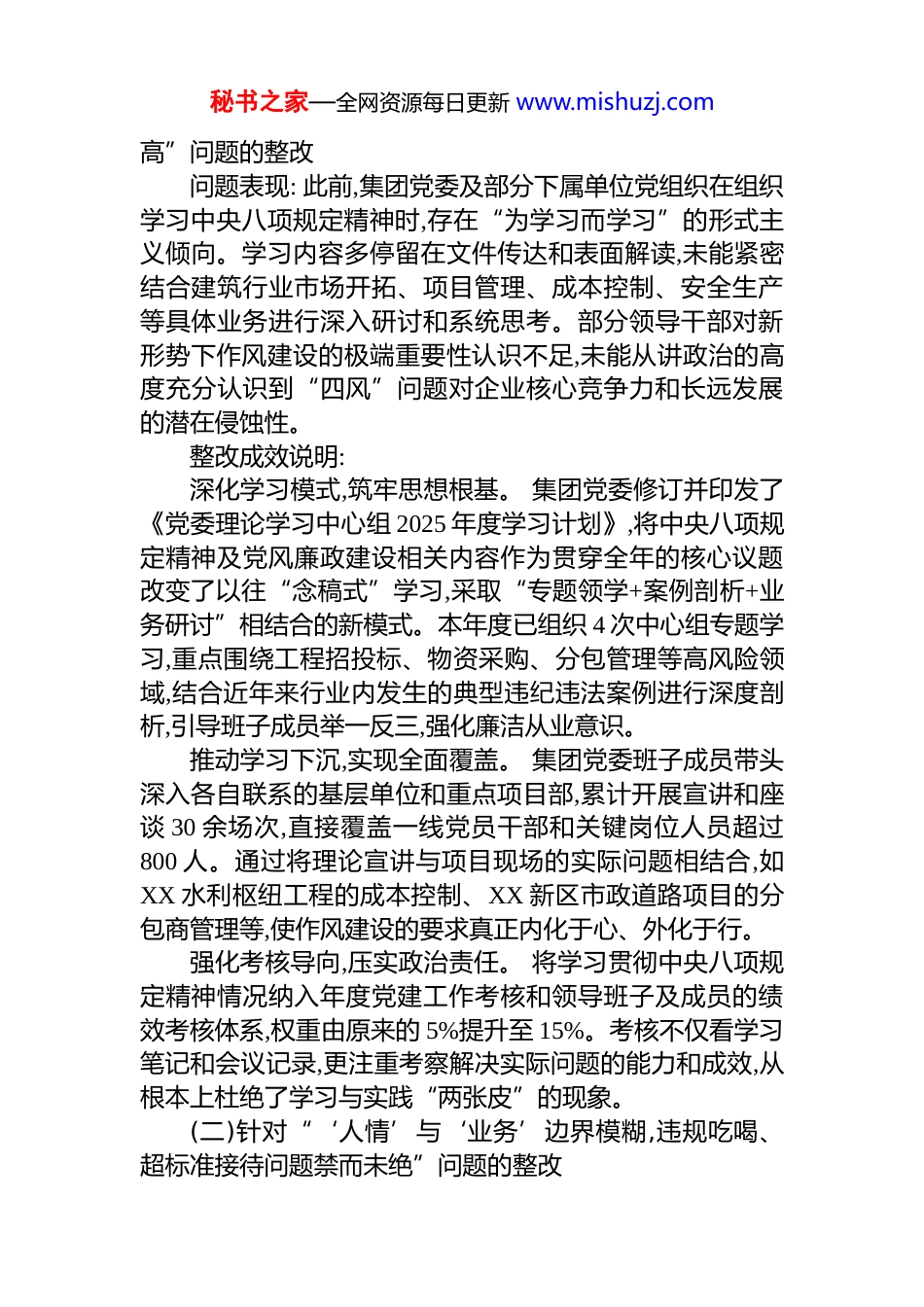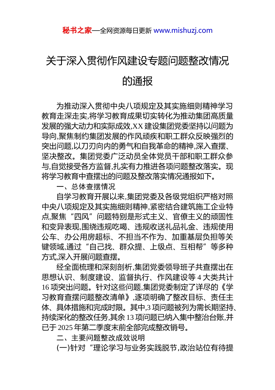 秘书之家—全网资源每日更新 www.mishuzj.com关于深入贯彻作风建设专题问题整改情况的通报为推动深入贯彻中央八项规定及其实施细则精神学习教育走深走实,将学习教育成果切实转化为推动集团高质量发展的强大动力和实际成效,XX 建设集团党委坚持以问题为导向,聚焦制约集团发展的作风顽疾和职工群众反映强烈的突出问题,以刀刃向内的勇气和自我革命的精神,深入查摆、坚决整改。集团党委广泛动员全体党员干部和职工群众参与,自觉接受各方监督,扎实有力推进各项问题整改落实。现将学习教育中查摆出的问题及整改落实情况通报如下。一、总体查摆情况自学习教育开展以来,集团党委及各级党组织严格对照中央八项规定及其实施细则精神,紧密结合建筑施工企业特点,聚焦“四风”问题特别是形式主义、官僚主义的顽固性和变异表现,围绕违规吃喝、违规收送礼品礼金、违规使用公车、办公用房超标、不担当不作为、加重基层负担等关键领域,通过“自己找、群众提、上级点、互相帮”等多种方式,深入开展问题查摆。经全面梳理和深刻剖析,集团党委领导班子共查摆出在思想认识、制度建设、监督执行、作风建设等 4 大类共计16 项突出问题。针对这些问题,集团党委制定了详尽的《学习教育查摆问题整改清单》,逐项明确了整改目标、责任主体、具体措施和完成时限。其中,3 项问题被列为需长期坚持、持续深化的整改任务,其余 13 项问题已纳入集中整治台账,并已于 2025 年第二季度末前全部完成整改销号。二、主要问题整改成效说明(一)针对“理论学习与业务实践脱节,政治站位有待提秘书之家—全网资源每日更新 www.mishuzj.com高”问题的整改问题表现: 此前,集团党委及部分下属单位党组织在组织学习中央八项规定精神时,存在“为学习而学习”的形式主义倾向。学习内容多停留在文件传达和表面解读,未能紧密结合建筑行业市场开拓、项目管理、成本控制、安全生产等具体业务进行深入研讨和系统思考。部分领导干部对新形势下作风建设的极端重要性认识不足,未能从讲政治的高度充分认识到“四风”问题对企业核心竞争力和长远发展的潜在侵蚀性。整改成效说明:深化学习模式,筑牢思想根基。 集团党委修订并印发了《党委理论学习中心组 2025 年度学习计划》,将中央八项规定精神及党风廉政建设相关内容作为贯穿全年的核心议题改变了以往“念稿式”学习,采取“专题领学+案例剖析+业务研讨”相结合的新模式。本年度已组织 4 次中心组专题学习,重点围绕工程招投标、物资采购、分包管理等高风险领域,结合近年来行业内发生的典型违纪违法案例进行深度剖析,引导班子成员举一反三,强化廉洁从业意识。推动学习下沉,实现全面覆盖。 集团党委班子成员带头深入各自联系的基层单位和重点项目部,累计开展宣讲和座谈 30 余场次,直接覆盖一线党员干部和关键岗位人员超过800 人。通过将理论宣讲与项目现场的实际问题相结合,如XX 水利枢纽工程的成本控制、XX 新区市政道路项目的分包商管理等,使作风建设的要求真正内化于心、外化于行。强化考核导向,压实政治责任。 将学习贯彻中央八项规定精神情况纳入年度党建工作考核和领导班子及成员的绩效考核体系,权重由原来的 5%提升至 15%。考核不仅看学习笔记和会议记录,更注重考察解决实际问题的能力和成效,从根本上杜绝了学习与实践“两张皮”的现象。(二)针对“‘人情’与‘业务’边界模糊,违规吃喝、超标准接待问题禁而未绝”问题的整改秘书之家—全网资源每日更新 www.mishuzj.com问题表现: 作为建筑施工企业,对外业务往来频繁。部分单位和个人存在错误认识,认为“酒杯一端,政策放宽”,将业务招待与人情往来混为一谈。存在以项目前期考察、中期协调、竣工验收等名义,安排超标准、超范围的接待活动。个别情况下,还存在将高档烟酒、土特产等费用,通过拆分发票、虚列名目等方式在项目成本中违规列支的“隐形”违规吃喝问题,败坏了风气,增加了企业经营成本。整改成效说明:制定刚性制度,划定明确红线。 集团党委牵头,纪委、财务、审计、办公室等多部门联合制定并下发了《XX 建设集团关于进一步规范业务招待行为的若干规定(试行)》,明确了业务招待的审批流程、陪同人数、费用标...