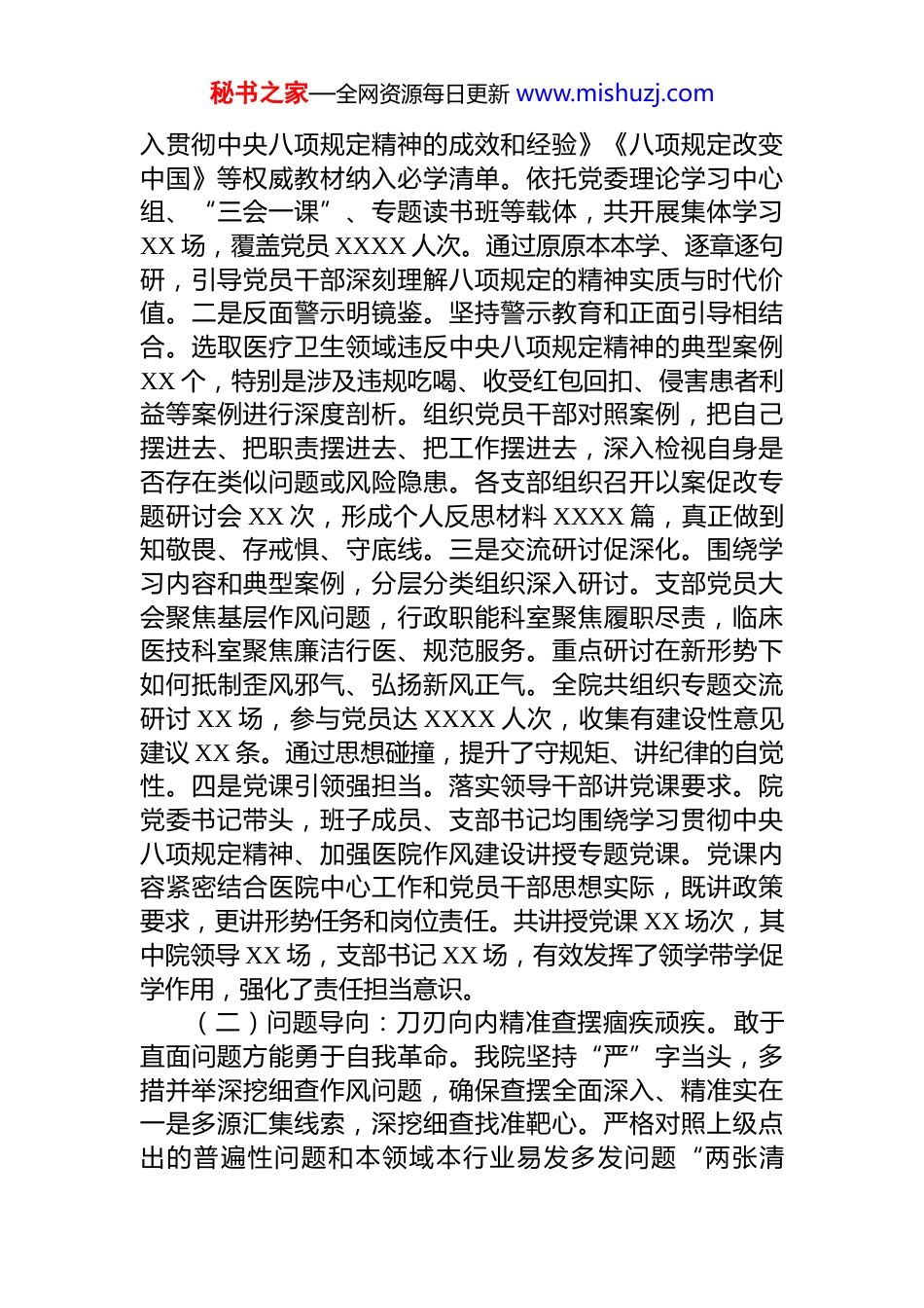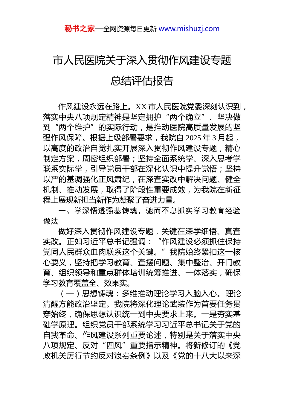 秘书之家—全网资源每日更新 www.mishuzj.com市人民医院关于深入贯彻作风建设专题总结评估报告作风建设永远在路上。XX 市人民医院党委深刻认识到,落实中央八项规定精神是坚定拥护“两个确立”、坚决做到“两个维护”的实际行动,是推动医院高质量发展的坚强作风保障。根据上级部署要求,我院自 2025 年 3 月起,以高度的政治自觉扎实开展深入贯彻作风建设专题,精心制定方案,周密组织部署;坚持全面系统学、深入思考学联系实际学,引导党员干部在深化认识中提升觉悟;坚持以严的基调强化正风肃纪,在深查实改中解决问题、健全机制、推动发展,取得了阶段性重要成效,为我院在新征程上展现新担当新作为凝聚了奋进力量。一、学深悟透强基铸魂,驰而不息抓实学习教育经验做法做好深入贯彻作风建设专题,关键在深学细悟、真查实改。正如习近平总书记强调:“作风建设必须抓住保持党同人民群众血肉联系这个关键。”我院始终紧扣这一核心要义,坚持把学习教育、查摆问题、集中整治、开门教育、组织领导和重点群体培训统筹推进、一体落实,确保学习教育覆盖全、效果实。(一)思想铸魂:多维推动理论学习入脑入心。理论清醒方能政治坚定。我院将深化理论武装作为首要任务贯穿始终,确保思想认识统一到中央要求上来。一是夯实基础学原理。组织党员干部系统学习习近平总书记关于党的自我革命、作风建设系列重要论述,特别是关于落实中央八项规定、反对“四风”重要指示精神。将新修订的《党政机关厉行节约反对浪费条例》以及《党的十八大以来深秘书之家—全网资源每日更新 www.mishuzj.com入贯彻中央八项规定精神的成效和经验》《八项规定改变中国》等权威教材纳入必学清单。依托党委理论学习中心组、“三会一课”、专题读书班等载体,共开展集体学习XX 场,覆盖党员 XXXX 人次。通过原原本本学、逐章逐句研,引导党员干部深刻理解八项规定的精神实质与时代价值。二是反面警示明镜鉴。坚持警示教育和正面引导相结合。选取医疗卫生领域违反中央八项规定精神的典型案例XX 个,特别是涉及违规吃喝、收受红包回扣、侵害患者利益等案例进行深度剖析。组织党员干部对照案例,把自己摆进去、把职责摆进去、把工作摆进去,深入检视自身是否存在类似问题或风险隐患。各支部组织召开以案促改专题研讨会 XX 次,形成个人反思材料 XXXX 篇,真正做到知敬畏、存戒惧、守底线。三是交流研讨促深化。围绕学习内容和典型案例,分层分类组织深入研讨。支部党员大会聚焦基层作风问题,行政职能科室聚焦履职尽责,临床医技科室聚焦廉洁行医、规范服务。重点研讨在新形势下如何抵制歪风邪气、弘扬新风正气。全院共组织专题交流研讨 XX 场,参与党员达 XXXX 人次,收集有建设性意见建议 XX 条。通过思想碰撞,提升了守规矩、讲纪律的自觉性。四是党课引领强担当。落实领导干部讲党课要求。院党委书记带头,班子成员、支部书记均围绕学习贯彻中央八项规定精神、加强医院作风建设讲授专题党课。党课内容紧密结合医院中心工作和党员干部思想实际,既讲政策要求,更讲形势任务和岗位责任。共讲授党课 XX 场次,其中院领导 XX 场,支部书记 XX 场,有效发挥了领学带学促学作用,强化了责任担当意识。(二)问题导向:刀刃向内精准查摆痼疾顽疾。敢于直面问题方能勇于自我革命。我院坚持“严”字当头,多措并举深挖细查作风问题,确保查摆全面深入、精准实在一是多源汇集线索,深挖细查找准靶心。严格对照上级点出的普遍性问题和本领域本行业易发多发问题“两张清秘书之家—全网资源每日更新 www.mishuzj.com单”,贯通运用多种监督手段深挖问题线索。主动接受纪检监察、巡视巡察监督反馈问题 XX 项;全面梳理近三年审计报告、财会监督报告指出的涉及公务接待、采购管理、津补贴发放等问题 XX 项;分析调查研究、患者信访、群众满意度调查中反映突出的作风问题 XX 件次;梳理日常督查发现的“四风”苗头性、倾向性问题 XX 个。累计汇总形成初步问题信息 XX 条,为精准查摆奠定了数据基础。二是严格审核把关,确保清单质量过硬。由院党委牵头,学习教育工作专班具体负责,成立查...