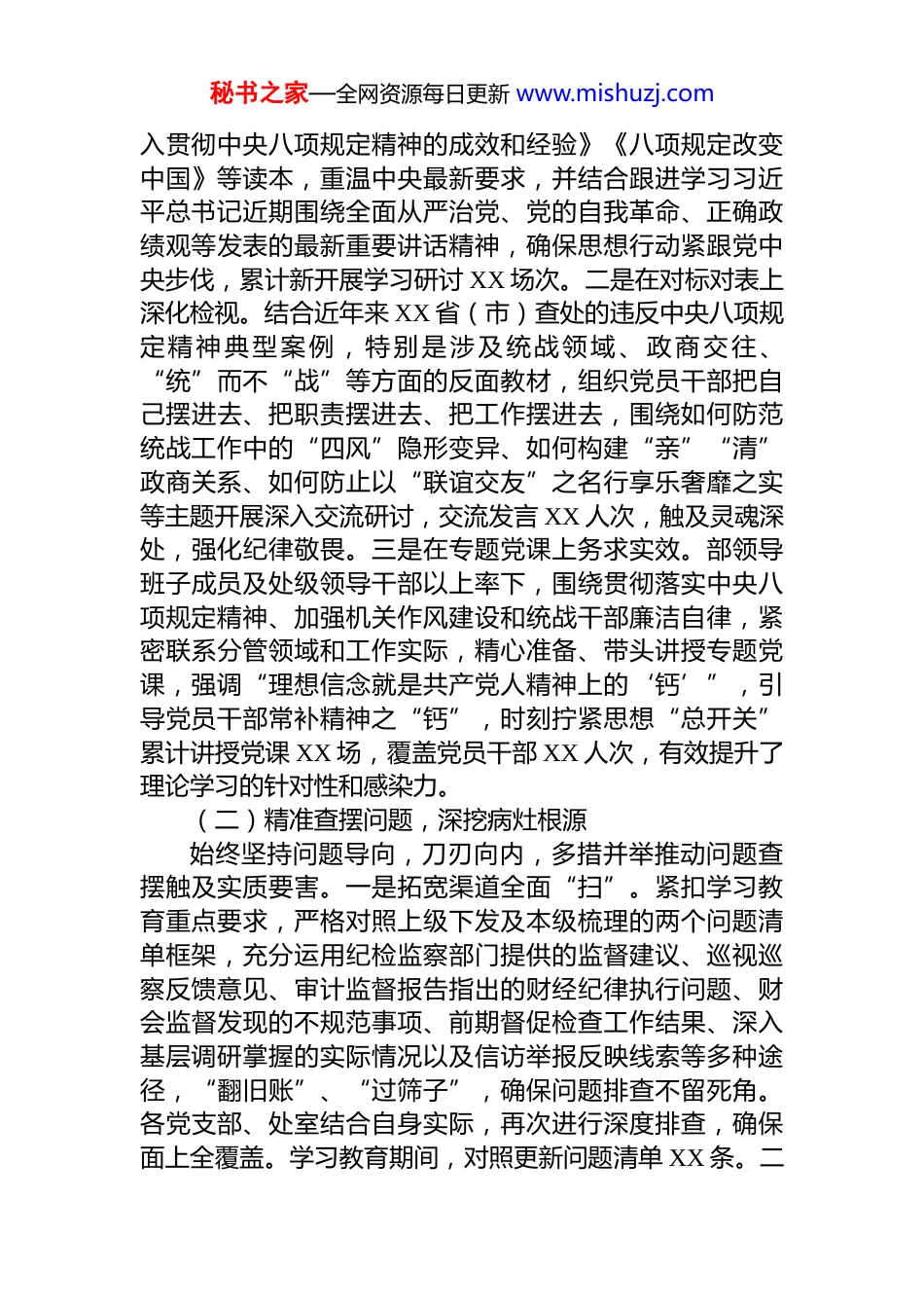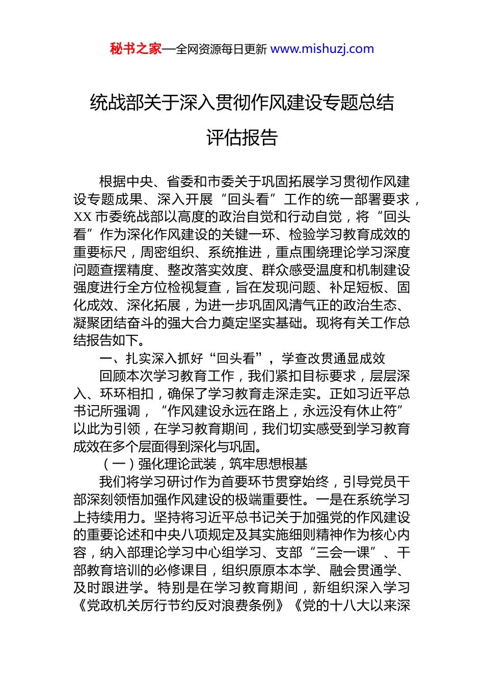 秘书之家—全网资源每日更新 www.mishuzj.com统战部关于深入贯彻作风建设专题总结评估报告根据中央、省委和市委关于巩固拓展学习贯彻作风建设专题成果、深入开展“回头看”工作的统一部署要求,XX 市委统战部以高度的政治自觉和行动自觉,将“回头看”作为深化作风建设的关键一环、检验学习教育成效的重要标尺,周密组织、系统推进,重点围绕理论学习深度问题查摆精度、整改落实效度、群众感受温度和机制建设强度进行全方位检视复查,旨在发现问题、补足短板、固化成效、深化拓展,为进一步巩固风清气正的政治生态、凝聚团结奋斗的强大合力奠定坚实基础。现将有关工作总结报告如下。一、扎实深入抓好“回头看”,学查改贯通显成效回顾本次学习教育工作,我们紧扣目标要求,层层深入、环环相扣,确保了学习教育走深走实。正如习近平总书记所强调,“作风建设永远在路上,永远没有休止符”以此为引领,在学习教育期间,我们切实感受到学习教育成效在多个层面得到深化与巩固。(一)强化理论武装,筑牢思想根基我们将学习研讨作为首要环节贯穿始终,引导党员干部深刻领悟加强作风建设的极端重要性。一是在系统学习上持续用力。坚持将习近平总书记关于加强党的作风建设的重要论述和中央八项规定及其实施细则精神作为核心内容,纳入部理论学习中心组学习、支部“三会一课”、干部教育培训的必修课目,组织原原本本学、融会贯通学、及时跟进学。特别是在学习教育期间,新组织深入学习《党政机关厉行节约反对浪费条例》《党的十八大以来深秘书之家—全网资源每日更新 www.mishuzj.com入贯彻中央八项规定精神的成效和经验》《八项规定改变中国》等读本,重温中央最新要求,并结合跟进学习习近平总书记近期围绕全面从严治党、党的自我革命、正确政绩观等发表的最新重要讲话精神,确保思想行动紧跟党中央步伐,累计新开展学习研讨 XX 场次。二是在对标对表上深化检视。结合近年来 XX 省(市)查处的违反中央八项规定精神典型案例,特别是涉及统战领域、政商交往、“统”而不“战”等方面的反面教材,组织党员干部把自己摆进去、把职责摆进去、把工作摆进去,围绕如何防范统战工作中的“四风”隐形变异、如何构建“亲”“清”政商关系、如何防止以“联谊交友”之名行享乐奢靡之实等主题开展深入交流研讨,交流发言 XX 人次,触及灵魂深处,强化纪律敬畏。三是在专题党课上务求实效。部领导班子成员及处级领导干部以上率下,围绕贯彻落实中央八项规定精神、加强机关作风建设和统战干部廉洁自律,紧密联系分管领域和工作实际,精心准备、带头讲授专题党课,强调“理想信念就是共产党人精神上的‘钙’”,引导党员干部常补精神之“钙”,时刻拧紧思想“总开关”累计讲授党课 XX 场,覆盖党员干部 XX 人次,有效提升了理论学习的针对性和感染力。(二)精准查摆问题,深挖病灶根源始终坚持问题导向,刀刃向内,多措并举推动问题查摆触及实质要害。一是拓宽渠道全面“扫”。紧扣学习教育重点要求,严格对照上级下发及本级梳理的两个问题清单框架,充分运用纪检监察部门提供的监督建议、巡视巡察反馈意见、审计监督报告指出的财经纪律执行问题、财会监督发现的不规范事项、前期督促检查工作结果、深入基层调研掌握的实际情况以及信访举报反映线索等多种途径,“翻旧账”、“过筛子”,确保问题排查不留死角。各党支部、处室结合自身实际,再次进行深度排查,确保面上全覆盖。学习教育期间,对照更新问题清单 XX 条。二秘书之家—全网资源每日更新 www.mishuzj.com是严把质量深层“挖”。建立了部机关党委牵头、学习教育工作专班具体负责、相关业务处室会商的层级审核机制对部内各处室党支部上报的问题清单逐条审核、严格把关重点审核问题是否联系思想工作实际,是否体现了“全、深、准、实”的要求:关注“全”即是否涵盖学习、查摆整改各环节;强调“深”即是否触及思想根源和制度短板要求“准”即是否聚焦突出问题要害;注重“实”即问题是否有具体表现、事例支撑,坚决杜绝避重就轻、泛泛而谈。经多轮审核,确保问题指向精准、画像清晰。三是深化教育反向“促”。将警示教育作为...