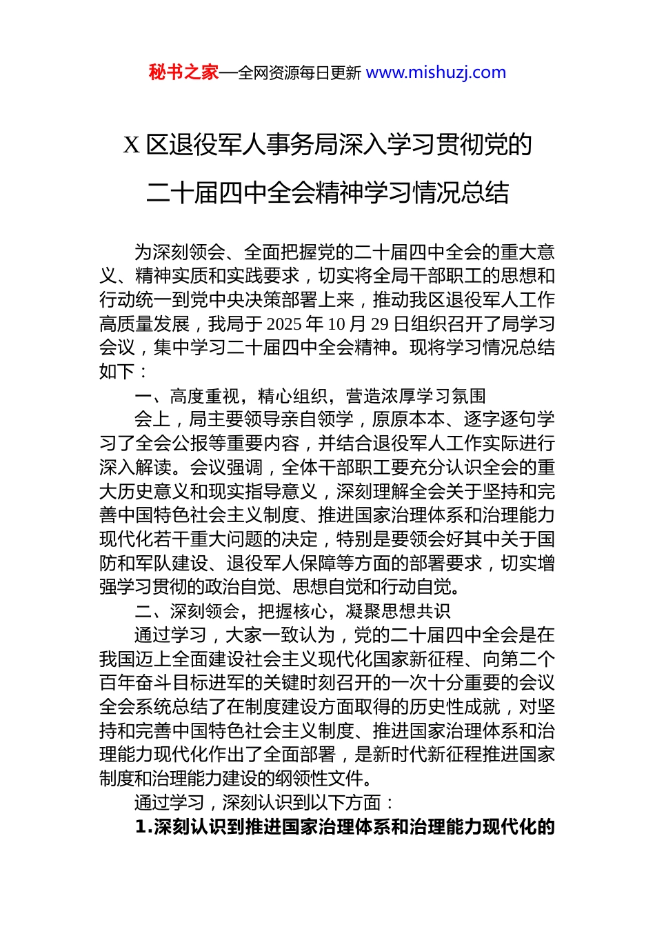 秘书之家—全网资源每日更新 www.mishuzj.comX 区退役军人事务局深入学习贯彻党的二十届四中全会精神学习情况总结为深刻领会、全面把握党的二十届四中全会的重大意义、精神实质和实践要求,切实将全局干部职工的思想和行动统一到党中央决策部署上来,推动我区退役军人工作高质量发展,我局于 2025 年 10 月 29 日组织召开了局学习会议,集中学习二十届四中全会精神。现将学习情况总结如下:一、高度重视,精心组织,营造浓厚学习氛围会上,局主要领导亲自领学,原原本本、逐字逐句学习了全会公报等重要内容,并结合退役军人工作实际进行深入解读。会议强调,全体干部职工要充分认识全会的重大历史意义和现实指导意义,深刻理解全会关于坚持和完善中国特色社会主义制度、推进国家治理体系和治理能力现代化若干重大问题的决定,特别是要领会好其中关于国防和军队建设、退役军人保障等方面的部署要求,切实增强学习贯彻的政治自觉、思想自觉和行动自觉。二、深刻领会,把握核心,凝聚思想共识通过学习,大家一致认为,党的二十届四中全会是在我国迈上全面建设社会主义现代化国家新征程、向第二个百年奋斗目标进军的关键时刻召开的一次十分重要的会议全会系统总结了在制度建设方面取得的历史性成就,对坚持和完善中国特色社会主义制度、推进国家治理体系和治理能力现代化作出了全面部署,是新时代新征程推进国家制度和治理能力建设的纲领性文件。通过学习,深刻认识到以下方面:1.深刻认识到推进国家治理体系和治理能力现代化的秘书之家—全网资源每日更新 www.mishuzj.com极端重要性。要将全会精神融入退役军人工作各方面、全过程,着力固根基、扬优势、补短板、强弱项,构建系统完备、科学规范、运行有效的退役军人工作制度体系。2.深刻认识到全会对退役军人工作提出的新要求。全会精神中蕴含的关于保障军人军属合法权益、巩固发展军政军民团结等重要论述,为我们做好新时代退役军人工作指明了方向、提供了根本遵循。必须紧密结合我区实际,思考如何将制度优势更好地转化为服务保障退役军人的治理效能。三、联系实际,学以致用,谋划工作新篇学习的目的在于应用。我局要求全体干部职工要坚持理论联系实际的马克思主义学风,将学习成果转化为推动工作的强大动力和实际成效。四、巩固成果,持续深化,确保学习实效此次学习是一次深刻的思想洗礼和理论武装。大家纷纷表示,要以此次学习为新的起点,持续深入学习领会二十届四中全会精神,做到学思用贯通、知信行统一。会后将加强督促深入学习,确保学习贯彻工作落到实处、取得实效,真正把学习成果转化为推动我区退役军人工作创新发展的生动实践,为区域经济社会发展和社会和谐稳定贡献力量,为实现强国梦、强军梦作出新的更大贡献。