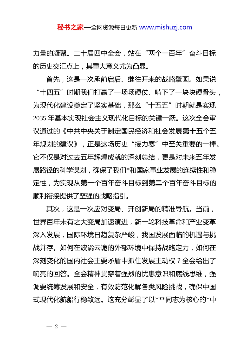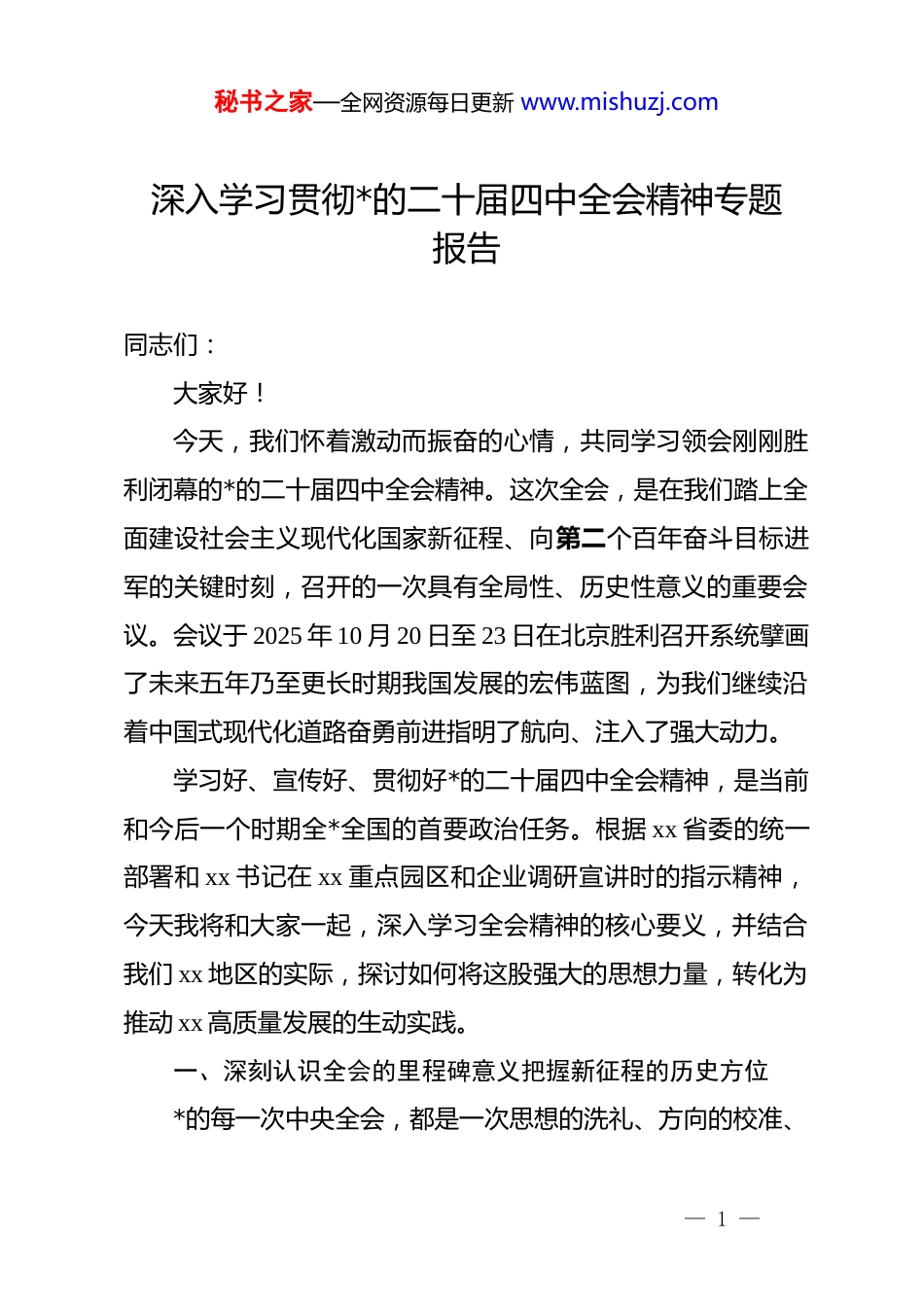 秘书之家—全网资源每日更新 www.mishuzj.com深入学习贯彻*的二十届四中全会精神专题报告同志们:大家好!今天,我们怀着激动而振奋的心情,共同学习领会刚刚胜利闭幕的*的二十届四中全会精神。这次全会,是在我们踏上全面建设社会主义现代化国家新征程、向第二个百年奋斗目标进军的关键时刻,召开的一次具有全局性、历史性意义的重要会议。会议于 2025 年 10 月 20 日至 23 日在北京胜利召开系统擘画了未来五年乃至更长时期我国发展的宏伟蓝图,为我们继续沿着中国式现代化道路奋勇前进指明了航向、注入了强大动力。学习好、宣传好、贯彻好*的二十届四中全会精神,是当前和今后一个时期全*全国的首要政治任务。根据 xx 省委的统一部署和 xx 书记在 xx 重点园区和企业调研宣讲时的指示精神,今天我将和大家一起,深入学习全会精神的核心要义,并结合我们 xx 地区的实际,探讨如何将这股强大的思想力量,转化为推动 xx 高质量发展的生动实践。一、深刻认识全会的里程碑意义把握新征程的历史方位*的每一次中央全会,都是一次思想的洗礼、方向的校准、— 1 —秘书之家—全网资源每日更新 www.mishuzj.com力量的凝聚。二十届四中全会,站在“两个一百年”奋斗目标的历史交汇点上,其重大意义尤为凸显。首先,这是一次承前启后、继往开来的战略擘画。如果说“十四五”时期我们打赢了一场场硬仗、啃下了一块块硬骨头,为现代化建设奠定了坚实基础,那么“十五五”时期就是实现2035 年基本实现社会主义现代化目标的关键一跃。这次全会审议通过的《中共中央关于制定国民经济和社会发展第十五个五年规划的建议》,正是这场历史“接力赛”中至关重要的一棒。它不仅是对过去五年辉煌成就的深刻总结,更是对未来五年发展路径的科学谋划,确保了我们*和国家事业发展的连续性和稳定性,为实现从第一个百年奋斗目标到第二个百年奋斗目标的顺利衔接提供了坚强的战略指引。其次,这是一次应对变局、开创新局的精准导航。当前,世界百年未有之大变局加速演进,新一轮科技革命和产业变革深入发展,国际环境日趋复杂严峻,我国发展面临的机遇与挑战并存。如何在波谲云诡的外部环境中保持战略定力,如何在深刻变化的国内社会主要矛盾中抓住发展主动权?全会给出了响亮的回答。全会精神贯穿着强烈的忧患意识和底线思维,强调要统筹发展和安全,有效防范化解各类风险挑战,确保中国式现代化航船行稳致远。这充分彰显了以***同志为核心的*中— 2 —秘书之家—全网资源每日更新 www.mishuzj.com央高瞻远瞩的战略眼光和驾驭复杂局面的高超智慧。再次,这是一次凝聚共识、鼓舞人心的行动指南。《建议》的形成过程,是一个发扬民主、集思广益的过程,是凝聚全*智慧、承载人民期盼的纲领性文件。它将*的主张、国家意志和人民心声紧密融合在一起,形成了全社会奋进新征程、建功新时代的思想共识和行动合力。学习贯彻全会精神,就是要将思想和行动统一到*中央的决策部署上来,把个人奋斗融入到国家发展的宏伟事业中去,心往一处想、劲往一处使,汇聚起推进中国式现代化的磅礴伟力。二、准确把握全会精神的核心要义以新发展理念统揽全局*的二十届四中全会内容丰富、思想深邃,我们学习领会,关键要抓住其核心要义和精神实质。综合来看,全会精神主要体现在以下几个方面:核心要义之一:坚持以高质量发展为新时代的硬道理发展是解决我国一切问题的基础和关键。全会明确指出,高质量发展是全面建设社会主义现代化国家的首要任务,是“十五五”时期必须牢牢把握的主题主线。与以往不同,这次全会更加突出“质”的提升。在《建议》中,不再简单设定gdp 增长的具体量化指标,而是强调“经济增长保持在合理区间”。这背后是发展理念的深刻变革,意味着我们告别了过去— 3 —秘书之家—全网资源每日更新 www.mishuzj.com那种粗放式的、以速度论英雄的发展模式,转向更加注重内涵式、集约型的高质量发展轨道。全会《建议》破天荒地提出了“三大定量指标”:全要素生产率稳步提升、居民消费率明显提高、经济增长保持在合理区间。这三个指标,如同指挥棒,为高质量发展指明了清晰的路径。“全要...