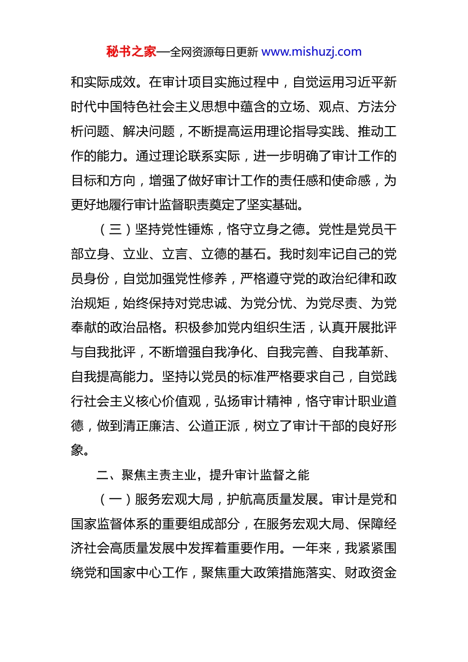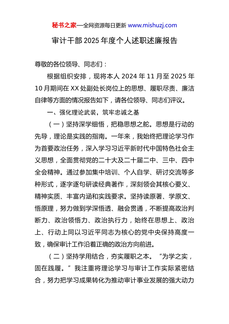 秘书之家—全网资源每日更新 www.mishuzj.com审计干部 2025 年度个人述职述廉报告 尊敬的各位领导、同志们:根据组织安排,现将本人 2024 年 11 月至 2025 年10 月期间在 XX 处副处长岗位上的思想、履职尽责、廉洁自律等方面的情况报告如下,请各位领导、同志们评议。一、强化理论武装,筑牢忠诚之基(一)坚持深学细悟,把稳思想之舵。思想是行动的先导,理论是实践的指南。一年来,我始终把理论学习作为首要政治任务,深入学习习近平新时代中国特色社会主义思想,全面贯彻党的二十大及二十届二中、三中、四中全会精神。通过参加集中培训、个人自学、研讨交流等多种形式,逐字逐句研读经典著作,深刻领会其核心要义、精神实质、丰富内涵和实践要求。坚持读原著、学原文、悟原理,努力做到学深悟透、融会贯通,不断提高政治判断力、政治领悟力、政治执行力,始终在思想上、政治上、行动上同以习近平同志为核心的党中央保持高度一致,确保审计工作沿着正确的政治方向前进。(二)坚持学用结合,夯实履职之本。“为学之实,固在践履。”我注重将理论学习与审计工作实际紧密结合,努力把学习成果转化为推动审计事业发展的强大动力秘书之家—全网资源每日更新 www.mishuzj.com和实际成效。在审计项目实施过程中,自觉运用习近平新时代中国特色社会主义思想中蕴含的立场、观点、方法分析问题、解决问题,不断提高运用理论指导实践、推动工作的能力。通过理论联系实际,进一步明确了审计工作的目标和方向,增强了做好审计工作的责任感和使命感,为更好地履行审计监督职责奠定了坚实基础。(三)坚持党性锤炼,恪守立身之德。党性是党员干部立身、立业、立言、立德的基石。我时刻牢记自己的党员身份,自觉加强党性修养,严格遵守党的政治纪律和政治规矩,始终保持对党忠诚、为党分忧、为党尽责、为党奉献的政治品格。积极参加党内组织生活,认真开展批评与自我批评,不断增强自我净化、自我完善、自我革新、自我提高能力。坚持以党员的标准严格要求自己,自觉践行社会主义核心价值观,弘扬审计精神,恪守审计职业道德,做到清正廉洁、公道正派,树立了审计干部的良好形象。二、聚焦主责主业,提升审计监督之能(一)服务宏观大局,护航高质量发展。审计是党和国家监督体系的重要组成部分,在服务宏观大局、保障经济社会高质量发展中发挥着重要作用。一年来,我紧紧围绕党和国家中心工作,聚焦重大政策措施落实、财政资金秘书之家—全网资源每日更新 www.mishuzj.com使用绩效、重大项目建设等重点领域,精心组织实施审计项目。通过审计,及时发现和揭示经济社会运行中的突出问题和风险隐患,提出针对性的审计建议,为党委政府科学决策提供参考依据,有力推动了各项政策措施落地见效,促进了经济社会持续健康发展。(二)坚持科技强审,创新审计方式方法。随着信息技术的快速发展和审计工作的不断深入,传统的审计方式方法已难以满足新时代审计工作的需要。我积极适应科技发展趋势,大力推进科技强审战略,加强审计信息化建设。一方面,组织审计人员学习掌握大数据审计技术和方法,提高运用信息化手段开展审计工作的能力;另一方面,积极探索创新审计方式方法,充分运用数据分析、人工智能等技术手段,对海量数据进行深度挖掘和分析,提高审计工作的效率和精准度。通过科技强审,实现了审计工作从传统的手工审计向数字化、智能化审计的转变,为审计事业发展注入了新的活力。(三)突出民生关切,践行审计为民理念。民生无小事,枝叶总关情。我始终把维护人民群众的根本利益作为审计工作的出发点和落脚点,高度关注民生领域的热点难点问题,加大对教育、医疗、就业、社会保障等民生资金和项目的审计监督力度。通过审计,切实保障了民生资金秘书之家—全网资源每日更新 www.mishuzj.com的安全有效使用,促进了民生政策的落实落地,维护了人民群众的合法权益。同时,积极回应社会关切,及时向社会公布审计结果,接受社会监督,增强了审计工作的公信力和透明度。三、恪守勤勉尽责,淬炼务实担当之风(一)真抓实干不务虚功。“道虽迩,不行不至;事虽小,不为不成。”在工作中,...