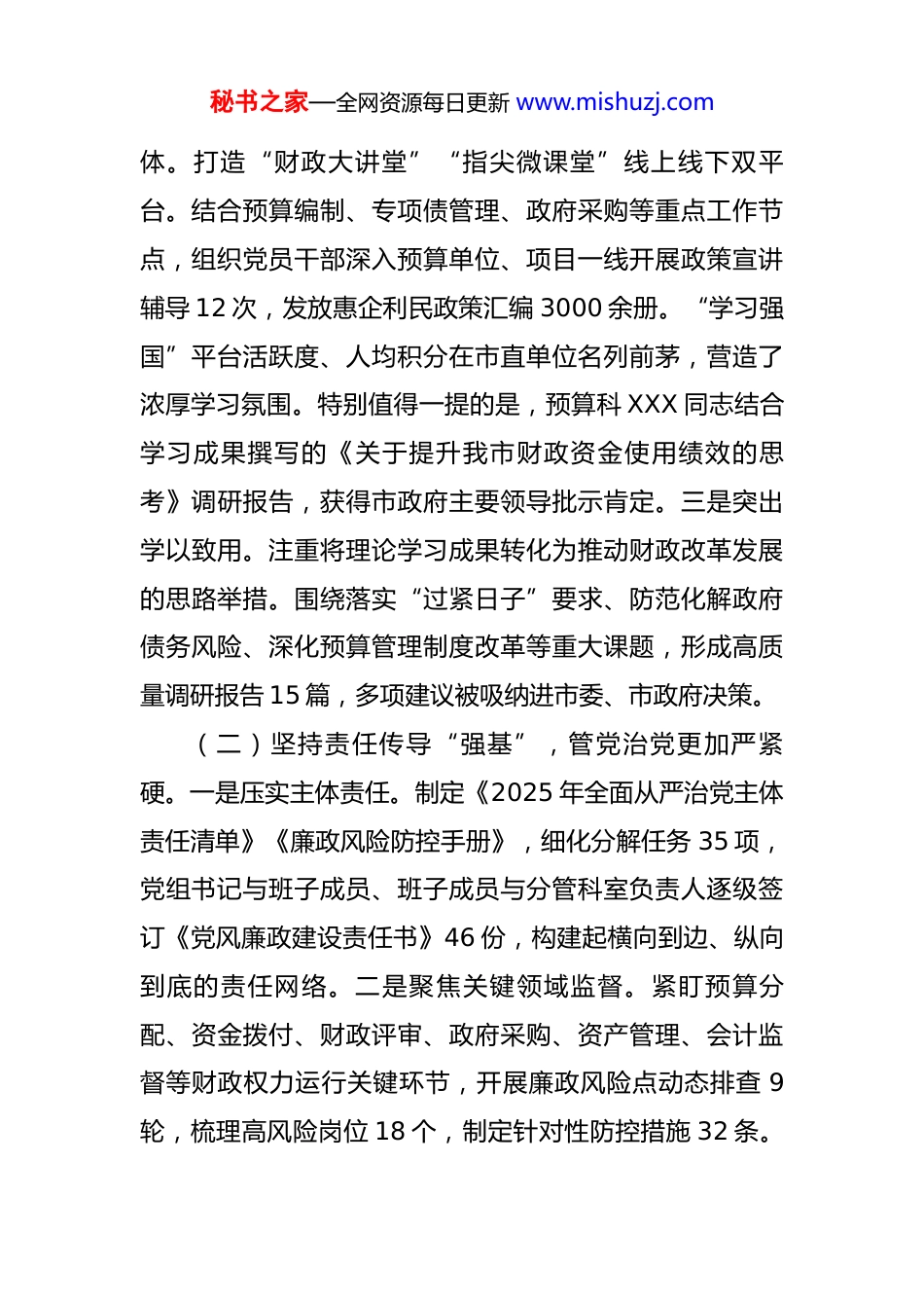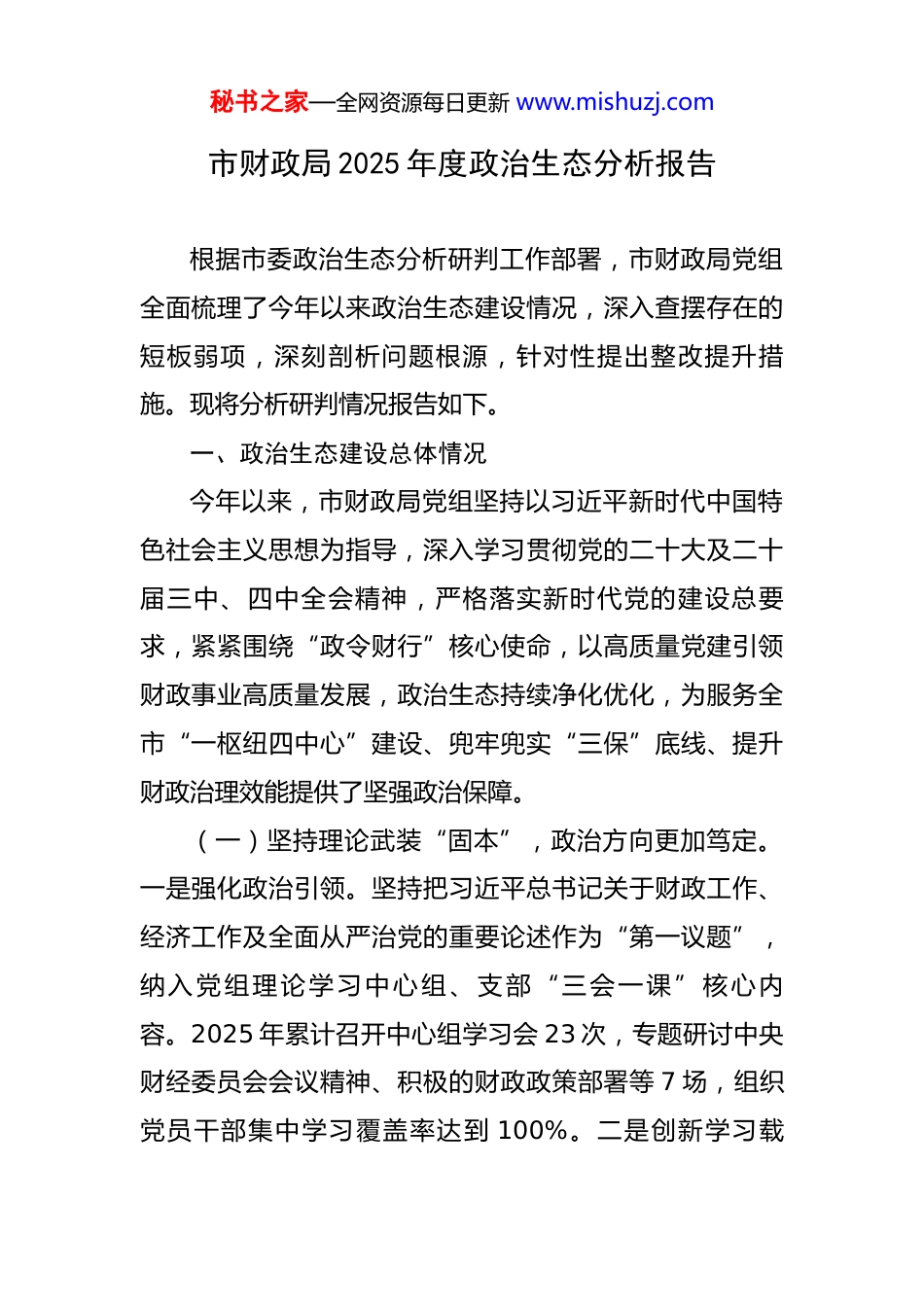 秘书之家—全网资源每日更新 www.mishuzj.com市财政局 2025 年度政治生态分析报告 根据市委政治生态分析研判工作部署,市财政局党组全面梳理了今年以来政治生态建设情况,深入查摆存在的短板弱项,深刻剖析问题根源,针对性提出整改提升措施。现将分析研判情况报告如下。一、政治生态建设总体情况今年以来,市财政局党组坚持以习近平新时代中国特色社会主义思想为指导,深入学习贯彻党的二十大及二十届三中、四中全会精神,严格落实新时代党的建设总要求,紧紧围绕“政令财行”核心使命,以高质量党建引领财政事业高质量发展,政治生态持续净化优化,为服务全市“一枢纽四中心”建设、兜牢兜实“三保”底线、提升财政治理效能提供了坚强政治保障。(一)坚持理论武装“固本”,政治方向更加笃定。一是强化政治引领。坚持把习近平总书记关于财政工作、经济工作及全面从严治党的重要论述作为“第一议题”,纳入党组理论学习中心组、支部“三会一课”核心内容。2025 年累计召开中心组学习会 23 次,专题研讨中央财经委员会会议精神、积极的财政政策部署等 7 场,组织党员干部集中学习覆盖率达到 100%。二是创新学习载秘书之家—全网资源每日更新 www.mishuzj.com体。打造“财政大讲堂”“指尖微课堂”线上线下双平台。结合预算编制、专项债管理、政府采购等重点工作节点,组织党员干部深入预算单位、项目一线开展政策宣讲辅导 12 次,发放惠企利民政策汇编 3000 余册。“学习强国”平台活跃度、人均积分在市直单位名列前茅,营造了浓厚学习氛围。特别值得一提的是,预算科 XXX 同志结合学习成果撰写的《关于提升我市财政资金使用绩效的思考》调研报告,获得市政府主要领导批示肯定。三是突出学以致用。注重将理论学习成果转化为推动财政改革发展的思路举措。围绕落实“过紧日子”要求、防范化解政府债务风险、深化预算管理制度改革等重大课题,形成高质量调研报告 15 篇,多项建议被吸纳进市委、市政府决策。(二)坚持责任传导“强基”,管党治党更加严紧硬。一是压实主体责任。制定《2025 年全面从严治党主体责任清单》《廉政风险防控手册》,细化分解任务 35 项,党组书记与班子成员、班子成员与分管科室负责人逐级签订《党风廉政建设责任书》46 份,构建起横向到边、纵向到底的责任网络。二是聚焦关键领域监督。紧盯预算分配、资金拨付、财政评审、政府采购、资产管理、会计监督等财政权力运行关键环节,开展廉政风险点动态排查 9轮,梳理高风险岗位 18 个,制定针对性防控措施 32 条。秘书之家—全网资源每日更新 www.mishuzj.com创新推行“财政监督员”制度,在重大财政政策落实、重点项目资金监管等环节嵌入监督力量,2025 年对“胡子工程”攻坚资金、民生实事项目资金等开展专项监督 8 次,发现并督促整改问题隐患 10 个。三是筑牢思想防线。深化警示教育,组织观看财政领域违纪违法案例警示教育片 3场,开展“以案促改”专题组织生活会。邀请市纪委领导作廉政辅导报告,运用财政系统内外典型案例开展“用身边事教育身边人”活动,干部职工廉洁自律意识和拒腐防变能力显著增强。(三)坚持队伍建设“赋能”,担当作为更加有力。一是优化队伍结构。坚持“事业为上、人岗相适”原则,2025 年通过竞争性选拔、岗位交流等方式,调整充实中层骨干 8 名。选派 6 名年轻干部参加省市财政业务骨干培训,3 名干部到县区财政部门挂职锻炼,选派 2 名干部参与市重大重点项目服务保障专班,在实践中培养复合型人才。二是激发干事动能。在落实大规模减税降费、组织财政收入、保障重大战略支出、防范化解债务风险等急难险重任务中,设立“党员先锋岗”18 个,组建“攻坚突击队”5 支。党员干部带头加班加点,全力保障资金精准高效直达基层、惠企利民,2025 年全市一般公共预算收入实现平稳增长,重点支出保障有力,多项财政管理工作获省财秘书之家—全网资源每日更新 www.mishuzj.com政厅通报表扬。三是树立先进标杆。全年共有 9 人次获市级以上表彰,国库支付中心被评为“全市优化营商环境先进集体”,1 名干部荣获“我市五一劳动奖章”...