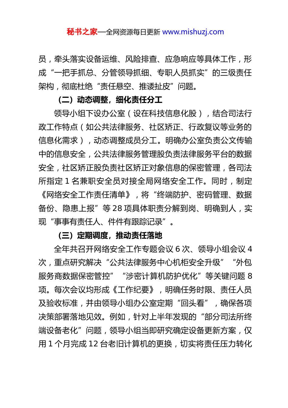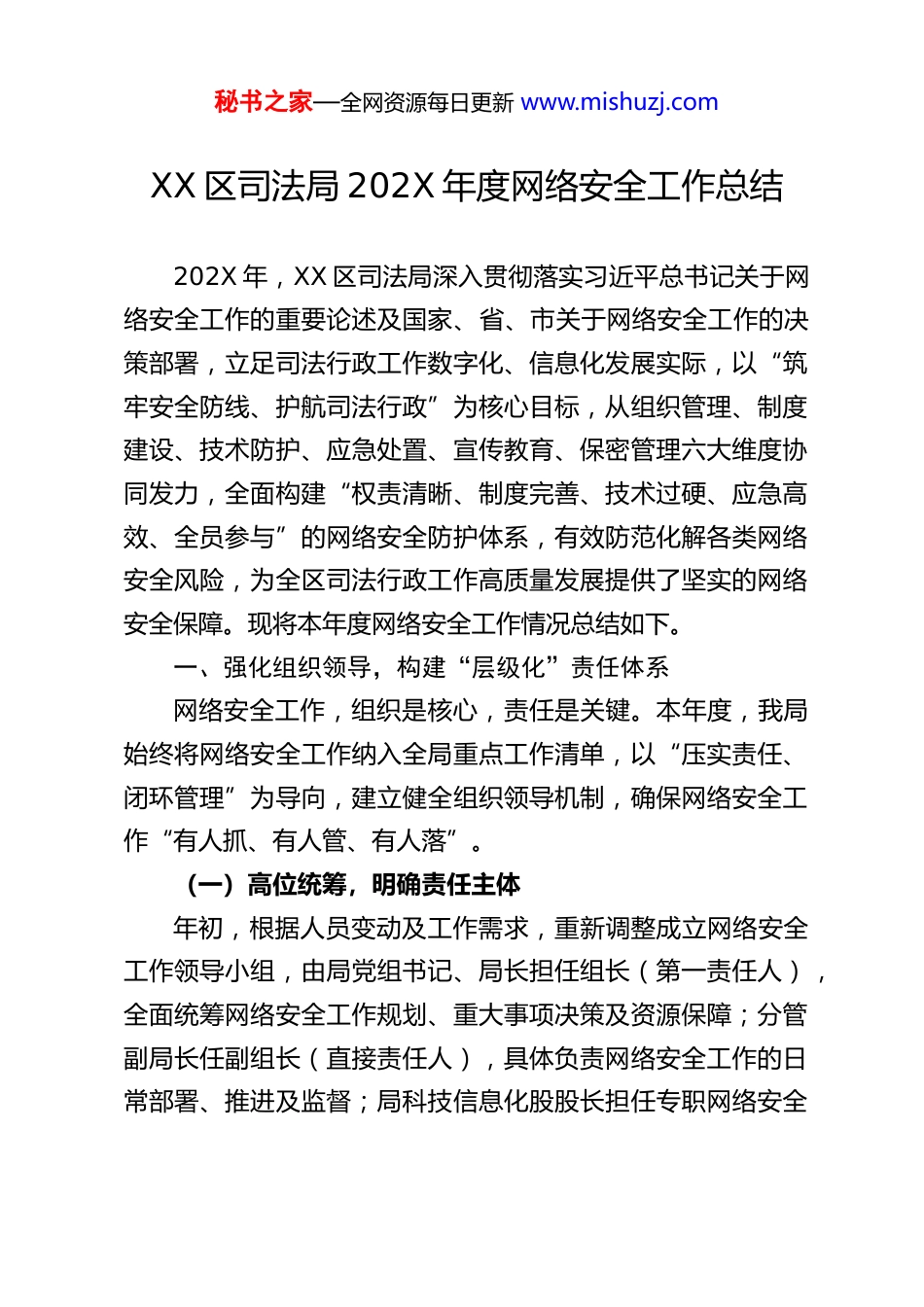 秘书之家—全网资源每日更新 www.mishuzj.comXX 区司法局 202X 年度网络安全工作总结202X 年,XX 区司法局深入贯彻落实习近平总书记关于网络安全工作的重要论述及国家、省、市关于网络安全工作的决策部署,立足司法行政工作数字化、信息化发展实际,以“筑牢安全防线、护航司法行政”为核心目标,从组织管理、制度建设、技术防护、应急处置、宣传教育、保密管理六大维度协同发力,全面构建“权责清晰、制度完善、技术过硬、应急高效、全员参与”的网络安全防护体系,有效防范化解各类网络安全风险,为全区司法行政工作高质量发展提供了坚实的网络安全保障。现将本年度网络安全工作情况总结如下。一、强化组织领导,构建“层级化”责任体系网络安全工作,组织是核心,责任是关键。本年度,我局始终将网络安全工作纳入全局重点工作清单,以“压实责任、闭环管理”为导向,建立健全组织领导机制,确保网络安全工作“有人抓、有人管、有人落”。(一)高位统筹,明确责任主体年初,根据人员变动及工作需求,重新调整成立网络安全工作领导小组,由局党组书记、局长担任组长(第一责任人),全面统筹网络安全工作规划、重大事项决策及资源保障;分管副局长任副组长(直接责任人),具体负责网络安全工作的日常部署、推进及监督;局科技信息化股股长担任专职网络安全秘书之家—全网资源每日更新 www.mishuzj.com员,牵头落实设备运维、风险排查、应急响应等具体工作,形成“一把手抓总、分管领导抓细、专职人员抓实”的三级责任架构,彻底杜绝“责任悬空、推诿扯皮”问题。(二)动态调整,细化责任分工领导小组下设办公室(设在科技信息化股),结合司法行政工作特点(如公共法律服务、社区矫正、行政复议等业务的信息化需求),动态调整成员分工。明确办公室负责公文传输中的信息安全,公共法律服务管理股负责法律服务平台的数据安全,社区矫正股负责社区矫正对象信息的保密管理,各司法所指定 1 名兼职安全员对接全局网络安全工作。同时,制定《网络安全工作责任清单》,将“终端防护、密码管理、数据备份、隐患上报”等 28 项具体职责分解到岗、明确到人,实现“事事有责任人、件件有跟踪记录”。(三)定期调度,推动责任落地全年共召开网络安全工作专题会议 6 次、领导小组会议 4次,重点研究解决“公共法律服务中心机柜安全升级”“外包服务商数据保密管控”“涉密计算机防护优化”等关键问题 8项。每次会议均形成《工作纪要》,明确任务时限、责任人员及验收标准,并由领导小组办公室定期“回头看”,确保各项决策部署落地见效。例如,针对上半年发现的“部分司法所终端设备老化”问题,领导小组当即研究确定设备更新方案,仅用 1 个月完成 12 台老旧计算机的更换,切实将责任压力转化秘书之家—全网资源每日更新 www.mishuzj.com为工作实效。二、完善制度保障,筑牢“长效化”管理根基“无规矩不成方圆”,网络安全工作的有序推进,离不开系统完善的制度支撑。本年度,我局以“查漏补缺、系统优化”为原则,在原有制度基础上进一步健全制度体系,实现“用制度管权、用制度管事、用制度管人”。(一)补全制度漏洞,构建“全覆盖”制度框架在已执行《XX 区司法局网络安全管理制度》《网络安全人员管理制度》《网络安全管理员职责》《网络安全报告制度》4项基础制度的前提下,新增两项核心制度。一是制定《XX 区司法局网络安全责任制实施办法》,进一步细化党组、科室、司法所及个人的网络安全责任,明确“未履行责任的追责情形”,让责任边界更清晰;二是出台《XX 区司法局网络安全责任制检查考核制度》,将网络安全工作纳入科室、个人年度绩效考核,考核结果与评优评先、绩效奖金直接挂钩,倒逼责任落实。截至目前,全局已形成“6 项核心制度+N 项操作细则”的制度体系,覆盖网络安全“责任、管理、考核、应急、保密”全流程。(二)严格制度执行,强化“全链条”风险管控重点岗位保密管理。针对科技信息化股、社区矫正股、行政复议与应诉股等接触敏感信息的岗位,组织 18 名工作人员签订《网络安全保密承诺书》,明确“不得违规传输敏感数据、秘书之...