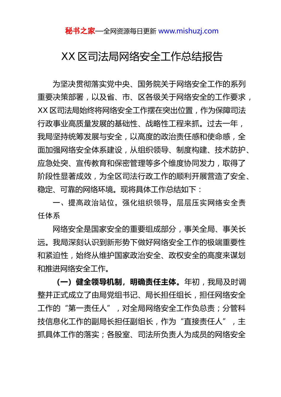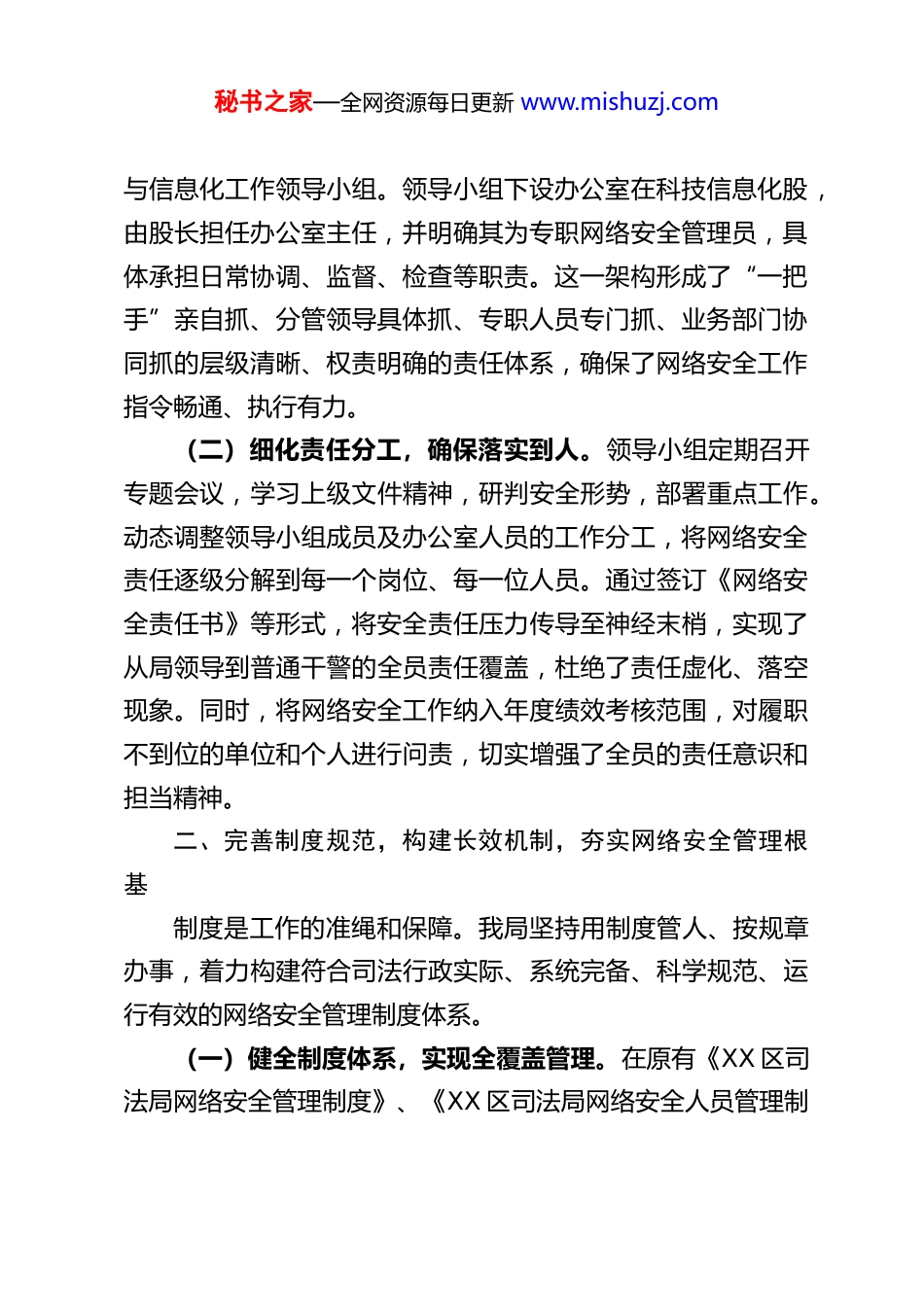 秘书之家—全网资源每日更新 www.mishuzj.comXX 区司法局网络安全工作总结报告为坚决贯彻落实党中央、国务院关于网络安全工作的系列重要决策部署,以及省、市、区各级关于网络安全的工作要求,XX 区司法局始终将网络安全工作摆在突出位置,作为保障司法行政事业高质量发展的基础性、战略性工程来抓。过去一年,我局坚持统筹发展与安全,以高度的政治责任感和使命感,全面加强网络安全体系建设,从组织领导、制度构建、技术防护、应急处突、宣传教育和保密管理等多个维度协同发力,取得了阶段性显著成效,为全区司法行政工作的顺利开展营造了安全、稳定、可靠的网络环境。现将具体工作总结如下:一、提高政治站位,强化组织领导,层层压实网络安全责任体系网络安全是国家安全的重要组成部分,事关全局、事关长远。我局深刻认识到新形势下做好网络安全工作的极端重要性和紧迫性,始终从维护国家政治安全、政权安全的高度来谋划和推进网络安全工作。(一)健全领导机制,明确责任主体。年初,我局及时调整并正式成立了由局党组书记、局长担任组长,担任网络安全工作的“第一责任人”,对全局网络安全工作负总责;分管科技信息化工作的副局长担任副组长,作为“直接责任人”,主抓具体工作的落实;各股室、司法所负责人为成员的网络安全秘书之家—全网资源每日更新 www.mishuzj.com与信息化工作领导小组。领导小组下设办公室在科技信息化股,由股长担任办公室主任,并明确其为专职网络安全管理员,具体承担日常协调、监督、检查等职责。这一架构形成了“一把手”亲自抓、分管领导具体抓、专职人员专门抓、业务部门协同抓的层级清晰、权责明确的责任体系,确保了网络安全工作指令畅通、执行有力。(二)细化责任分工,确保落实到人。领导小组定期召开专题会议,学习上级文件精神,研判安全形势,部署重点工作。动态调整领导小组成员及办公室人员的工作分工,将网络安全责任逐级分解到每一个岗位、每一位人员。通过签订《网络安全责任书》等形式,将安全责任压力传导至神经末梢,实现了从局领导到普通干警的全员责任覆盖,杜绝了责任虚化、落空现象。同时,将网络安全工作纳入年度绩效考核范围,对履职不到位的单位和个人进行问责,切实增强了全员的责任意识和担当精神。二、完善制度规范,构建长效机制,夯实网络安全管理根基制度是工作的准绳和保障。我局坚持用制度管人、按规章办事,着力构建符合司法行政实际、系统完备、科学规范、运行有效的网络安全管理制度体系。(一)健全制度体系,实现全覆盖管理。在原有《XX 区司法局网络安全管理制度》、《XX 区司法局网络安全人员管理制秘书之家—全网资源每日更新 www.mishuzj.com度》、《XX 区司法局网络安全管理员职责》、《XX 区司法局网络安全报告制度》等基础性制度的基础上,结合新要求、新情况,重点制定并实施了《XX 区司法局网络安全责任制实施办法》,细化了从局领导到各岗位的网络安全责任清单;制定了《XX 区司法局网络安全责任制检查考核制度》,明确了检查内容、考核标准及结果运用,使责任落实可量化、可考核。这一系列制度的出台,使我局的网络安全管理工作实现了有章可循、有据可依。(二)强化关键环节管控,堵塞管理漏洞。针对重点岗位人员(如涉密岗位、系统管理员等),严格执行岗前安全审查和定期背景核查,并全员签订《安全保密承诺书》,明确保密义务和法律责任。加强设备全生命周期管理,建立了详细的《设备维修维护台账》,对计算机、服务器等设备的采购、配发、使用、维修、报废等环节进行登记和管控,特别是对外出维修设备,严格执行数据备份和清除流程。在第三方服务管理方面,对所有提供技术支撑、运维服务的外包商,均在合同中明确其安全责任和义务,并签订专门的《数据安全保密协议》,建立外包服务商安全评估和准入机制,严控第三方引入的安全风险。(三)规范日常运维,提升管理效能。严格执行终端安全防护规定,实行统一的软件正版化管理和分发策略,杜绝私自安装无关软件。部署并更新专业防病毒软件,强制所有接入局秘书之家—全网资源每日更新 www.mishuzj.com域网的终端设备安装运行,...