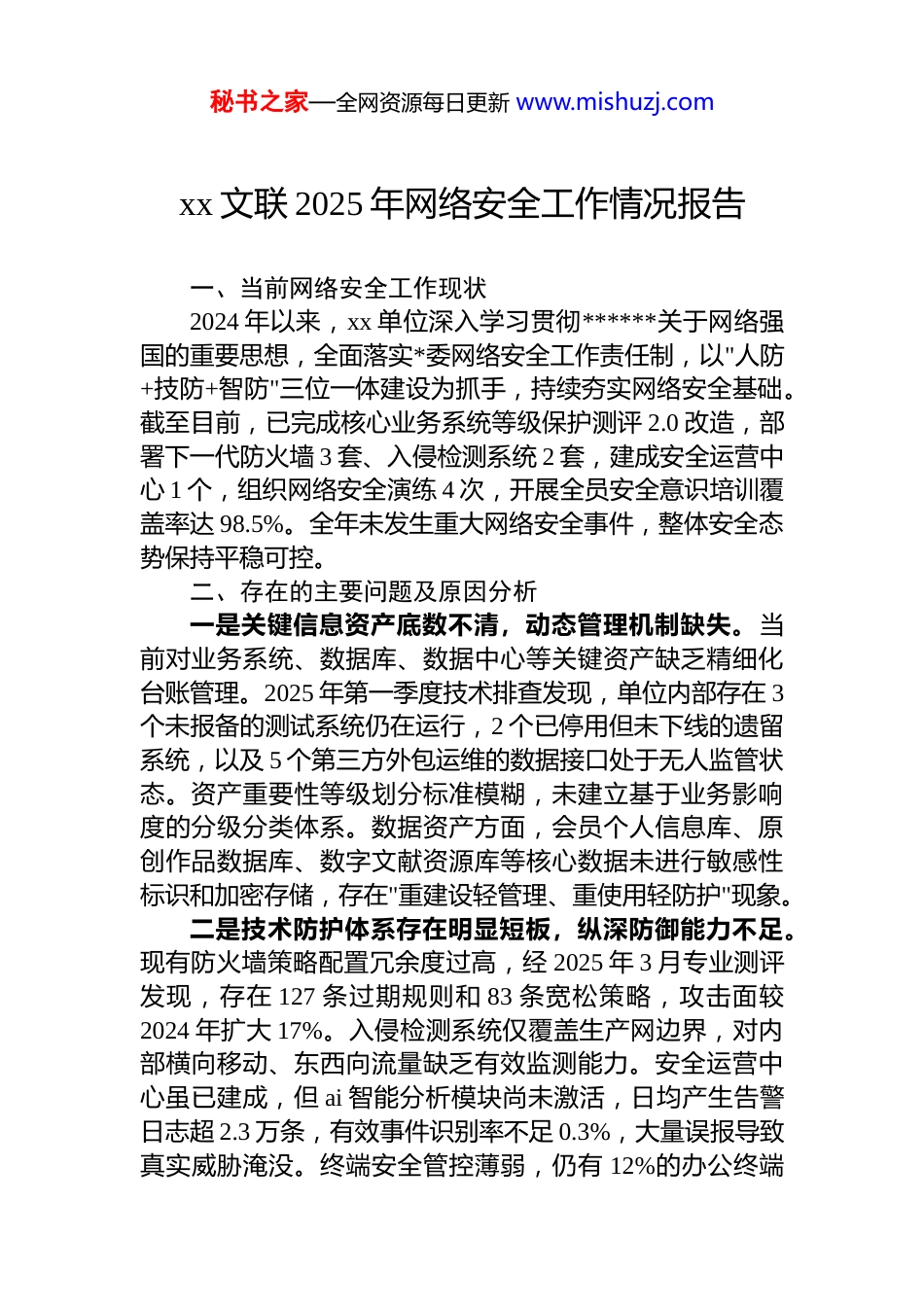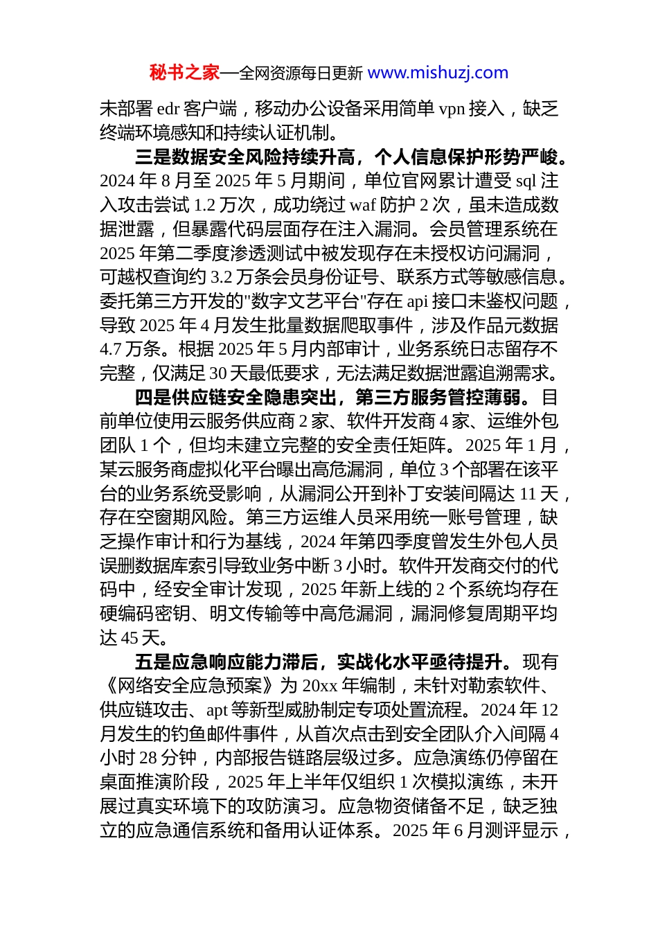 秘书之家—全网资源每日更新 www.mishuzj.comxx 文联 2025 年网络安全工作情况报告一、当前网络安全工作现状2024 年以来,xx 单位深入学习贯彻******关于网络强国的重要思想,全面落实*委网络安全工作责任制,以"人防+技防+智防"三位一体建设为抓手,持续夯实网络安全基础。截至目前,已完成核心业务系统等级保护测评 2.0 改造,部署下一代防火墙 3 套、入侵检测系统 2 套,建成安全运营中心 1 个,组织网络安全演练 4 次,开展全员安全意识培训覆盖率达 98.5%。全年未发生重大网络安全事件,整体安全态势保持平稳可控。二、存在的主要问题及原因分析一是关键信息资产底数不清,动态管理机制缺失。当前对业务系统、数据库、数据中心等关键资产缺乏精细化台账管理。2025 年第一季度技术排查发现,单位内部存在 3个未报备的测试系统仍在运行,2 个已停用但未下线的遗留系统,以及 5 个第三方外包运维的数据接口处于无人监管状态。资产重要性等级划分标准模糊,未建立基于业务影响度的分级分类体系。数据资产方面,会员个人信息库、原创作品数据库、数字文献资源库等核心数据未进行敏感性标识和加密存储,存在"重建设轻管理、重使用轻防护"现象。二是技术防护体系存在明显短板,纵深防御能力不足。现有防火墙策略配置冗余度过高,经 2025 年 3 月专业测评发现,存在 127 条过期规则和 83 条宽松策略,攻击面较2024 年扩大 17%。入侵检测系统仅覆盖生产网边界,对内部横向移动、东西向流量缺乏有效监测能力。安全运营中心虽已建成,但 ai 智能分析模块尚未激活,日均产生告警日志超 2.3 万条,有效事件识别率不足 0.3%,大量误报导致真实威胁淹没。终端安全管控薄弱,仍有 12%的办公终端秘书之家—全网资源每日更新 www.mishuzj.com未部署 edr 客户端,移动办公设备采用简单 vpn 接入,缺乏终端环境感知和持续认证机制。三是数据安全风险持续升高,个人信息保护形势严峻。2024 年 8 月至 2025 年 5 月期间,单位官网累计遭受 sql 注入攻击尝试 1.2 万次,成功绕过 waf 防护 2 次,虽未造成数据泄露,但暴露代码层面存在注入漏洞。会员管理系统在2025 年第二季度渗透测试中被发现存在未授权访问漏洞,可越权查询约 3.2 万条会员身份证号、联系方式等敏感信息。委托第三方开发的"数字文艺平台"存在 api 接口未鉴权问题,导致 2025 年 4 月发生批量数据爬取事件,涉及作品元数据4.7 万条。根据 2025 年 5 月内部审计,业务系统日志留存不完整,仅满足 30 天最低要求,无法满足数据泄露追溯需求。四是供应链安全隐患突出,第三方服务管控薄弱。目前单位使用云服务供应商 2 家、软件开发商 4 家、运维外包团队 1 个,但均未建立完整的安全责任矩阵。2025 年 1 月,某云服务商虚拟化平台曝出高危漏洞,单位 3 个部署在该平台的业务系统受影响,从漏洞公开到补丁安装间隔达 11 天,存在空窗期风险。第三方运维人员采用统一账号管理,缺乏操作审计和行为基线,2024 年第四季度曾发生外包人员误删数据库索引导致业务中断 3 小时。软件开发商交付的代码中,经安全审计发现,2025 年新上线的 2 个系统均存在硬编码密钥、明文传输等中高危漏洞,漏洞修复周期平均达 45 天。五是应急响应能力滞后,实战化水平亟待提升。现有《网络安全应急预案》为 20xx 年编制,未针对勒索软件、供应链攻击、apt 等新型威胁制定专项处置流程。2024 年 12月发生的钓鱼邮件事件,从首次点击到安全团队介入间隔 4小时 28 分钟,内部报告链路层级过多。应急演练仍停留在桌面推演阶段,2025 年上半年仅组织 1 次模拟演练,未开展过真实环境下的攻防演习。应急物资储备不足,缺乏独立的应急通信系统和备用认证体系。2025 年 6 月测评显示,秘书之家—全网资源每日更新 www.mishuzj.com关键业务系统 rto 目标与实际恢复能力差距达 6 小时,rpo 差距达 4 小时,无法满足关键业务连续性要求。六是人防体系存在薄弱环节,安全意识与技能不匹配。2025 年全员安全知识测评平均分仅为 67 分,较 2024...