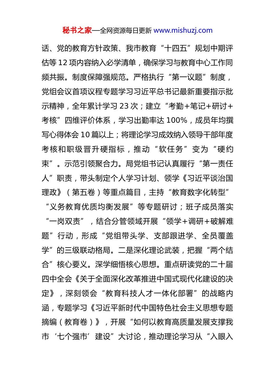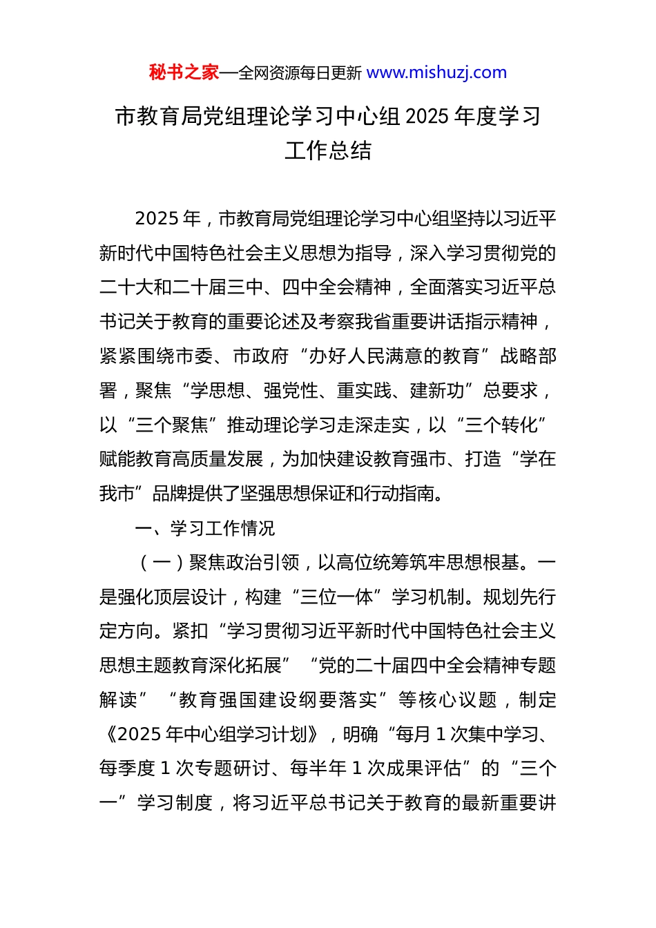 秘书之家—全网资源每日更新 www.mishuzj.com市教育局党组理论学习中心组 2025 年度学习工作总结 2025 年,市教育局党组理论学习中心组坚持以习近平新时代中国特色社会主义思想为指导,深入学习贯彻党的二十大和二十届三中、四中全会精神,全面落实习近平总书记关于教育的重要论述及考察我省重要讲话指示精神,紧紧围绕市委、市政府“办好人民满意的教育”战略部署,聚焦“学思想、强党性、重实践、建新功”总要求,以“三个聚焦”推动理论学习走深走实,以“三个转化”赋能教育高质量发展,为加快建设教育强市、打造“学在我市”品牌提供了坚强思想保证和行动指南。一、学习工作情况(一)聚焦政治引领,以高位统筹筑牢思想根基。一是强化顶层设计,构建“三位一体”学习机制。规划先行定方向。紧扣“学习贯彻习近平新时代中国特色社会主义思想主题教育深化拓展”“党的二十届四中全会精神专题解读”“教育强国建设纲要落实”等核心议题,制定《2025 年中心组学习计划》,明确“每月 1 次集中学习、每季度 1 次专题研讨、每半年 1 次成果评估”的“三个一”学习制度,将习近平总书记关于教育的最新重要讲秘书之家—全网资源每日更新 www.mishuzj.com话、党的教育方针政策、我市教育“十四五”规划中期评估等 12 项内容纳入必学清单,确保学习与教育中心工作同频共振。制度保障强规范。严格执行“第一议题”制度,党组会议首项议程专题学习习近平总书记最新重要指示批示精神,全年累计学习 23 次;建立“考勤+笔记+研讨+考核”四维评价体系,学习出勤率达 100%,成员年均撰写心得体会 10 篇以上;将理论学习成效纳入领导干部年度考核和职级晋升硬指标,推动“软任务”变为“硬 约束”。示范引领聚合力。局党组书记认真履行“第一责任人”职责,带头制定个人学习计划、领学《习近平谈治国理政》(第五卷)等重点篇目,主持“教育数字化转型”“义务教育优质均衡发展”等专题研讨;班子成员落实“一岗双责”,结合分管领域开展“领学+调研+破解难题”行动,形成“党组带头学、支部跟进学、全员覆盖学”的三级联动格局。二是深化理论武装,把握“两个结合”核心要义。深学细悟核心思想。重点研读党的二十届四中全会《关于全面深化改革推进中国式现代化建设的决定》,深刻领会“教育科技人才一体化部署”的战略内涵,专题学习《习近平新时代中国特色社会主义思想专题摘编(教育卷)》,开展“如何以教育高质量发展支撑我市‘七个强市’建设”大讨论,推动理论学习从“入眼入秘书之家—全网资源每日更新 www.mishuzj.com耳”向“入脑入心”转变。对标对表政治要求。围绕“深刻领悟‘两个确立’的决定性意义”主题,组织学习《中国共产党教育工作条例》《关于建立中小学校党组织领导的校长负责制的意见》,开展“政治三力”专题培训,班子成员带头查摆“重业务轻政治”“学用脱节”等 5 类问题,制定整改措施 23 项,切实把学习成果转化为坚定拥护“两个确立”、坚决做到“两个维护”的政治自觉。(二)聚焦守正创新,以多维融合激发学习活力。中心组打破“你讲我听”传统模式,创新“理论+实践”“专家+一线”“线上+线下”三维学习路径,推动理论学习从“被动接受”向“主动探索”升级。一是打造“行走的课堂”,让理论学习“沾泥土、带露珠”。红色教育铸魂。赴革命纪念馆开展“重温革命历史、传承教育初心”现场教学,通过“沉浸式”学习感悟共产党人的教育情怀,班子成员带头讲授“红色教育融入思政课”专题党课,推动党史学习教育常态化长效化。基层调研赋能。结合“四下基层”要求,班子成员带队深入乡村学校、新站高新区产业园区、应用型实验室等一线,围绕“义务教育‘双减’深化”“职业教育产教融合”“高校毕业生就地就业”等课题开展调研,形成《我市城乡教育资源均衡配置路径研究》等 4 份高质量报告,其中“集团化办学优化建议”被秘书之家—全网资源每日更新 www.mishuzj.com纳入市政府年度重点督办事项。二是打造“互动的课堂”,让思想碰撞“有深度、有温度”。专家辅导拓视野。邀请省教育厅基教处专家解读《基础教育课程改革深化行动方...