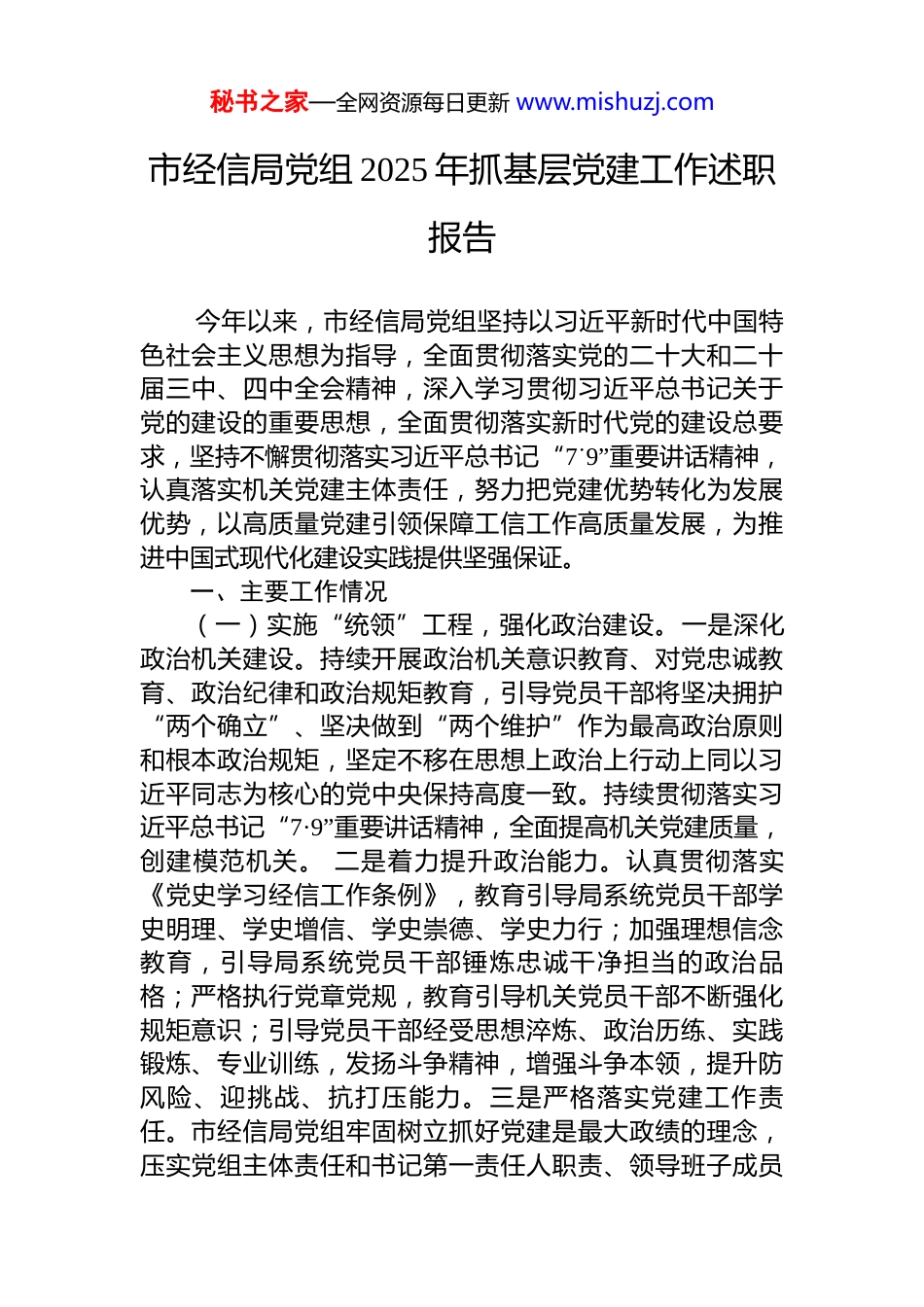 秘书之家—全网资源每日更新 www.mishuzj.com市经信局党组 2025 年抓基层党建工作述职报告 今年以来,市经信局党组坚持以习近平新时代中国特色社会主义思想为指导,全面贯彻落实党的二十大和二十届三中、四中全会精神,深入学习贯彻习近平总书记关于党的建设的重要思想,全面贯彻落实新时代党的建设总要求,坚持不懈贯彻落实习近平总书记“7˙9”重要讲话精神,认真落实机关党建主体责任,努力把党建优势转化为发展优势,以高质量党建引领保障工信工作高质量发展,为推进中国式现代化建设实践提供坚强保证。一、主要工作情况(一)实施“统领”工程,强化政治建设。一是深化政治机关建设。持续开展政治机关意识教育、对党忠诚教育、政治纪律和政治规矩教育,引导党员干部将坚决拥护“两个确立”、坚决做到“两个维护”作为最高政治原则和根本政治规矩,坚定不移在思想上政治上行动上同以习近平同志为核心的党中央保持高度一致。持续贯彻落实习近平总书记“7·9”重要讲话精神,全面提高机关党建质量,创建模范机关。 二是着力提升政治能力。认真贯彻落实《党史学习经信工作条例》,教育引导局系统党员干部学史明理、学史增信、学史崇德、学史力行;加强理想信念教育,引导局系统党员干部锤炼忠诚干净担当的政治品格;严格执行党章党规,教育引导机关党员干部不断强化规矩意识;引导党员干部经受思想淬炼、政治历练、实践锻炼、专业训练,发扬斗争精神,增强斗争本领,提升防风险、迎挑战、抗打压能力。三是严格落实党建工作责任。市经信局党组牢固树立抓好党建是最大政绩的理念,压实党组主体责任和书记第一责任人职责、领导班子成员秘书之家—全网资源每日更新 www.mishuzj.com“一岗双责”,制定党组落实全面从严治党主体责任任务安排,推动各级党组织和党员干部层层落实责任。落实班子成员联系党支部制度;坚持把党建工作纳入日常综合考评体系,不断优化机关党建考评体系,加强指导督促检查,抓实基层党组织书记述职评议考核工作,及时通报情况,推动问题整改,强化考评结果运用,促进机关党建工作提质增效。四是严肃党内政治生活。严格执行《关于新形势下党内政治生活的若干准则》,领导班子和党员领导干部严格落实民主集中制、重大事项请示报告制度、民主生活会、“双重”组织生活等制度,基层党组织和党员认真落实“三会一课”、组织生活会、民主评议党员、主题党日等制度,不断提高党内政治生活质量,营造风清气正的政治生态。利用红色资源,组织开展好主题党日活动。(二)实施“铸魂”工程,深化理论武装。一是深入学习贯彻党的创新理论。贯彻落实《关于巩固拓展学习贯彻习近平新时代中国特色社会主义思想主题教育成果的意见》,持续深入学习习近平总书记视察我省重要讲话重要指示精神,认真学习习近平总书记关于新型工业化、关于制造强国的重要指示重要论述,努力做到内化于心外化于行。抓好“关键少数”,压实党组理论学习中心组学习主体责任,坚持“第一议题”制度,跟进学习习近平总书记系列讲话指示精神,发挥领学促学作用。举办“今天我来讲、机关大讲堂”,推进“书香机关”建设,用好“学习强国”“先锋讲坛”“干部网络学院”等载体平台,持续抓好经常性学习。二是深入推进精神文明建设。制定精神文明建设工作方案和精神文明特色创建工作方案,持续完善机关文明单位日常管理机制,建立健全“党建+文明创建”工作机制。深入开展文明单位创建工作,积极组织“我们在一起”文明实践活动,深化“我们的节日”主题活动,促进机关精神文明建设与中心工作深度融合。坚持依法行政,积极履行社会责任,开展“月推季评”活动,秘书之家—全网资源每日更新 www.mishuzj.com深化公共文明进企业和志愿服务活动,推动公共文明素养不断提升。引导党员干部职工培育和践行社会主义核心价值观,加强向上向善道德风尚建设,树立良好的工信形象。三是深入做好意识形态工作。严格贯彻落实《党委(党组)意识形态工作责任制实施办法》,加强对意识形态工作的领导。落实意识形态联席会议制度,定期分析研判意识形态领域形势,积极防范化解重大风险,及时报告意识形态工作情况。深入...