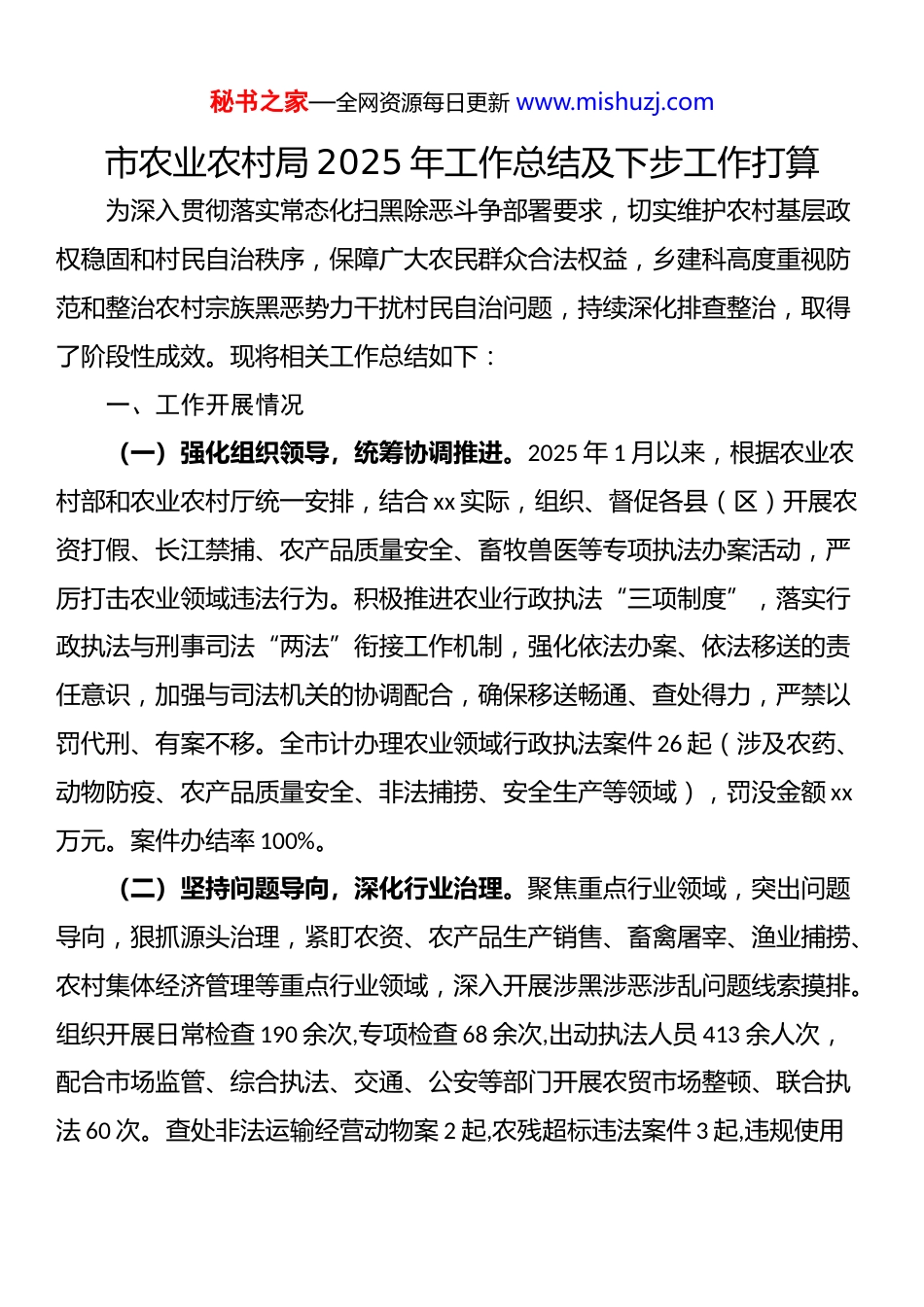 秘书之家—全网资源每日更新 www.mishuzj.com市农业农村局 2025 年工作总结及下步工作打算为深入贯彻落实常态化扫黑除恶斗争部署要求,切实维护农村基层政权稳固和村民自治秩序,保障广大农民群众合法权益,乡建科高度重视防范和整治农村宗族黑恶势力干扰村民自治问题,持续深化排查整治,取得了阶段性成效。现将相关工作总结如下:一、工作开展情况(一)强化组织领导,统筹协调推进。2025 年 1 月以来,根据农业农村部和农业农村厅统一安排,结合 xx 实际,组织、督促各县(区)开展农资打假、长江禁捕、农产品质量安全、畜牧兽医等专项执法办案活动,严厉打击农业领域违法行为。积极推进农业行政执法“三项制度”,落实行政执法与刑事司法“两法”衔接工作机制,强化依法办案、依法移送的责任意识,加强与司法机关的协调配合,确保移送畅通、查处得力,严禁以罚代刑、有案不移。全市计办理农业领域行政执法案件 26 起(涉及农药、动物防疫、农产品质量安全、非法捕捞、安全生产等领域),罚没金额 xx万元。案件办结率 100%。(二)坚持问题导向,深化行业治理。聚焦重点行业领域,突出问题导向,狠抓源头治理,紧盯农资、农产品生产销售、畜禽屠宰、渔业捕捞、农村集体经济管理等重点行业领域,深入开展涉黑涉恶涉乱问题线索摸排。组织开展日常检查 190 余次,专项检查 68 余次,出动执法人员 413 余人次,配合市场监管、综合执法、交通、公安等部门开展农贸市场整顿、联合执法 60 次。查处非法运输经营动物案 2 起,农残超标违法案件 3 起,违规使用秘书之家—全网资源每日更新 www.mishuzj.com农药案 3 起,禁渔期禁渔区钓鱼案件 6 起,无证驾驶拖拉机 1 起,共罚没金额 xx元。(三)加强宣传教育,完善收集机制。落实“谁执法、谁普法”责任制,深入开展“法律进农村”活动,广泛宣传农业农村相关法律法规知识及违法犯罪危害,切实提高人民群众法治意识。充分依托“花城 e+”社区智慧治理平台、“12345”市长服务热线、“12316”农业服务热线等线索举报接收渠道,健全完善信息收集处置机制,全面收集群众举报线索,做好涉黑涉恶线索移交,加强行业问题线索核查,建立完善线索台账,及时对账销号。二、工作成效与现状通过持续努力,我市在防范整治农村宗族黑恶势力干扰村民自治方面取得积极进展:一是未发生农村宗族黑恶势力干扰村民自治等违法犯罪行为。二是加强基层*组织建设,扎实开展“村霸”等黑恶势力集中整治,深化平安乡村、法治乡村建设,有效铲除黑恶势力滋生土壤。三是进一步完善体制机制,重点行业领域问题线索实现动态清零,农业农村发展环境持续向好。三、存在的问题仍存在一些村民对农村宗族黑恶势力危害性认识不深,对扫黑除恶斗争常态化的新要求知晓度不高,主动监督举报的积极性低的问题。个别乡镇主体责任落实不到位,认为专项斗争只是政法部门的事,存在等、靠被动思想,没有主动摸排、搜集线索。秘书之家—全网资源每日更新 www.mishuzj.com四、下一步工作方向乡建科将持续开展常态化扫黑除恶工作,切实维护农业农村领域良好秩序,为乡村振兴提供法治保障。一是进一步加强组织领导,督促指导各县(市、区)农业农村部门认真抓好常态化开展扫黑除恶斗争工作。二是加强违法案件查处力度,严厉打击重点领域违法行为,对于重点行业领域问题持续做到动态清零。三是加大联合执法检查力度及频次,强化责任意识,联合执法,信息共享,齐抓共管。四是充分利用人民群众监督力量,进一步完善举报制度,拓宽举报渠道,群策群力,强化监督,加强扫黑除恶线索收集调查工作。