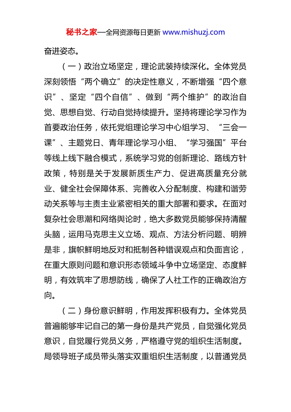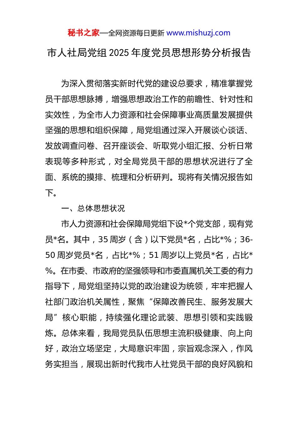 秘书之家—全网资源每日更新 www.mishuzj.com市人社局党组 2025 年度党员思想形势分析报告 为深入贯彻落实新时代党的建设总要求,精准掌握党员干部思想脉搏,增强思想政治工作的前瞻性、针对性和实效性,为全市人力资源和社会保障事业高质量发展提供坚强的思想和组织保障,局党组通过深入开展谈心谈话、发放调查问卷、召开座谈会、听取党小组汇报、分析日常表现等多种形式,对全局党员干部的思想状况进行了全面、系统的摸排、梳理和分析研判。现将有关情况报告如下。一、总体思想状况市人力资源和社会保障局党组下设*个党支部,现有党员*名。其中,35 周岁(含)以下党员*名,占比*%;36-50 周岁党员*名,占比*%;51 周岁以上党员*名,占比*%。在市委、市政府的坚强领导和市委直属机关工委的有力指导下,局党组坚持以党的政治建设为统领,牢牢把握人社部门政治机关属性,聚焦“保障改善民生、服务发展大局”核心职能,持续强化理论武装、思想引领和实践锻炼。总体来看,我局党员队伍思想主流积极健康、向上向好,政治立场坚定,大局意识牢固,宗旨观念深入,作风务实担当,展现出新时代我市人社党员干部的良好风貌和秘书之家—全网资源每日更新 www.mishuzj.com奋进姿态。(一)政治立场坚定,理论武装持续深化。全体党员深刻领悟“两个确立”的决定性意义,不断增强“四个意识”、坚定“四个自信”、做到“两个维护”的政治自觉、思想自觉、行动自觉持续提升。坚持将理论学习作为首要政治任务,依托党组理论学习中心组学习、“三会一课”、主题党日、青年理论学习小组、“学习强国”平台等线上线下融合模式,系统学习党的创新理论、路线方针政策,特别是关于发展新质生产力、促进高质量充分就业、健全社会保障体系、完善收入分配制度、构建和谐劳动关系等与主责主业紧密相关的重大部署和要求。在面对复杂社会思潮和网络舆论时,绝大多数党员能够保持清醒头脑,运用马克思主义立场、观点、方法分析问题、明辨是非,旗帜鲜明地反对和抵制各种错误观点和负面言论,在重大原则问题和意识形态领域斗争中立场坚定、态度鲜明,有效筑牢了思想防线,确保了人社工作的正确政治方向。(二)身份意识鲜明,作用发挥积极有力。全体党员普遍能够牢记自己的第一身份是共产党员,自觉强化党员意识,自觉履行党员义务,严格遵守党的组织生活制度。局领导班子成员带头落实双重组织生活制度,以普通党员秘书之家—全网资源每日更新 www.mishuzj.com身份参加所在支部活动。广大党员立足人社岗位实际,在推动落实“人人持证、技能”我市行动、保障重点群体就业、深化社会保险制度改革、构建和谐劳动关系、优化人才发展环境、提升政务服务效能等中心工作和急难险重任务中,展现出较强的责任感和担当精神。特别是在应对就业市场波动、处理复杂劳资纠纷、经办服务高峰期、突击攻坚重点任务时,许多党员冲锋在前、加班加点,主动承担“党员先锋岗”“党员责任区”职责,发挥了先锋模范作用,体现了人社党员干部的实干作风。(三)宗旨观念牢固,为民服务用心用情。全局党员干部深刻认识到人社工作关乎百姓生计、社会稳定的极端重要性,牢固树立以人民为中心的发展思想,不断强化“服务发展、服务民生、服务人才、服务群众”的宗旨意识。积极践行“一线工作法”,深入基层社区、企业园区、职业院校、乡村一线,聚焦群众在就业创业、社会保障、劳动维权、人才服务等方面的急难愁盼问题,扎实开展“人社局长走流程”“政策敲门进企业”“暖心行动”服务重点群体、“仲裁监察进园区”等活动。在服务窗口、12333 热线、线上平台等为民服务一线,党员干部努力提升服务温度、精度和速度,用心用情用力做好政策咨询解答、业务经办指导、矛盾化解疏导等工作,努力当好秘书之家—全网资源每日更新 www.mishuzj.com企业和群众的“贴心人”“服务员”,以实际行动践行全心全意为人民服务的根本宗旨,群众对人社服务的满意度稳步提升。(四)纪律规矩严明,作风建设持续向好。党员干部普遍具有较强的纪律观念和规矩意识,能够自觉学习遵守党章党规党纪和国家法律法规,严格遵守中央八项规定及其实施细则精神...