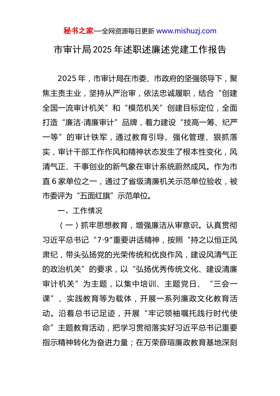 秘书之家—全网资源每日更新 www.mishuzj.com市审计局 2025 年述职述廉述党建工作报告 2025 年,市审计局在市委、市政府的坚强领导下,聚焦主责主业,坚持从严治审,依法忠诚履职,结合“创建全国一流审计机关”和“模范机关”创建目标定位,全面打造“廉洁·清廉审计”品牌,着力建设“技高一筹、纪严一等”的审计铁军,通过教育引导、强化管理、狠抓落实,审计干部工作作风和精神状态发生了根本性变化,风清气正、干事创业的新气象在审计系统蔚然成风。作为市直 6 家单位之一,通过了省级清廉机关示范单位验收,被市委评为“五面红旗”示范单位。一、工作情况(一)抓牢思想教育,增强廉洁从审意识。认真贯彻习近平总书记“7·9”重要讲话精神,按照“持之以恒正风肃纪,带头弘扬党的光荣传统和优良作风,建设风清气正的政治机关”的要求,以“弘扬优秀传统文化、建设清廉审计机关”为主题,以集中培训、主题党日、“三会一课”、实践教育等为载体,开展一系列廉政文化教育活动。沿着总书记足迹,开展“牢记领袖嘱托践行时代使命”主题教育活动,把学习贯彻落实好习近平总书记重要指示精神转化为奋进力量;在万荣薛瑄廉政教育基地深刻秘书之家—全网资源每日更新 www.mishuzj.com领悟“不妄取、不苟取、不敢取”的廉政三境界;以廉洁家风促进廉洁从政常态化、生活化,邀请部分干部家属参加科室负责人述责述廉大会,发放“家庭助廉倡议书”,引导干部家属当好“家庭纪委书记”;以党纪学习教育为契机,坚持以铁的纪律凝聚意志、锤炼作风、锻造队伍,将廉洁意识根植于心;坚持把廉洁文化建设作为清廉机关建设的基础和先导,积极开展清廉文化墙、审计大讲堂等内容丰富的实践创新,推动清廉价值理念向更深层次迈进。通过教育引导,使审计干部不断增强廉洁自律性,牢固树立纪律意识和规矩意识,切实把准审计工作的政治立场和政治方向,筑牢防腐拒变的思想防线,自觉让依法审计、廉洁审计和文明审计入脑入心、付诸行动。(二)强化监督保障,构建清廉制度体系。强化制度建设,完善监督体系。健全完善《市审计局奖励性资金分配办法》《审计项目现场管理办法》《审计廉政回访制度》等 50 余项管理办法,各项工作均有法可依、有章可循。十个审计业务管理办法优化了审计流程,规范了执法行为,提升了审计质量;奖励性资金分配办法和事业人员绩效考核办法打破平均主义,激励了全体审计人员干事创业的热情;廉政风险防控制度,使审计干部警钟长鸣、利剑高悬,做到懂法纪、知敬畏、守底线。强化制度执行,秘书之家—全网资源每日更新 www.mishuzj.com推进常态监督。树牢制度的执行意识,以“关键少数”带动机关多数,推动机关党员干部带头严格执行制度,形成人人自觉尊崇制度、严格执行制度、坚决维护制度的良好氛围。日常工作中实行审计人员去向报告制度,严格落实不定时检查制度,每月一名局领导带队对工作纪律、环境卫生等进行不少于两次的检查,并进行结果通报;紧盯关键时节,采取节前教育、下发通知、电话提醒等方式,坚决防范违反纪律规定精神问题发生。强化制度问责,形成执行合力。全面落实关于强化制度执行的督查,坚持奖惩并举、赏罚分明,既向无所事事、推诿扯皮、人浮于事等不正之风亮剑开刀,又打破平均主义,在奖励性资金分配时体现多劳多得,拉开差距。同时在选拔任用干部和年度评选优秀党员时,根据工作表现和业绩确定候选人,防止唯票取人。开展新进人员谈话、任前谈话、审前廉政谈话,形成主动监督与自觉接受监督的良好氛围。(三)筑牢“十二道防线”,规范审计权力运行。通过扎实开展清廉机关创建示范活动,营造更加清朗的清廉机关环境,突出抓好规范权力运行、强化监督管理、加强作风建设等重点任务,筑牢审计机关内部“十二道防线”,在清廉建设中打造审计样本、展现审计担当、做出审计贡献。打好三道审前“预防针”,严格审前廉政谈话秘书之家—全网资源每日更新 www.mishuzj.com和廉政保密承诺,强化审计实施方案全过程控制,成立外出审计组临时党支部,促进党建、业务双融合;筑牢六道审中“防火墙”,严格落实审计公示和“双举报箱”制度,着力强化延...