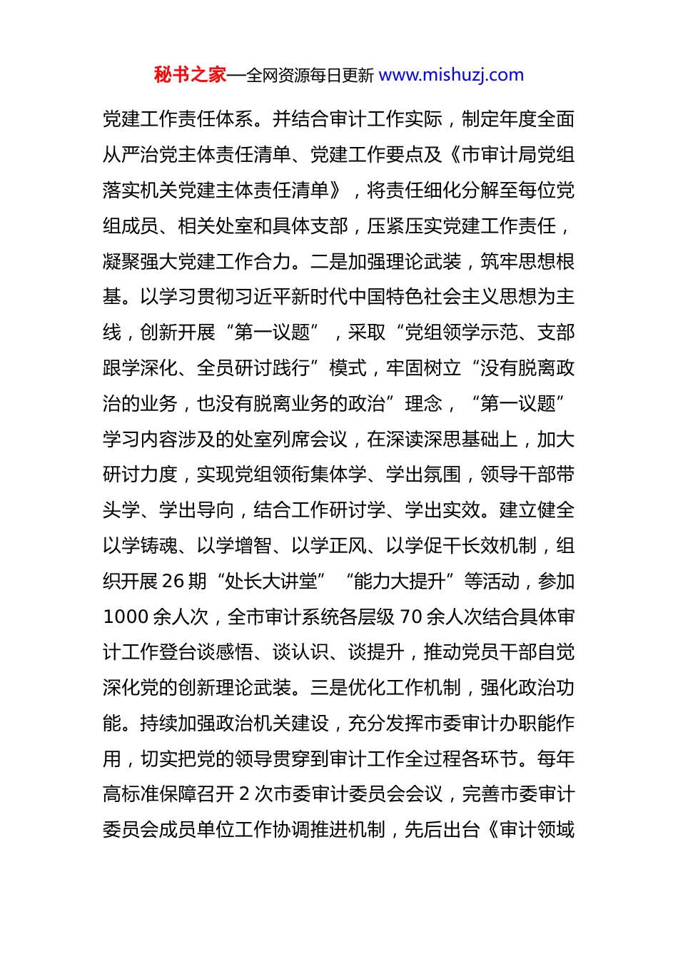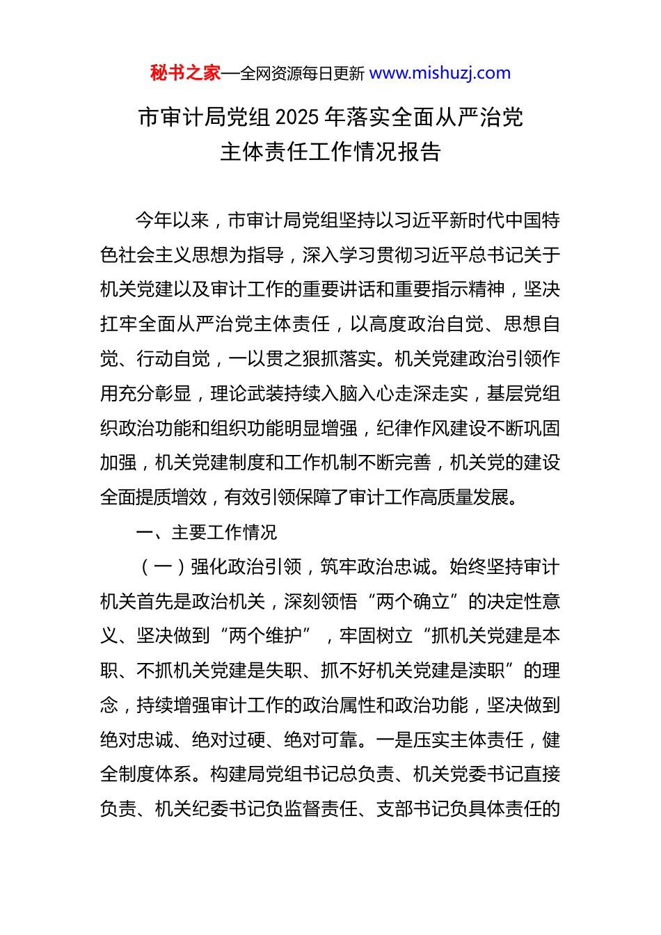秘书之家—全网资源每日更新 www.mishuzj.com市审计局党组 2025 年落实全面从严治党主体责任工作情况报告 今年以来,市审计局党组坚持以习近平新时代中国特色社会主义思想为指导,深入学习贯彻习近平总书记关于机关党建以及审计工作的重要讲话和重要指示精神,坚决扛牢全面从严治党主体责任,以高度政治自觉、思想自觉、行动自觉,一以贯之狠抓落实。机关党建政治引领作用充分彰显,理论武装持续入脑入心走深走实,基层党组织政治功能和组织功能明显增强,纪律作风建设不断巩固加强,机关党建制度和工作机制不断完善,机关党的建设全面提质增效,有效引领保障了审计工作高质量发展。一、主要工作情况(一)强化政治引领,筑牢政治忠诚。始终坚持审计机关首先是政治机关,深刻领悟“两个确立”的决定性意义、坚决做到“两个维护”,牢固树立“抓机关党建是本职、不抓机关党建是失职、抓不好机关党建是渎职”的理念,持续增强审计工作的政治属性和政治功能,坚决做到绝对忠诚、绝对过硬、绝对可靠。一是压实主体责任,健全制度体系。构建局党组书记总负责、机关党委书记直接负责、机关纪委书记负监督责任、支部书记负具体责任的秘书之家—全网资源每日更新 www.mishuzj.com党建工作责任体系。并结合审计工作实际,制定年度全面从严治党主体责任清单、党建工作要点及《市审计局党组落实机关党建主体责任清单》,将责任细化分解至每位党组成员、相关处室和具体支部,压紧压实党建工作责任,凝聚强大党建工作合力。二是加强理论武装,筑牢思想根基。以学习贯彻习近平新时代中国特色社会主义思想为主线,创新开展“第一议题”,采取“党组领学示范、支部跟学深化、全员研讨践行”模式,牢固树立“没有脱离政治的业务,也没有脱离业务的政治”理念,“第一议题”学习内容涉及的处室列席会议,在深读深思基础上,加大研讨力度,实现党组领衔集体学、学出氛围,领导干部带头学、学出导向,结合工作研讨学、学出实效。建立健全以学铸魂、以学增智、以学正风、以学促干长效机制,组织开展 26 期“处长大讲堂”“能力大提升”等活动,参加1000 余人次,全市审计系统各层级 70 余人次结合具体审计工作登台谈感悟、谈认识、谈提升,推动党员干部自觉深化党的创新理论武装。三是优化工作机制,强化政治功能。持续加强政治机关建设,充分发挥市委审计办职能作用,切实把党的领导贯穿到审计工作全过程各环节。每年高标准保障召开 2 次市委审计委员会会议,完善市委审计委员会成员单位工作协调推进机制,先后出台《审计领域秘书之家—全网资源每日更新 www.mishuzj.com重大事项督察督办工作制度》《关于建立重大审计事项直报机制的实施办法》等 27 项文件,不断健全完善把重要批示精神“贯下去”、贯彻落实情况“拿上来”的运行机制,切实将管理体制改革红利转化为推动科学规范开展审计工作的强大动力,切实当好“党之利器、国之利器”。(二)强化支部建设,建强战斗堡垒。始终树牢大抓基层鲜明导向,坚持党的一切工作到支部,党的一切工作靠支部,坚决落实“政治功能强、支部班子强、党员队伍强、作用发挥强”的四强支部标准,持续不断强化支部建设,锻造坚强有力的机关基层党组织,充分发挥党支部的战斗堡垒作用。一是突出政治属性,把牢审计方向。始终坚持把党对审计工作的重大决策部署作为根本遵循,修订完善《市审计局关于外出审计组建立临时党支部制度》,推行“审计组+临时党支部”模式,深化“七个一”工作法,由审计组长担任支部书记,将政治理论学习、重大事项决策、廉政纪律监督等纳入支部职责,实现审计工作开展到哪里、党的建设就跟进到哪里。在审计项目实施中,临时党支部首先研究习近平总书记关于被审计行业、领域的重要指示批示精神,把国家大政方针背后蕴含的政治意图、战略考虑和实践要求研究透、把政治要求下的政策安排以及政策安排中需要关注的项目和资金研究透,把上级秘书之家—全网资源每日更新 www.mishuzj.com对审计对象所在的行业、领域的决策部署研究透,从而瞄准审计目标的制高点、找准审计核查的切入点,切实围绕党和政府中心工作开展审计,确保审计监...