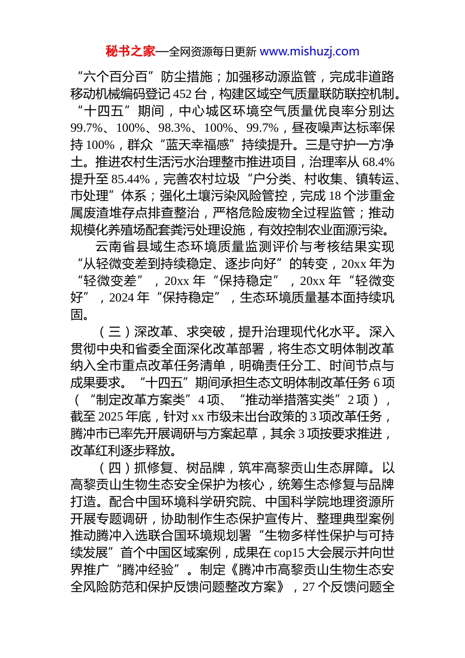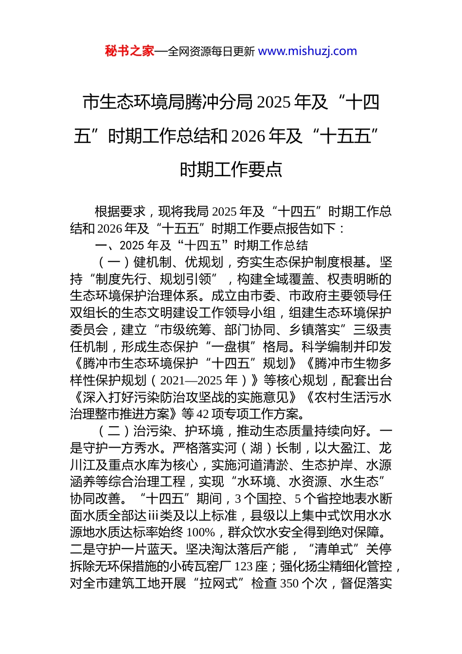 秘书之家—全网资源每日更新 www.mishuzj.com市生态环境局腾冲分局 2025 年及“十四五”时期工作总结和 2026 年及“十五五”时期工作要点根据要求,现将我局 2025 年及“十四五”时期工作总结和 2026 年及“十五五”时期工作要点报告如下:一、2025 年及“十四五”时期工作总结(一)健机制、优规划,夯实生态保护制度根基。坚持“制度先行、规划引领”,构建全域覆盖、权责明晰的生态环境保护治理体系。成立由市委、市政府主要领导任双组长的生态文明建设工作领导小组,组建生态环境保护委员会,建立“市级统筹、部门协同、乡镇落实”三级责任机制,形成生态保护“一盘棋”格局。科学编制并印发《腾冲市生态环境保护“十四五”规划》《腾冲市生物多样性保护规划(2021—2025 年)》等核心规划,配套出台《深入打好污染防治攻坚战的实施意见》《农村生活污水治理整市推进方案》等 42 项专项工作方案。(二)治污染、护环境,推动生态质量持续向好。一是守护一方秀水。严格落实河(湖)长制,以大盈江、龙川江及重点水库为核心,实施河道清淤、生态护岸、水源涵养等综合治理工程,实现“水环境、水资源、水生态”协同改善。“十四五”期间,3 个国控、5 个省控地表水断面水质全部达ⅲ类及以上标准,县级以上集中式饮用水水源地水质达标率始终 100%,群众饮水安全得到绝对保障。二是守护一片蓝天。坚决淘汰落后产能,“清单式”关停拆除无环保措施的小砖瓦窑厂 123 座;强化扬尘精细化管控,对全市建筑工地开展“拉网式”检查 350 个次,督促落实秘书之家—全网资源每日更新 www.mishuzj.com“六个百分百”防尘措施;加强移动源监管,完成非道路移动机械编码登记 452 台,构建区域空气质量联防联控机制。“十四五”期间,中心城区环境空气质量优良率分别达99.7%、100%、98.3%、100%、99.7%,昼夜噪声达标率保持 100%,群众“蓝天幸福感”持续提升。三是守护一方净土。推进农村生活污水治理整市推进项目,治理率从 68.4%提升至 85.44%,完善农村垃圾“户分类、村收集、镇转运、市处理”体系;强化土壤污染风险管控,完成 18 个涉重金属废渣堆存点排查整治,严格危险废物全过程监管;推动规模化养殖场配套粪污处理设施,有效控制农业面源污染。云南省县域生态环境质量监测评价与考核结果实现“从轻微变差到持续稳定、逐步向好”的转变,20xx 年为“轻微变差”,20xx 年“保持稳定”,20xx 年“轻微变好”,2024 年“保持稳定”,生态环境质量基本面持续巩固。(三)深改革、求突破,提升治理现代化水平。深入贯彻中央和省委全面深化改革部署,将生态文明体制改革纳入全市重点改革任务清单,明确责任分工、时间节点与成果要求。“十四五”期间承担生态文明体制改革任务 6 项(“制定改革方案类”4 项、“推动举措落实类”2 项),截至 2025 年底,针对 xx 市级未出台政策的 3 项改革任务,腾冲市已率先开展调研与方案起草,其余 3 项按要求推进,改革红利逐步释放。(四)抓修复、树品牌,筑牢高黎贡山生态屏障。以高黎贡山生物生态安全保护为核心,统筹生态修复与品牌打造。配合中国环境科学研究院、中国科学院地理资源所开展专题调研,协助制作生态保护宣传片、整理典型案例推动腾冲入选联合国环境规划署“生物多样性保护与可持续发展”首个中国区域案例,成果在 cop15 大会展示并向世界推广“腾冲经验”。制定《腾冲市高黎贡山生物生态安全风险防范和保护反馈问题整改方案》,27 个反馈问题全秘书之家—全网资源每日更新 www.mishuzj.com部整改完成;2024 年 11 月完成《腾冲市人民政府关于高黎贡山地区“贴边开发、贴线开发”调查评估报告》,为科学保护与合理开发提供决策依据。(五)强监管、优服务,实现执法与服务双赋能。运用“双随机、一公开”监管模式,结合日常巡查与专项检查,“十四五”期间累计出动监察人员 1480 余人次,立案查处环境违法案件 80 件,处罚金额 xx 余万元;畅通投诉渠道,办结群众环境诉求 763 件,维护群众环境权益。落实“一线工作法”,成立“企业服务团”,帮扶企业 130 余家次;高效...
