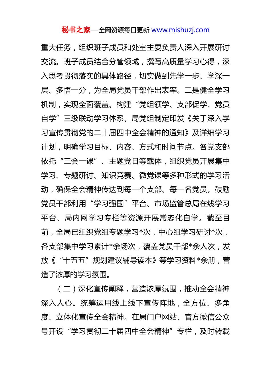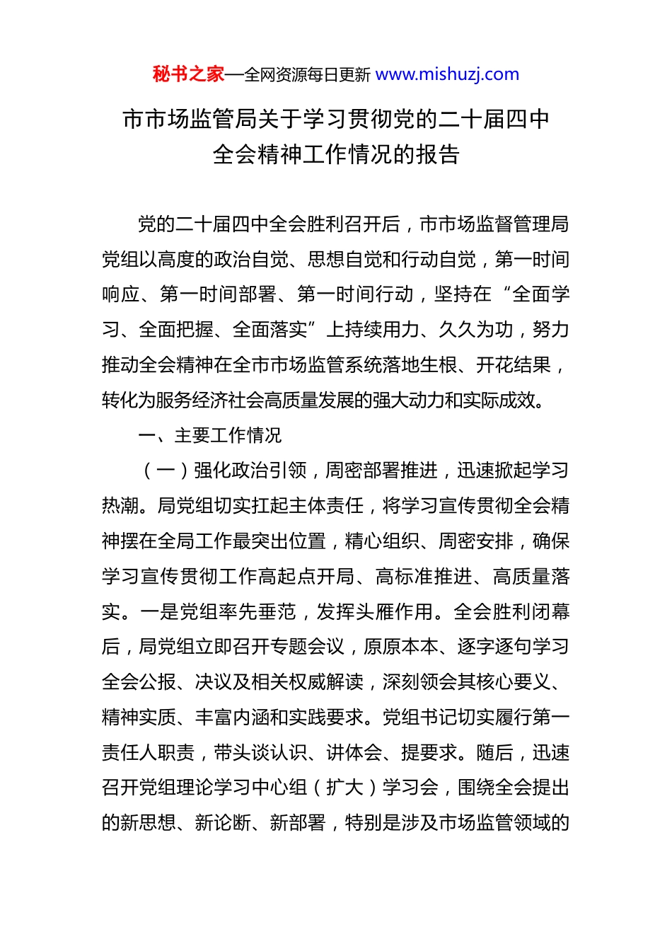 秘书之家—全网资源每日更新 www.mishuzj.com市市场监管局关于学习贯彻党的二十届四中全会精神工作情况的报告 党的二十届四中全会胜利召开后,市市场监督管理局党组以高度的政治自觉、思想自觉和行动自觉,第一时间响应、第一时间部署、第一时间行动,坚持在“全面学习、全面把握、全面落实”上持续用力、久久为功,努力推动全会精神在全市市场监管系统落地生根、开花结果,转化为服务经济社会高质量发展的强大动力和实际成效。一、主要工作情况(一)强化政治引领,周密部署推进,迅速掀起学习热潮。局党组切实扛起主体责任,将学习宣传贯彻全会精神摆在全局工作最突出位置,精心组织、周密安排,确保学习宣传贯彻工作高起点开局、高标准推进、高质量落实。一是党组率先垂范,发挥头雁作用。全会胜利闭幕后,局党组立即召开专题会议,原原本本、逐字逐句学习全会公报、决议及相关权威解读,深刻领会其核心要义、精神实质、丰富内涵和实践要求。党组书记切实履行第一责任人职责,带头谈认识、讲体会、提要求。随后,迅速召开党组理论学习中心组(扩大)学习会,围绕全会提出的新思想、新论断、新部署,特别是涉及市场监管领域的秘书之家—全网资源每日更新 www.mishuzj.com重大任务,组织班子成员和处室主要负责人深入开展研讨交流。班子成员结合分管领域,撰写高质量学习心得,深入思考贯彻落实的具体路径,切实做到先学一步、学深一层、多悟一分,为全局党员干部作出表率。二是健全学习机制,实现全面覆盖。构建“党组领学、支部促学、党员自学”三级联动学习体系。局党组制定印发《关于深入学习宣传贯彻党的二十届四中全会精神的通知》及详细学习计划,明确学习目标、内容、方式和时间节点。各党支部依托“三会一课”、主题党日等载体,组织党员开展集中学习、专题研讨、知识竞赛、微党课等多种形式的学习活动,确保全会精神传达到每一个支部、每一名党员。鼓励党员干部利用“学习强国”平台、市场监管总局在线学习平台、局内网学习专栏等资源开展常态化自学。截至目前,全局已组织党组专题学习*次,中心组学习研讨*次,各支部集中学习累计*余场次,覆盖党员干部*余人次,发放《“十五五”规划建议辅导读本》等学习资料*余册,营造了浓厚的学习氛围。(二)深化宣传阐释,营造浓厚氛围,推动全会精神深入人心。统筹运用线上线下宣传阵地,全方位、多角度、立体化宣传全会精神。在局门户网站、官方微信公众号开设“学习贯彻二十届四中全会精神”专栏,及时转载秘书之家—全网资源每日更新 www.mishuzj.com中央主要媒体权威解读文章、评论员文章,持续报道全局及各基层单位学习动态、特色做法和心得体会。利用局机关大楼电子显示屏、宣传栏等载体,滚动播放宣传标语和核心要点。局领导班子成员率先垂范,结合“大走访大调研”“服务企业行”“乡村振兴帮扶”等工作,深入基层市场监管所、行业协会、重点企业、个体工商户以及乡村振兴联系点,开展对象化、分众化、互动化的宣讲活动*余场次。宣讲紧密联系市场监管职能和基层群众、市场主体的关切,用通俗易懂的语言解读全会精神,特别是关于优化营商环境、维护公平竞争、保护消费者权益、推动高质量发展等与市场监管紧密相关的内容,推动全会精神“飞入寻常百姓家”,凝聚起广泛的思想共识和行动合力。(三)聚焦核心要义,紧密联系实际,推动学习成果向实践效能转化。市市场监管局坚持学思用贯通、知信行统一,紧密围绕全会作出的重大战略部署,特别是关于“构建高水平社会主义市场经济体制”、“加快建设全国统一大市场”、“深化‘放管服’改革”、“完善宏观经济治理体系”、“着力推动高质量发展”等要求,组织全局各业务条线深入开展大讨论、大调研,主动对标对表,找准市场监管工作的切入点和着力点,切实把学习成效转化为完善监管机制、优化营商环境、维护市场秩序、激发秘书之家—全网资源每日更新 www.mishuzj.com市场活力的具体行动和实际成果。一是深化“放管服”改革,激发市场主体活力。聚焦“营造市场化、法治化、国际化一流营商环境”目标,持续优化准入准营环境。全面落实《市场主体登记管理条例》,深化“一...