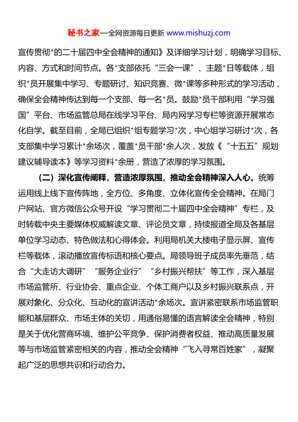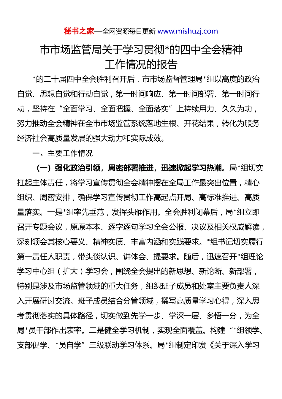 秘书之家—全网资源每日更新 www.mishuzj.com市市场监管局关于学习贯彻*的四中全会精神工作情况的报告*的二十届四中全会胜利召开后,市市场监督管理局*组以高度的政治自觉、思想自觉和行动自觉,第一时间响应、第一时间部署、第一时间行动,坚持在“全面学习、全面把握、全面落实”上持续用力、久久为功,努力推动全会精神在全市市场监管系统落地生根、开花结果,转化为服务经济社会高质量发展的强大动力和实际成效。一、主要工作情况(一)强化政治引领,周密部署推进,迅速掀起学习热潮。局*组切实扛起主体责任,将学习宣传贯彻全会精神摆在全局工作最突出位置,精心组织、周密安排,确保学习宣传贯彻工作高起点开局、高标准推进、高质量落实。一是*组率先垂范,发挥头雁作用。全会胜利闭幕后,局*组立即召开专题会议,原原本本、逐字逐句学习全会公报、决议及相关权威解读,深刻领会其核心要义、精神实质、丰富内涵和实践要求。*组书记切实履行第一责任人职责,带头谈认识、讲体会、提要求。随后,迅速召开*组理论学习中心组(扩大)学习会,围绕全会提出的新思想、新论断、新部署,特别是涉及市场监管领域的重大任务,组织班子成员和处室主要负责人深入开展研讨交流。班子成员结合分管领域,撰写高质量学习心得,深入思考贯彻落实的具体路径,切实做到先学一步、学深一层、多悟一分,为全局*员干部作出表率。二是健全学习机制,实现全面覆盖。构建“*组领学、支部促学、*员自学”三级联动学习体系。局*组制定印发《关于深入学习秘书之家—全网资源每日更新 www.mishuzj.com宣传贯彻*的二十届四中全会精神的通知》及详细学习计划,明确学习目标、内容、方式和时间节点。各*支部依托“三会一课”、主题*日等载体,组织*员开展集中学习、专题研讨、知识竞赛、微*课等多种形式的学习活动,确保全会精神传达到每一个支部、每一名*员。鼓励*员干部利用“学习强国”平台、市场监管总局在线学习平台、局内网学习专栏等资源开展常态化自学。截至目前,全局已组织*组专题学习*次,中心组学习研讨*次,各支部集中学习累计*余场次,覆盖*员干部*余人次,发放《“十五五”规划建议辅导读本》等学习资料*余册,营造了浓厚的学习氛围。(二)深化宣传阐释,营造浓厚氛围,推动全会精神深入人心。统筹运用线上线下宣传阵地,全方位、多角度、立体化宣传全会精神。在局门户网站、官方微信公众号开设“学习贯彻二十届四中全会精神”专栏,及时转载中央主要媒体权威解读文章、评论员文章,持续报道全局及各基层单位学习动态、特色做法和心得体会。利用局机关大楼电子显示屏、宣传栏等载体,滚动播放宣传标语和核心要点。局领导班子成员率先垂范,结合“大走访大调研”“服务企业行”“乡村振兴帮扶”等工作,深入基层市场监管所、行业协会、重点企业、个体工商户以及乡村振兴联系点,开展对象化、分众化、互动化的宣讲活动*余场次。宣讲紧密联系市场监管职能和基层群众、市场主体的关切,用通俗易懂的语言解读全会精神,特别是关于优化营商环境、维护公平竞争、保护消费者权益、推动高质量发展等与市场监管紧密相关的内容,推动全会精神“飞入寻常百姓家”,凝聚起广泛的思想共识和行动合力。秘书之家—全网资源每日更新 www.mishuzj.com(三)聚焦核心要义,紧密联系实际,推动学习成果向实践效能转化。市市场监管局坚持学思用贯通、知信行统一,紧密围绕全会作出的重大战略部署,特别是关于“构建高水平社会主义市场经济体制”、“加快建设全国统一大市场”、“深化‘放管服’改革”、“完善宏观经济治理体系”、“着力推动高质量发展”等要求,组织全局各业务条线深入开展大讨论、大调研,主动对标对表,找准市场监管工作的切入点和着力点,切实把学习成效转化为完善监管机制、优化营商环境、维护市场秩序、激发市场活力的具体行动和实际成果。一是深化“放管服”改革,激发市场主体活力。聚焦“营造市场化、法治化、国际化一流营商环境”目标,持续优化准入准营环境。全面落实《市场主体登记管理条例》,深化“一网通办”“证照分离”改革,探索“一业一证”和登记确认制改革,建立市场准入...