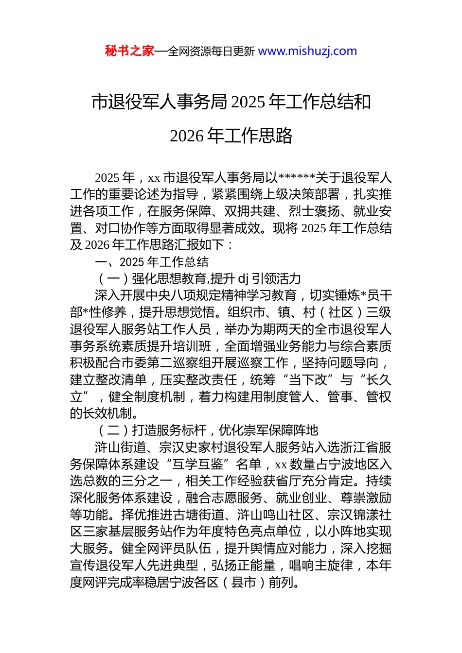 秘书之家—全网资源每日更新 www.mishuzj.com市退役军人事务局 2025 年工作总结和2026 年工作思路2025 年,xx 市退役军人事务局以******关于退役军人工作的重要论述为指导,紧紧围绕上级决策部署,扎实推进各项工作,在服务保障、双拥共建、烈士褒扬、就业安置、对口协作等方面取得显著成效。现将 2025 年工作总结及 2026 年工作思路汇报如下:一、2025 年工作总结(一)强化思想教育,提升 dj 引领活力深入开展中央八项规定精神学习教育,切实锤炼*员干部*性修养,提升思想觉悟。组织市、镇、村(社区)三级退役军人服务站工作人员,举办为期两天的全市退役军人事务系统素质提升培训班,全面增强业务能力与综合素质积极配合市委第二巡察组开展巡察工作,坚持问题导向,建立整改清单,压实整改责任,统筹“当下改”与“长久立”,健全制度机制,着力构建用制度管人、管事、管权的长效机制。(二)打造服务标杆,优化崇军保障阵地浒山街道、宗汉史家村退役军人服务站入选浙江省服务保障体系建设“互学互鉴”名单,xx 数量占宁波地区入选总数的三分之一,相关工作经验获省厅充分肯定。持续深化服务体系建设,融合志愿服务、就业创业、尊崇激励等功能。择优推进古塘街道、浒山鸣山社区、宗汉锦漾社区三家基层服务站作为年度特色亮点单位,以小阵地实现大服务。健全网评员队伍,提升舆情应对能力,深入挖掘宣传退役军人先进典型,弘扬正能量,唱响主旋律,本年度网评完成率稳居宁波各区(县市)前列。秘书之家—全网资源每日更新 www.mishuzj.com(三)落实优抚政策,持续深化双拥共建创新打造“优抚资金精准发放”平台成效显著。年初以来,全省 10 个地市、24 个区县先后赴慈考察交流;3 月底,全省优抚资金精准发放工作推进会在我市成功举办;退役军人事务部三次来慈专题调研,拟以该平台为基础向全国推广。相关经验做法在《中国退役军人》《中国双拥》等杂志刊发。1—10 月,平台累计发放定期抚恤补助金xx 万元(10.9 万人次),其他各项经费共计 xx 万元,实现资金发放精准高效。扎实开展优待服务,组织 240 名优抚对象分 5 批次参加短期疗休养;新增悬挂光荣牌 152 块,更换 450 块;为 210名春季及秋季退役报到军人集中办理优待证;赠送新春年画、“八一”慰问信各 3.4 万余份。节日期间,市领导及退役军人事务局走访慰问退役军人、优抚对象和部队官兵 383人次,发放慰问金(品)37 万元,协调解决部队实际困难 8项,投入 50 余万元完成胜山部队点将台建设。集中送达立功喜报 25 份,征集并认领困难退役军人“微心愿”100 个。组织义务兵父母(含烈属)免费体检 328 人次,解决 6 名军人子女入园就学问题,走访困难现役军人家庭 2 户,开展“拥军光明行”义诊活动,覆盖 17 个镇(街道)及驻地部队,服务官兵及优抚对象 4300 余人次。充分发挥拥军先进模范示范引领作用,我市施新岳同志获评“浙江省爱国拥军模范”,曹建波同志获评“浙江省模范退役军人”。完成全省拥军支前市县联动试点工作,做好方案制定,队伍组建和企业发动有序推进,拟于 11 月底前正式完成;“八一”前,组织队伍调整、开展点验演练等成效明显。(四)弘扬英烈精神,做好烈士褒扬纪念深入贯彻《英雄烈士保护法》《烈士褒扬条例》,强化烈士纪念设施巡查与保护。联合市文明办、教育局、共青团等 6 部门,开展“薪火甬相传·清明祭英烈”和“9·30”烈士纪念日主题活动,市革命烈士纪念馆及陵园接待现场秘书之家—全网资源每日更新 www.mishuzj.com祭扫 600 余批次、2 万余人次,网上祭扫 6500 余人次,代祭烈士墓 35 个。围绕抗日战争胜利 80 周年,组织老兵宣讲团在 xx 革命烈士纪念馆开展红色宣讲,举办“铁血丹心 翰墨铸魂”书法展及“红色九月”宣传活动,惠及学生群众1.23 万余人。选派讲解员参加宁波市红色宣讲展演并获优秀奖。联合各镇(街道)开展上半年设施巡查,完成革命烈士陵园、龙山镇、逍林镇部分散葬烈士纪念设施修缮提质革命烈士陵园改造项目稳步推进,已完成立项审批、土地确权、评估及招标工作,拟于 11 月初开...