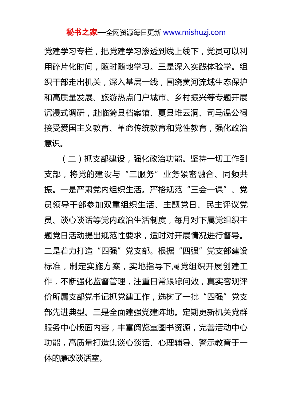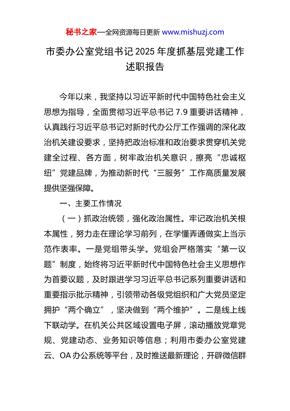 秘书之家—全网资源每日更新 www.mishuzj.com市委办公室党组书记 2025 年度抓基层党建工作述职报告 今年以来,我坚持以习近平新时代中国特色社会主义思想为指导,全面贯彻习近平总书记 7.9 重要讲话精神,认真践行习近平总书记对新时代办公厅工作强调的深化政治机关建设要求,坚持把政治标准和政治要求贯穿机关党建全过程、各方面,树牢政治机关意识,擦亮“忠诚枢纽”党建品牌,为推动新时代“三服务”工作高质量发展提供坚强保障。一、主要工作情况(一)抓政治统领,强化政治属性。牢记政治机关根本属性,努力走在理论学习前列,在学懂弄通做实上当示范作表率。一是党组带头学。党组会严格落实“第一议题”制度,始终将习近平新时代中国特色社会主义思想作为首要议题,及时跟进学习习近平总书记系列重要讲话和重要指示批示精神,引领带动各级党组织和广大党员坚定拥护“两个确立”,坚决做到“两个维护”。二是线上线下联动学。在机关公共区域设置电子屏,滚动播放党章党规、党建动态、业务知识等信息;利用市委办公室党建云、OA 办公系统等平台,及时推送最新理论,开辟微信群秘书之家—全网资源每日更新 www.mishuzj.com党建学习专栏,把党建学习渗透到线上线下,党员可以利用碎片化时间,随时随地学习。三是深入实践体验学。组织干部走出机关,深入基层一线,围绕黄河流域生态保护和高质量发展、旅游热点门户城市、乡村振兴等专题开展沉浸式调研,赴临猗县档案馆、夏县堆云洞、司马温公祠接受爱国主义教育、革命传统教育和党性教育,强化政治意识。(二)抓支部建设,强化政治功能。坚持一切工作到支部,将党的建设与“三服务”业务紧密融合、同频共振。一是严肃党内组织生活。严格规范“三会一课”、党员领导干部参加双重组织生活、主题党日、民主评议党员、谈心谈话等党内政治生活制度,每月对下属党组织主题党日活动提出规范性要求,适时对开展情况进行督导。二是着力打造“四强”党支部。根据“四强”党支部建设标准,制定实施方案,实地指导下属党组织开展创建工作,不断强化监督管理,注重日常跟踪问效,真实客观评价所属支部党书记抓党建工作,选树了一批“四强”党支部先进典型。三是全面建强党建阵地。定期更新机关党群服务中心版面内容,丰富阅览室图书资源,完善活动中心功能,高质量打造集谈心谈话、心理辅导、警示教育于一体的廉政谈话室。秘书之家—全网资源每日更新 www.mishuzj.com(三)抓党员管理,强化政治本色。探索创新党员教育管理方式,激发党员活力,彰显忠诚本色。一是注重党员教育培养。先后组织年轻党员干部赴苏州大学、浙江大学开展党务干部和新质生产力教育培训,提升服务发展能力。定期举办培训班,组织 18 名入党积极分子、9 名发展对象、7 名预备党员参加培训。组织年轻党员开展党的二十大精神学习宣讲,举办理论学习中心组党的二十大精神交流会,不断提升党性修养。二是积极参与社区治理。按照“社区吹哨、党员报到”要求,组织机关党员积极参与社区环境卫生整治、反诈宣传、文化传播等共建共创活动,深入开展“我为群众办实事”实践活动,办理各类实事好事 39 件,受到高度赞扬,社区居民赠送锦旗表示感谢。三是选树典型示范引领。开展“学习身边榜样”和“立足岗位作贡献”活动,选树优秀党员 26 名、清廉标杆部门 5个、清廉先进个人 10 人、党员先锋示范岗 15 个,发挥先锋模范作用。四是注重党内激励关怀。建立困难党员台账,有针对的结对帮扶,确保党员遇事有人管、困难有人帮、问题有人解决。坚持日常慰问和节日慰问相结合,每年“七一”前夕和春节期间,组织开展慰问老党员和困难党员活动,帮助他们解决揪心事、烦心事,把组织温暖送到党员心坎上。秘书之家—全网资源每日更新 www.mishuzj.com(四)抓工作落实,强化政治责任。强化党员干部政治责任,立足各项工作任务高标准完成,做好落实决策的“第一关”、推动工作的“第一棒”。一是深化调查研究。建立 13 个课题组,班子成员带头蹲点,围绕防范化解重大风险、盐湖保护利用、巩固拓展脱贫攻坚成果同乡村振兴有效衔接、优化营商环境等重大课题开展调查...