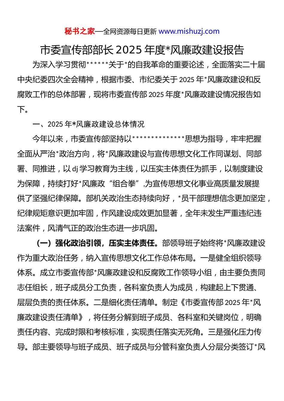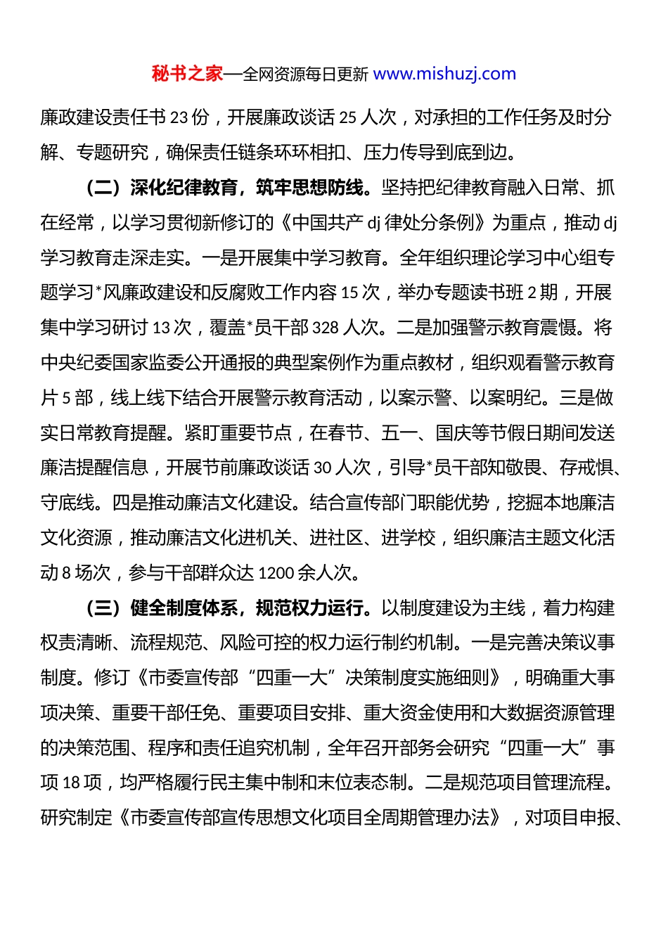 秘书之家—全网资源每日更新 www.mishuzj.com市委宣传部部长 2025 年度*风廉政建设报告为深入学习贯彻******关于*的自我革命的重要论述,全面落实二十届中央纪委四次全会精神,根据市委、市纪委关于 2025 年*风廉政建设和反腐败工作的总体部署,现将市委宣传部 2025 年度*风廉政建设情况报告如下。一、2025 年*风廉政建设总体情况今年以来,市委宣传部坚持以**************思想为指导,牢牢把握全面从严治*政治方向,将*风廉政建设与宣传思想文化工作同谋划、同部署、同推进,以 dj 学习教育为主线,以压实主体责任为抓手,以制度建设为保障,持续打好*风廉政“组合拳”,为宣传思想文化事业高质量发展提供了坚强纪律保障。部机关政治生态持续向好,*员干部理想信念更加坚定,纪律规矩意识更加牢固,作风建设成效更加显著,全年未发生严重违纪违法案件,风清气正的政治生态进一步巩固。(一)强化政治引领,压实主体责任。部领导班子始终将*风廉政建设作为重大政治任务,纳入宣传思想文化工作总体布局。一是健全组织领导体系。成立市委宣传部*风廉政建设和反腐败工作领导小组,由主要负责同志任组长,班子成员分工负责,各科室负责人为成员,构建起上下贯通、层层负责的责任体系。二是细化责任清单。制定《市委宣传部 2025 年*风廉政建设责任清单》,将任务分解到班子成员、各科室和关键岗位,明确责任内容、完成时限和考核标准,实现责任落实无死角。三是强化压力传导。部主要领导与班子成员、班子成员与分管科室负责人分层分类签订*风秘书之家—全网资源每日更新 www.mishuzj.com廉政建设责任书 23 份,开展廉政谈话 25 人次,对承担的工作任务及时分解、专题研究,确保责任链条环环相扣、压力传导到底到边。(二)深化纪律教育,筑牢思想防线。坚持把纪律教育融入日常、抓在经常,以学习贯彻新修订的《中国共产 dj 律处分条例》为重点,推动 dj学习教育走深走实。一是开展集中学习教育。全年组织理论学习中心组专题学习*风廉政建设和反腐败工作内容 15 次,举办专题读书班 2 期,开展集中学习研讨 13 次,覆盖*员干部 328 人次。二是加强警示教育震慑。将中央纪委国家监委公开通报的典型案例作为重点教材,组织观看警示教育片 5 部,线上线下结合开展警示教育活动,以案示警、以案明纪。三是做实日常教育提醒。紧盯重要节点,在春节、五一、国庆等节假日期间发送廉洁提醒信息,开展节前廉政谈话 30 人次,引导*员干部知敬畏、存戒惧、守底线。四是推动廉洁文化建设。结合宣传部门职能优势,挖掘本地廉洁文化资源,推动廉洁文化进机关、进社区、进学校,组织廉洁主题文化活动 8 场次,参与干部群众达 1200 余人次。(三)健全制度体系,规范权力运行。以制度建设为主线,着力构建权责清晰、流程规范、风险可控的权力运行制约机制。一是完善决策议事制度。修订《市委宣传部“四重一大”决策制度实施细则》,明确重大事项决策、重要干部任免、重要项目安排、重大资金使用和大数据资源管理的决策范围、程序和责任追究机制,全年召开部务会研究“四重一大”事项 18 项,均严格履行民主集中制和末位表态制。二是规范项目管理流程。研究制定《市委宣传部宣传思想文化项目全周期管理办法》,对项目申报、秘书之家—全网资源每日更新 www.mishuzj.com评审、实施、验收、资金支付等环节实行全流程监管,建立项目廉政风险防控台账,排查廉政风险点 12 个,制定针对性防控措施 36 条。三是强化资金监督管理。严格执行财经纪律,完善《市委宣传部宣传专项经费使用管理办法》,实行经费先审后用、专款专用,全年审核各类经费支出 156笔,涉及金额 896 万元,未发现违规使用问题。四是建立常态化督查机制。针对违规吃喝、违规收送礼品礼金等突出问题,建立月度自查、季度抽查、半年督查的立体监督体系,开展专项督查 4 次,发现并督促整改问题 6 个。二、主要工作举措及成效(一)以“责任链”织密廉政屏障,筑牢廉政建设“指挥链”。牢牢牵住责任制这个“牛鼻子”,构建横向到边、纵向到底的责任体系。一是强化顶层设计。将*风廉政建设责任制...