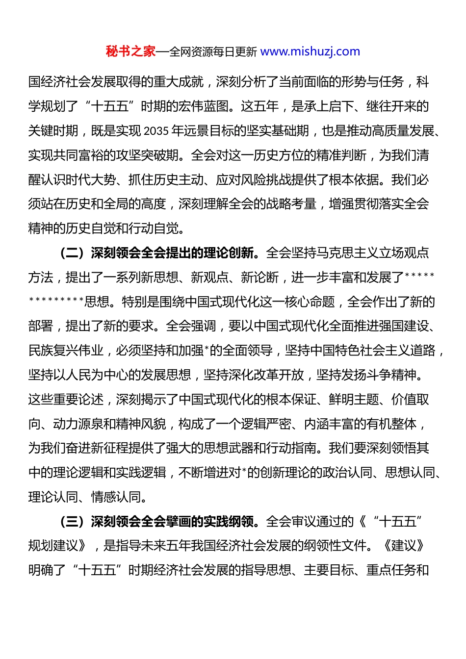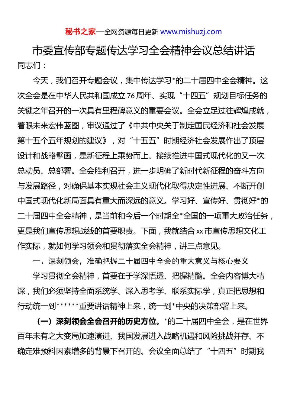 秘书之家—全网资源每日更新 www.mishuzj.com市委宣传部专题传达学习全会精神会议总结讲话同志们:今天,我们召开专题会议,集中传达学习*的二十届四中全会精神。这次全会是在中华人民共和国成立 76 周年、实现“十四五”规划目标任务的关键之年召开的一次具有里程碑意义的重要会议。全会立足过往辉煌成就,着眼未来宏伟蓝图,审议通过了《中共中央关于制定国民经济和社会发展第十五个五年规划的建议》,对“十五五”时期经济社会发展作出了顶层设计和战略擘画,是新征程上乘势而上、接续推进中国式现代化的又一次总动员、总部署。全会胜利召开,进一步明确了新时代新征程的奋斗方向与发展路径,对确保基本实现社会主义现代化取得决定性进展、不断开创中国式现代化新局面具有重大而深远的意义。学习好、宣传好、贯彻好*的二十届四中全会精神,是当前和今后一个时期全*全国的一项重大政治任务,更是我们宣传思想战线的首要职责。下面,我就结合 xx 市宣传思想文化工作实际,就如何学习领会和贯彻落实全会精神,讲三点意见。一、深刻领会,准确把握二十届四中全会的重大意义与核心要义学习贯彻全会精神,首要在于学深悟透、把握精髓。全会内容博大精深,我们必须坚持全面系统学、深入思考学、联系实际学,真正把思想和行动统一到******重要讲话精神上来,统一到*中央的决策部署上来。(一)深刻领会全会召开的历史方位。*的二十届四中全会,是在世界百年未有之大变局加速演进、我国发展进入战略机遇和风险挑战并存、不确定难预料因素增多的背景下召开的。会议全面总结了“十四五”时期我秘书之家—全网资源每日更新 www.mishuzj.com国经济社会发展取得的重大成就,深刻分析了当前面临的形势与任务,科学规划了“十五五”时期的宏伟蓝图。这五年,是承上启下、继往开来的关键时期,既是实现 2035 年远景目标的坚实基础期,也是推动高质量发展、实现共同富裕的攻坚突破期。全会对这一历史方位的精准判断,为我们清醒认识时代大势、抓住历史主动、应对风险挑战提供了根本依据。我们必须站在历史和全局的高度,深刻理解全会的战略考量,增强贯彻落实全会精神的历史自觉和行动自觉。(二)深刻领会全会提出的理论创新。全会坚持马克思主义立场观点方法,提出了一系列新思想、新观点、新论断,进一步丰富和发展了**************思想。特别是围绕中国式现代化这一核心命题,全会作出了新的部署,提出了新的要求。全会强调,要以中国式现代化全面推进强国建设、民族复兴伟业,必须坚持和加强*的全面领导,坚持中国特色社会主义道路,坚持以人民为中心的发展思想,坚持深化改革开放,坚持发扬斗争精神。这些重要论述,深刻揭示了中国式现代化的根本保证、鲜明主题、价值取向、动力源泉和精神风貌,构成了一个逻辑严密、内涵丰富的有机整体,为我们奋进新征程提供了强大的思想武器和行动指南。我们要深刻领悟其中的理论逻辑和实践逻辑,不断增进对*的创新理论的政治认同、思想认同、理论认同、情感认同。(三)深刻领会全会擘画的实践纲领。全会审议通过的《“十五五”规划建议》,是指导未来五年我国经济社会发展的纲领性文件。《建议》明确了“十五五”时期经济社会发展的指导思想、主要目标、重点任务和秘书之家—全网资源每日更新 www.mishuzj.com重大举措,具有极强的政治性、战略性、指导性和可操作性。其核心要义,就是牢牢把握高质量发展这一首要任务,加快构建新发展格局。全会部署了建设现代化产业体系、加快实现高水平科技自立自强、促进城乡区域协调发展、全面推进乡村振兴、推动绿色低碳发展、实行高水平对外开放、增进民生福祉、推进国家安全体系和能力现代化等一系列重大任务。这些部署,纲举目张,目标明确,路径清晰,是破解发展难题、厚植发展优势的关键之举。我们要逐字逐句研读,逐条逐项对照,全面把握其核心要义与实践要求,确保我们的各项工作始终沿着全会指引的方向前进。二、对标对表,以全会精神引领 xx 市宣传思想文化工作守正创新学习的目的全在于运用。全市宣传思想文化战线必须紧密联系 xx 市改革发展实际和宣传思想工作职责,自觉把全会精神转化为...