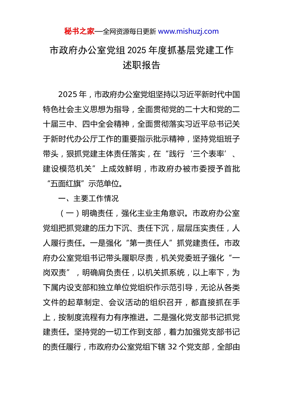秘书之家—全网资源每日更新 www.mishuzj.com市政府办公室党组 2025 年度抓基层党建工作述职报告 2025 年,市政府办公室党组坚持以习近平新时代中国特色社会主义思想为指导,全面贯彻党的二十大和党的二十届三中、四中全会精神,全面贯彻落实习近平总书记关于新时代办公厅工作的重要指示批示精神,坚持党组班子带头,狠抓党建主体责任落实,在“践行‘三个表率’、建设模范机关”上成效鲜明,市政府办被市委授予首批“五面红旗”示范单位。一、主要工作情况(一)明确责任,强化主业主角意识。市政府办公室党组把抓党建的压力下沉、责任下沉,层层压实责任,人人履行责任。一是强化“第一责任人”抓党建责任。市政府办公室党组书记带头履职尽责,机关党委班子强化“一岗双责”,明确肩负责任,以机关抓系统,以上率下,为下属内设支部和独立单位党组织作示范引导,无论从各类文件的起草制定、会议活动的组织召开,都直接抓在手上,按制度流程有力有序推进。二是强化党支部书记抓党建责任。坚持党的一切工作到支部,着力加强党支部书记的责任履行,市政府办公室党组下辖 32 个党支部,全部由秘书之家—全网资源每日更新 www.mishuzj.com各独立县处级单位主要负责同志或班子成员担任党(总)支部书记,切实发挥“一线指挥员”的作用。每月的支部主题党日活动,各支部书记和支委委员都提前研究、细化方案,做好“+”的文章,确保活动走深走实;市领导以身作则,积极以普通党员身份参加,带动支部的战斗堡垒作用持续增强。三是强化机关党办抓党建责任。党建工作事务多责任大头绪杂,必须把机关党办这个“指挥部”建强,确保工作有条不紊全面落实。市政府办公室党组在配强机关党务干部的同时,完善工作机制,优化工作流程,注重发挥机关党办在综合协调、督促检查的独特作用。(二)履行责任,狠抓重点任务落实。市政府办公室党组牢固树立“抓机关党建是本职、不抓机关党建是失职、抓不好机关党建是渎职”的理念,以每年印发的市直机关党建工作要点为抓手,多措并举抓落实,增强党组织的政治功能和组织功能。一是旗帜鲜明讲政治。坚持“第一议题”制度,把学习贯彻习近平新时代中国特色社会主义思想作为理论武装的必修课,引导广大党员干部对党的创新理论常学常新、常悟常进,自觉做坚定信仰者和忠实实践者。二是固本强基增活力。围绕增强基层党组织政治功能和组织功能,定期换届选举,开展党务干部培训,选优配强党支部班子,规范党组织设置;严格落实“三会一秘书之家—全网资源每日更新 www.mishuzj.com课”,创新“主题党日+”,强化组织生活制度执行;推动创建“四强”党支部并有效发挥典型引领作用,第一党支部被评为全市“十佳党支部”。三是深度融合提质效。在“七一”等重要时间节点开展主题鲜明、丰富多彩的文体活动,有效提升组织凝聚力战斗力。组织机关党组织和在职党员“双报到”,深入社区参与基层治理,助力文明城市创建等,每年协调办理民生实事 10 余件。四是围绕中心促发展。开展“政府公报走进河东驿站”活动,利用政府网站发布各类民生信息 800 余条,切实把政策向群众“传达到、讲清楚”。在全省率先完成 16 条非紧急类热线归并,实现“12345”一个号码全天候人工服务,综合满意率98%以上。市人大代表建议、市政协提案全部高质量按时办结。市民投诉受理中心连续获评全国政务热线优秀单位,被省人社厅、省妇联授予“省三八红旗集体”荣誉称号,被全国妇联授予“全国巾帼文明岗”。五是从严治党筑屏障。扎实开展深入贯彻学习教育,开展“亮丑揭短”专项行动,持续向“浮庸懒滑慢贪”等顽瘴痼疾开刀,引导党员干部担当作为、干事创业;开展经常性谈心谈话、随机性教育引导,每逢节日必“肃纪”,时刻警醒党员干部不越“雷池”、不踩“红线”、守住底线;突出人、财、物等重点管理岗位,制定《廉政风险点排查及防范措秘书之家—全网资源每日更新 www.mishuzj.com施清单》,加强常态化监督检查。(三)落实责任,健全完善工作机制。市政府办公室党组逐步完善机关党建相关工作机制,持续压紧压实党建主体责任,为机关党建高质量发展提供有力保障。一是压...