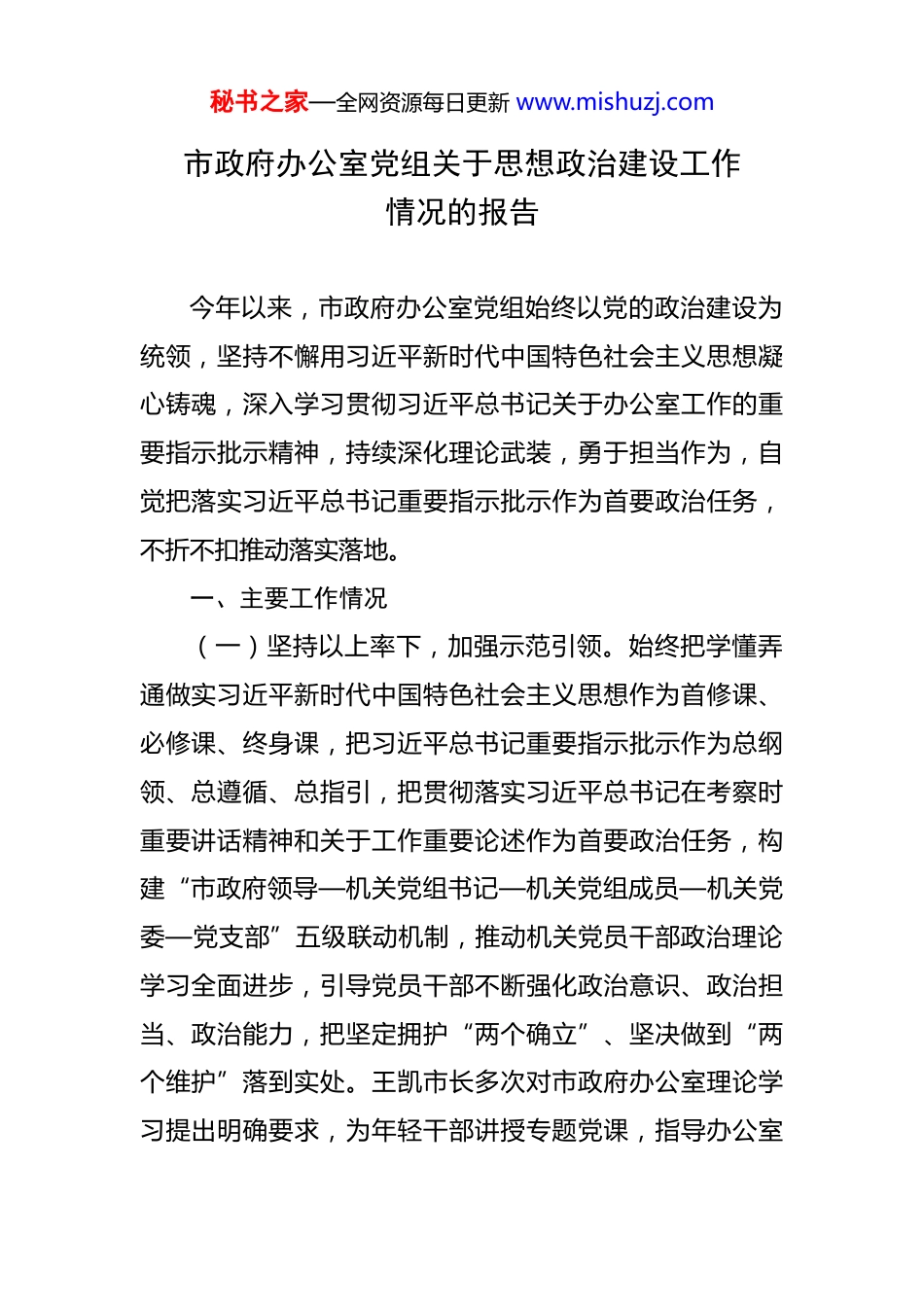 秘书之家—全网资源每日更新 www.mishuzj.com市政府办公室党组关于思想政治建设工作情况的报告 今年以来,市政府办公室党组始终以党的政治建设为统领,坚持不懈用习近平新时代中国特色社会主义思想凝心铸魂,深入学习贯彻习近平总书记关于办公室工作的重要指示批示精神,持续深化理论武装,勇于担当作为,自觉把落实习近平总书记重要指示批示作为首要政治任务,不折不扣推动落实落地。一、主要工作情况(一)坚持以上率下,加强示范引领。始终把学懂弄通做实习近平新时代中国特色社会主义思想作为首修课、必修课、终身课,把习近平总书记重要指示批示作为总纲领、总遵循、总指引,把贯彻落实习近平总书记在考察时重要讲话精神和关于工作重要论述作为首要政治任务,构建“市政府领导—机关党组书记—机关党组成员—机关党委—党支部”五级联动机制,推动机关党员干部政治理论学习全面进步,引导党员干部不断强化政治意识、政治担当、政治能力,把坚定拥护“两个确立”、坚决做到“两个维护”落到实处。王凯市长多次对市政府办公室理论学习提出明确要求,为年轻干部讲授专题党课,指导办公室秘书之家—全网资源每日更新 www.mishuzj.com开展理论学习,市政府党组学习研讨时适时安排机关党组成员参加。各位副市长以普通党员身份参加组织关系所在支部学习研讨,为党员干部讲党课,有力传导了从严要求。机关党组书记切实履行第一责任人职责,严格落实“第一议题”制度,主持召开机关党组(扩大)会议进行理论学习,主持党组理论学习中心组集体交流研讨,并为全室党员干部讲授专题党课。机关党组成员严格落实“一岗双责”,切实加强对分管处室(单位)和联系支部理论学习的指导和督促检查,并讲授专题党课。机关党委在党组领导下精心制定学习方案,周密组织研讨交流,强化督导检验学习效果。各党支部严格落实“三会一课”、主题党日等制度,将理论学习融入日常、抓在经常。(二)高举思想旗帜,持续凝心铸魂。坚持读原著、学原文、悟原理、知原义,学好用好《习近平谈治国理政》第五卷等权威著作,每月制定《政治理论学习计划》、每周编发《一周学习材料》,及时跟进学习习近平总书记最新讲话、署名文章和指示批示精神,并通过纸质文件、办公室内网、OA 办公系统等多种方式推送至各党支部和广大党员干部学习,督促党员干部充分利用“学习强国”“干部网络学院”等平台抓好即时学习,引导党员干部学懂弄通做实党的创新理论,使其成为指导工作的科学秘书之家—全网资源每日更新 www.mishuzj.com指引和根本遵循。修订《市政府机关党组理论学习中心组学习制度》,每年印发分专题集体学习计划明确重点内容。机关党组理论学习中心组集体学习重在研讨,范围扩大至各党支部书记参与学习交流,发挥“关键少数”的示范带动作用。深化政治机关意识教育和对党忠诚教育,推动理想信念教育常态化制度化,在各类培训教育中把政治理论学习内容作为重点,在学思践悟上下功夫,不断增强政治判断力、政治领悟力、政治执行力。(三)勇于担当作为,推动落地见效。牢固树立政治意识,把贯彻落实习近平总书记重要指示批示精神作为首要政治责任、领导责任、工作责任,全面准确把握、一以贯之执行,确保条条落实、件件落地、事事见效。对习近平总书记重要讲话重要指示批示第一时间传达学习、第一时间安排部署,王凯市长亲自部署,分管副市长主动认领,相关部门狠抓落实,制度化管理、项目化推进、台账化跟踪、常态化督导,持续优化专人负责、专班推进、专件督办的“三专”工作机制,逐字逐句对标细化举措、逐件逐项制定落实方案,形成传达学习、任务落实、督促检查、结果报告的全过程闭环,常态化开展“回头看”,确保高标准、高效率、高质量落实。二、下一步工作打算秘书之家—全网资源每日更新 www.mishuzj.com(一)强化理论武装,筑牢思想根基。坚持把政治建设摆在首位,以习近平新时代中国特色社会主义思想为指导,建立“第一议题”学习制度,将习近平总书记关于办公厅工作的重要指示批示精神作为必学内容。完善中心组学习机制,每月开展 1 次集中研讨,班子成员每年领学专题不少于 4 个、撰写调研...