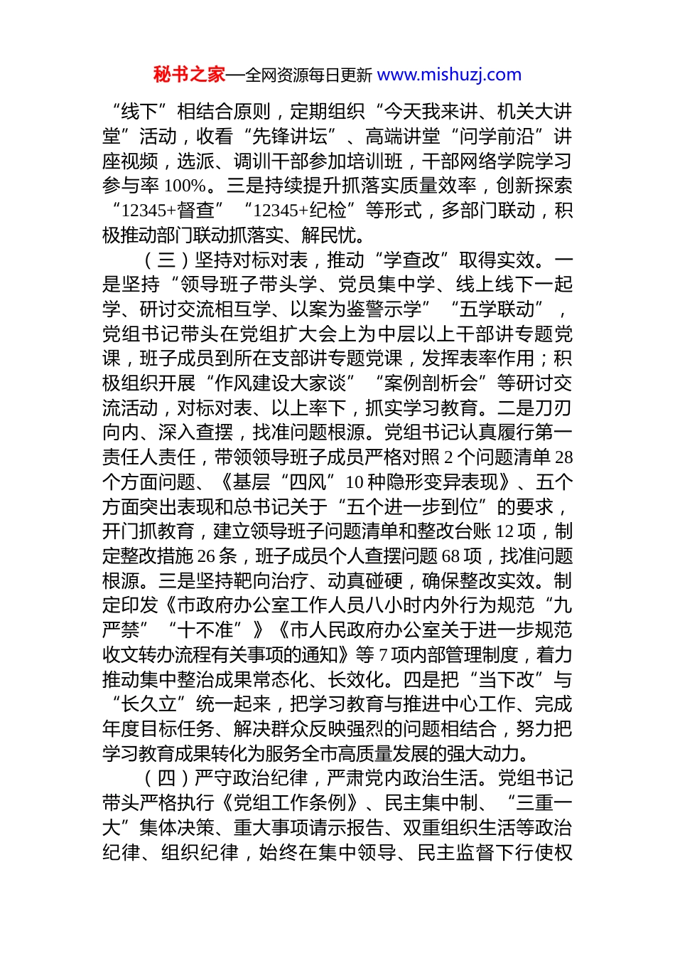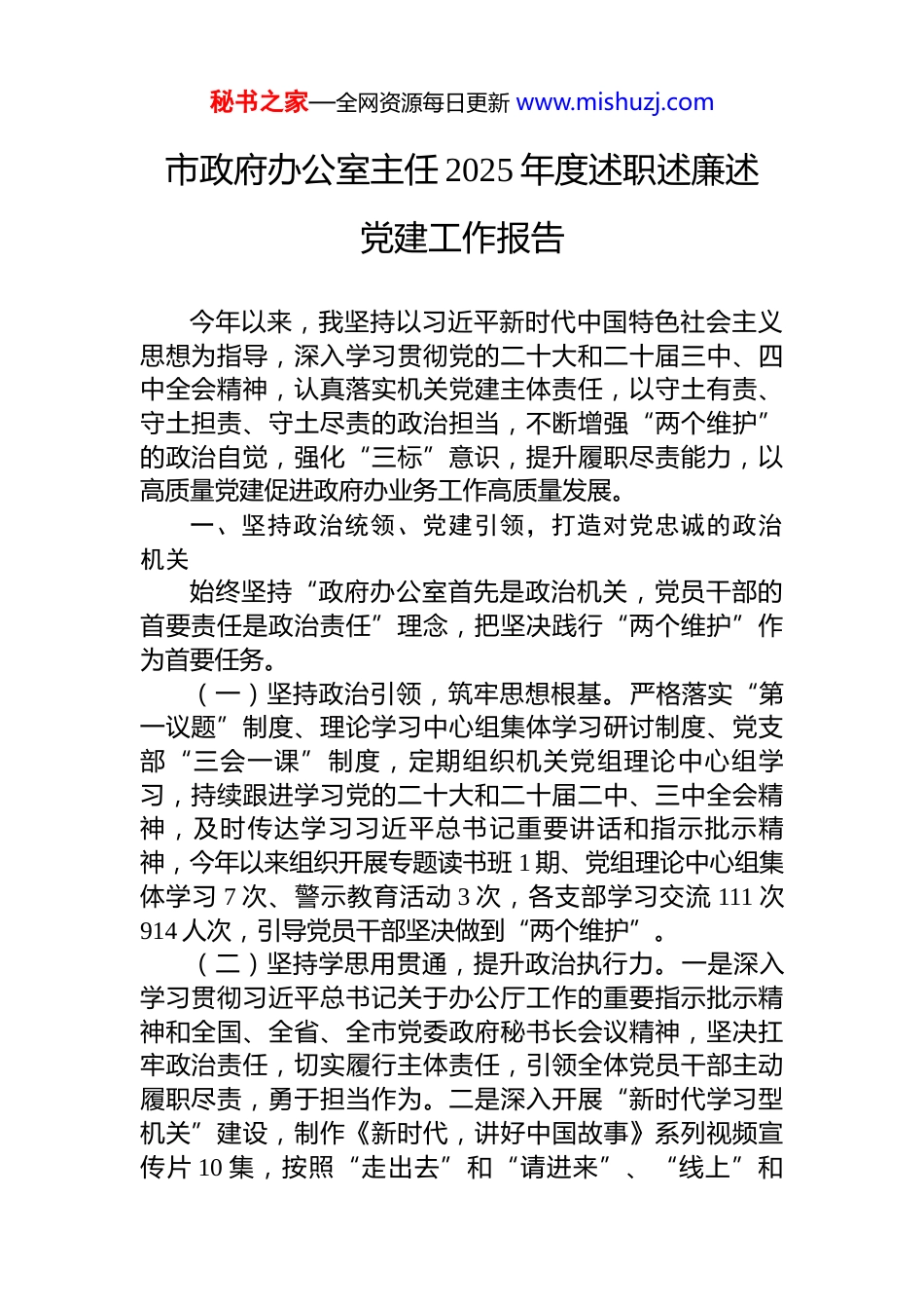 秘书之家—全网资源每日更新 www.mishuzj.com市政府办公室主任 2025 年度述职述廉述党建工作报告今年以来,我坚持以习近平新时代中国特色社会主义思想为指导,深入学习贯彻党的二十大和二十届三中、四中全会精神,认真落实机关党建主体责任,以守土有责、守土担责、守土尽责的政治担当,不断增强“两个维护”的政治自觉,强化“三标”意识,提升履职尽责能力,以高质量党建促进政府办业务工作高质量发展。一、坚持政治统领、党建引领,打造对党忠诚的政治机关始终坚持“政府办公室首先是政治机关,党员干部的首要责任是政治责任”理念,把坚决践行“两个维护”作为首要任务。(一)坚持政治引领,筑牢思想根基。严格落实“第一议题”制度、理论学习中心组集体学习研讨制度、党支部“三会一课”制度,定期组织机关党组理论中心组学习,持续跟进学习党的二十大和二十届二中、三中全会精神,及时传达学习习近平总书记重要讲话和指示批示精神,今年以来组织开展专题读书班 1 期、党组理论中心组集体学习 7 次、警示教育活动 3 次,各支部学习交流 111 次914 人次,引导党员干部坚决做到“两个维护”。(二)坚持学思用贯通,提升政治执行力。一是深入学习贯彻习近平总书记关于办公厅工作的重要指示批示精神和全国、全省、全市党委政府秘书长会议精神,坚决扛牢政治责任,切实履行主体责任,引领全体党员干部主动履职尽责,勇于担当作为。二是深入开展“新时代学习型机关”建设,制作《新时代,讲好中国故事》系列视频宣传片 10 集,按照“走出去”和“请进来”、“线上”和秘书之家—全网资源每日更新 www.mishuzj.com“线下”相结合原则,定期组织“今天我来讲、机关大讲堂”活动,收看“先锋讲坛”、高端讲堂“问学前沿”讲座视频,选派、调训干部参加培训班,干部网络学院学习参与率 100%。三是持续提升抓落实质量效率,创新探索“12345+督查”“12345+纪检”等形式,多部门联动,积极推动部门联动抓落实、解民忧。(三)坚持对标对表,推动“学查改”取得实效。一是坚持“领导班子带头学、党员集中学、线上线下一起学、研讨交流相互学、以案为鉴警示学”“五学联动”,党组书记带头在党组扩大会上为中层以上干部讲专题党课,班子成员到所在支部讲专题党课,发挥表率作用;积极组织开展“作风建设大家谈”“案例剖析会”等研讨交流活动,对标对表、以上率下,抓实学习教育。二是刀刃向内、深入查摆,找准问题根源。党组书记认真履行第一责任人责任,带领领导班子成员严格对照 2 个问题清单 28个方面问题、《基层“四风”10 种隐形变异表现》、五个方面突出表现和总书记关于“五个进一步到位”的要求,开门抓教育,建立领导班子问题清单和整改台账 12 项,制定整改措施 26 条,班子成员个人查摆问题 68 项,找准问题根源。三是坚持靶向治疗、动真碰硬,确保整改实效。制定印发《市政府办公室工作人员八小时内外行为规范“九严禁”“十不准”》《市人民政府办公室关于进一步规范收文转办流程有关事项的通知》等 7 项内部管理制度,着力推动集中整治成果常态化、长效化。四是把“当下改”与“长久立”统一起来,把学习教育与推进中心工作、完成年度目标任务、解决群众反映强烈的问题相结合,努力把学习教育成果转化为服务全市高质量发展的强大动力。(四)严守政治纪律,严肃党内政治生活。党组书记带头严格执行《党组工作条例》、民主集中制、“三重一大”集体决策、重大事项请示报告、双重组织生活等政治纪律、组织纪律,始终在集中领导、民主监督下行使权秘书之家—全网资源每日更新 www.mishuzj.com力、履行职责,班子成员以普通党员身份积极参加支部活动、支部组织生活会,对照党章党规党纪、岗位职责要求,深入查摆问题,严肃开展批评与自我批评。(五)守牢意识形态阵地,提升本质安全。严格履行意识形态责任制,全面压实班子成员和支部书记“四种责任”“八项任务”,机关党组会议每季度听取并研究意识形态工作。强化意识形态阵地建设和管理,扎实开展省委、市委巡视意识形态工作责任制相关问题整改工作。开展微信群、QQ 群、互联网邮箱专项清理...