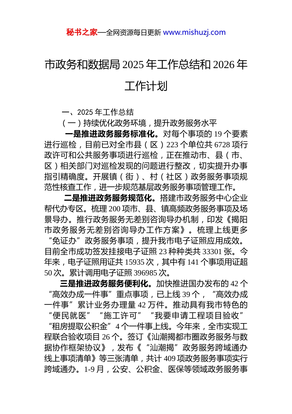 秘书之家—全网资源每日更新 www.mishuzj.com市政务和数据局 2025 年工作总结和 2026 年工作计划 一、2025 年工作总结(一)持续优化政务环境,提升政务服务水平 一是推进政务服务标准化。对每个事项的 19 个要素进行巡检,目前已对全市县(区)223 个单位共 6728 项行政许可和公共服务事项进行巡检,正在推动市、县(市、区)相关部门对巡检发现的问题进行整改,切实提升办事指引精确度。开展镇(街)、村(社区)政务服务事项规范性核查工作,进一步规范基层政务服务事项管理工作。 二是推进政务服务规范化。搭建市政务服务中心企业帮代办专区。梳理 200 项市、县、镇高频政务服务事项及场景导办。推行政务服务无差别咨询导办机制,印发《揭阳市政务服务无差别咨询导办工作方案》。梳理上线更多“免证办”政务服务事项,提升我市电子证照应用成效。目前全市成功签发挂接电子证照 23 种种类共 33301 张。今年来,电子证照用证共 15935 次,其中有 141 个事项用证超50 次。累计调用电子证照 396985 次。三是推进政务服务便利化。加快推进国办发布的 42 个“高效办成一件事”重点事项,已上线 39 个,“高效办成一件事”累计业务办理量 42 万件。推动具有我市特色的“便民就医”“施工许可”“我要申请工程项目验收”“租房提取公积金”4 个一件事上线。今年来,全市实现工程联合验收项目 26 个。签订《汕潮揭都市圈政务服务与数据协作框架协议》,发布《“汕潮揭”政务服务跨域通办线上事项清单》等三张清单,共计 409 项政务服务事项实行跨域通办。1-9 月,公安、公积金、医保等领域政务服务事秘书之家—全网资源每日更新 www.mishuzj.com项的“汕潮揭”跨域通办业务量为 4004 件。完善《揭阳市政务服务“好差评”实施细则(试行)》,构建完善评价整改、反馈、监督全流程衔接的政务服务评价机制。今年来,全市政务服务质量均在 9.8 分以上,人员服务质量 5 星(10 分),差评整改率 100%,位居全省前列。 四是公共资源交易方面。1-9 月,共完成各类公共资源交易项目 421 个,总成交金额 xx 亿元,节约金额 4.85 亿元,增值金额 xx 亿元,节约率 4.31%,增值率 15.06 %。创新招投标管理机制,强化全流程全链条监管。市公共资源交易中心电子交易平台完成与全国共享互认 ca 平台对接工作,我市招投标领域正式实现移动数字证书全国互认。全面推行电子化招投标,全流程信息公开率达 100%。推行“不见面”开标,开标项目比例达 100%。实行远程异地评标。今年共完成 35 宗远程异地评标项目,其中 2 宗跨省异地评标。建设工程交易项目推进电子保函服务应用,共开出保函1110 张,代替保证金约 1.63 亿元。梳理*的十八大以来全市依法必须招标的工程建设项目情况,汇总项目 2259 宗,按照 1.5%的比例随机抽查项目 34 宗,核查处理 1 宗档案缺失项目。 (二)推进数字政府建设,提高政府数字化基础能力 一是积极争取上级资金,推动我市数字化基础建设。2025 年共争取省级均衡化奖补资金 xx 万元,其中竞争性分配资金 xx 万元,拟建设 6 个项目,目前已完成 5 个项目立项。 二是逐步提升数字化基础设施集约化支撑能力。加强政务云管理和建设,截至目前共有 59 个系统部署上数字政府云、66 个系统部署上信创云。建成国产商用密码资源池并对政务云上的系统开放,目前已完成 25 个云上系统的对接授权。升级政务外网核心设备,构建“一网多平面”逻辑网络架构,满足各地各单位差异化业务需求;完成政务外网市级到各县(市、区)骨干网主备线路建设,部署 5g秘书之家—全网资源每日更新 www.mishuzj.com政务外网无线接入方式,形成市、县(市、区)、镇(街)、村(居)四级广域全覆盖。 三是不断强化数字政府网络安全体系建设。部署并深化应用市数字政府网络安全运营平台,持续监测数字政府网络安全态势。组建安全运营技术团队,建立网络安全风险监测和处置工作机制,重点为市 12345 热线平台等 23 个重要政务信息系统开展专项安全检测。(三)推动数字政府建设成果落地应用,以数字化赋...