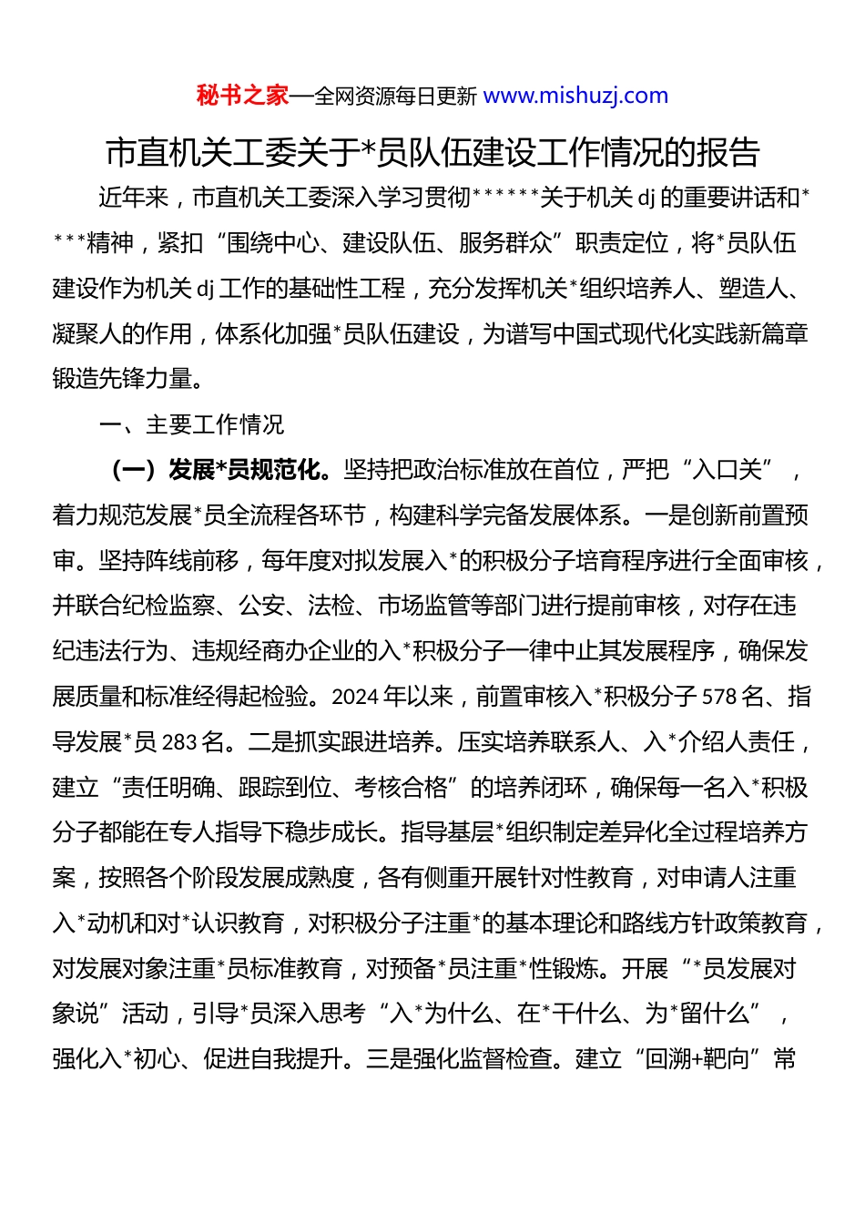 秘书之家—全网资源每日更新 www.mishuzj.com市直机关工委关于*员队伍建设工作情况的报告近年来,市直机关工委深入学习贯彻******关于机关 dj 的重要讲话和****精神,紧扣“围绕中心、建设队伍、服务群众”职责定位,将*员队伍建设作为机关 dj 工作的基础性工程,充分发挥机关*组织培养人、塑造人、凝聚人的作用,体系化加强*员队伍建设,为谱写中国式现代化实践新篇章锻造先锋力量。一、主要工作情况(一)发展*员规范化。坚持把政治标准放在首位,严把“入口关”,着力规范发展*员全流程各环节,构建科学完备发展体系。一是创新前置预审。坚持阵线前移,每年度对拟发展入*的积极分子培育程序进行全面审核,并联合纪检监察、公安、法检、市场监管等部门进行提前审核,对存在违纪违法行为、违规经商办企业的入*积极分子一律中止其发展程序,确保发展质量和标准经得起检验。2024 年以来,前置审核入*积极分子 578 名、指导发展*员 283 名。二是抓实跟进培养。压实培养联系人、入*介绍人责任,建立“责任明确、跟踪到位、考核合格”的培养闭环,确保每一名入*积极分子都能在专人指导下稳步成长。指导基层*组织制定差异化全过程培养方案,按照各个阶段发展成熟度,各有侧重开展针对性教育,对申请人注重入*动机和对*认识教育,对积极分子注重*的基本理论和路线方针政策教育,对发展对象注重*员标准教育,对预备*员注重*性锻炼。开展“*员发展对象说”活动,引导*员深入思考“入*为什么、在*干什么、为*留什么”,强化入*初心、促进自我提升。三是强化监督检查。建立“回溯+靶向”常秘书之家—全网资源每日更新 www.mishuzj.com态督查机制,对上年度发展的正式*员进行回溯抽检,扎实做好“回头看”。采取线上线下相结合的方式,灵活运用发展对象提级审查、预备*员转正“二次审查”等做法,对发展*员工作进行常态化检查指导,2024 年以来,对查出的 167 个问题逐一督促整改,确保程序规范、手续完备,杜绝“带病入*”。(二)教育管理系统化。抓实*员教育这项基础性、经常性工作,延伸管理链条,构建系统化*员教育管理机制。一是以理论武装强化*员意识。创新“第一专题”学习制度,组织市直机关基层*组织跟进学习******重要讲话和****批示精神。制定机关*员理论学习意见,每月下发工作提醒,指导基层*组织综合运用“三会一课”、主题联学等方式,在组织生活中常态化学习**************思想。聚焦青年*员,建立青年理论学习小组 399 个,定期邀请专家授课、开展研讨交流,打造青年理论学习品牌。二是以教育培训提升能力素质。加强*员教育资源建设,举办全市*员教育好教材进机关活动,打造*员教育现场教学点 52 个、*员教育电视片 20 余部。开展“学习身边榜样”“*课开讲啦”“我和我的支部”等*员教育系列活动,组织*员进*校培训 72 期、培训 6236 人,推动广大*员淬炼思想、提升境界、增强本领。三是以正风肃纪锻造过硬作风。将清廉机关建设作为全面从严治*的重要内容,纳入机关 dj 总体布局,建立“五廉共建”机制,召开现场观摩推进会议,分类建设清廉机关示范点,培育特色廉洁品牌,引导机关*员干部见贤思齐、廉洁奉公。印发机关纪律检查委员会工作规则,加强机关纪检干部队伍建设,严格换届审批、备案审查等制度,组织现场述职评秘书之家—全网资源每日更新 www.mishuzj.com议,开展业务培训,编印实务手册,推进机关纪委监督实起来、执纪硬起来、作用发挥强起来。(三)服务*员精细化。坚持以需求为导向、精准为标尺、实效为目标,不断增强*员荣誉感、归属感、使命感。一是建强服务队伍。把建强*务干部队伍作为服务机关*员的重要措施,制定《进一步提升*务干部素质能力七条措施》,分级分类培训机关*组织书记、专兼职*务干部 1900 余人,努力把*务干部培养成为政治上的明白人、dj 工作的内行人、干部职工的贴心人。加强工委队伍自身建设,建立 dj 理论和业务知识先学机制,开展轮岗交流、修订制度规范、优化服务流程,着力提升工委干部队伍服务能力。二是丰富多元供给。开展机关 dj 工作起底式调研,实现市直部门全覆盖;建立“*务干部面对面”...