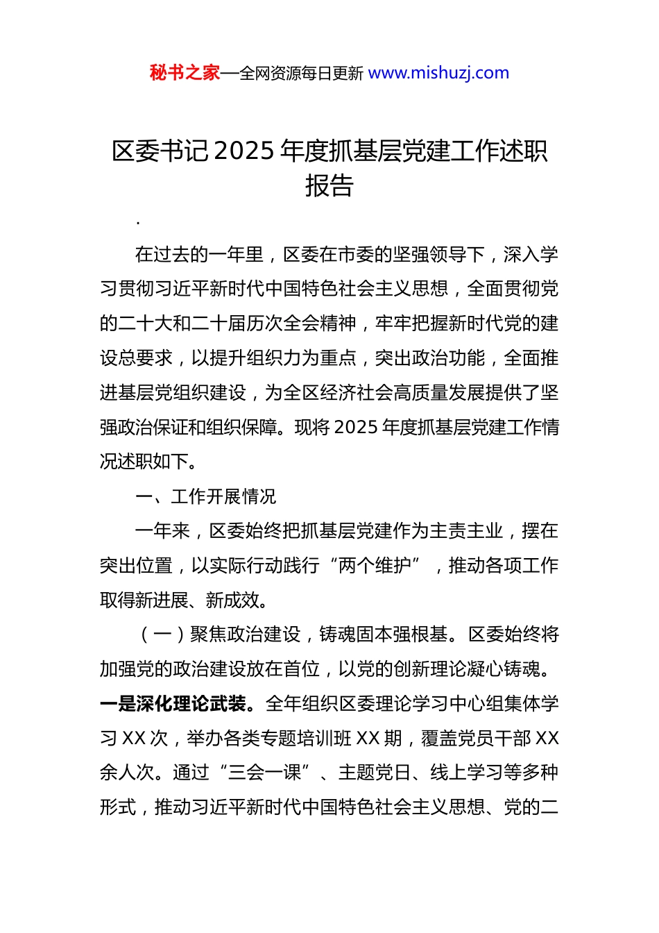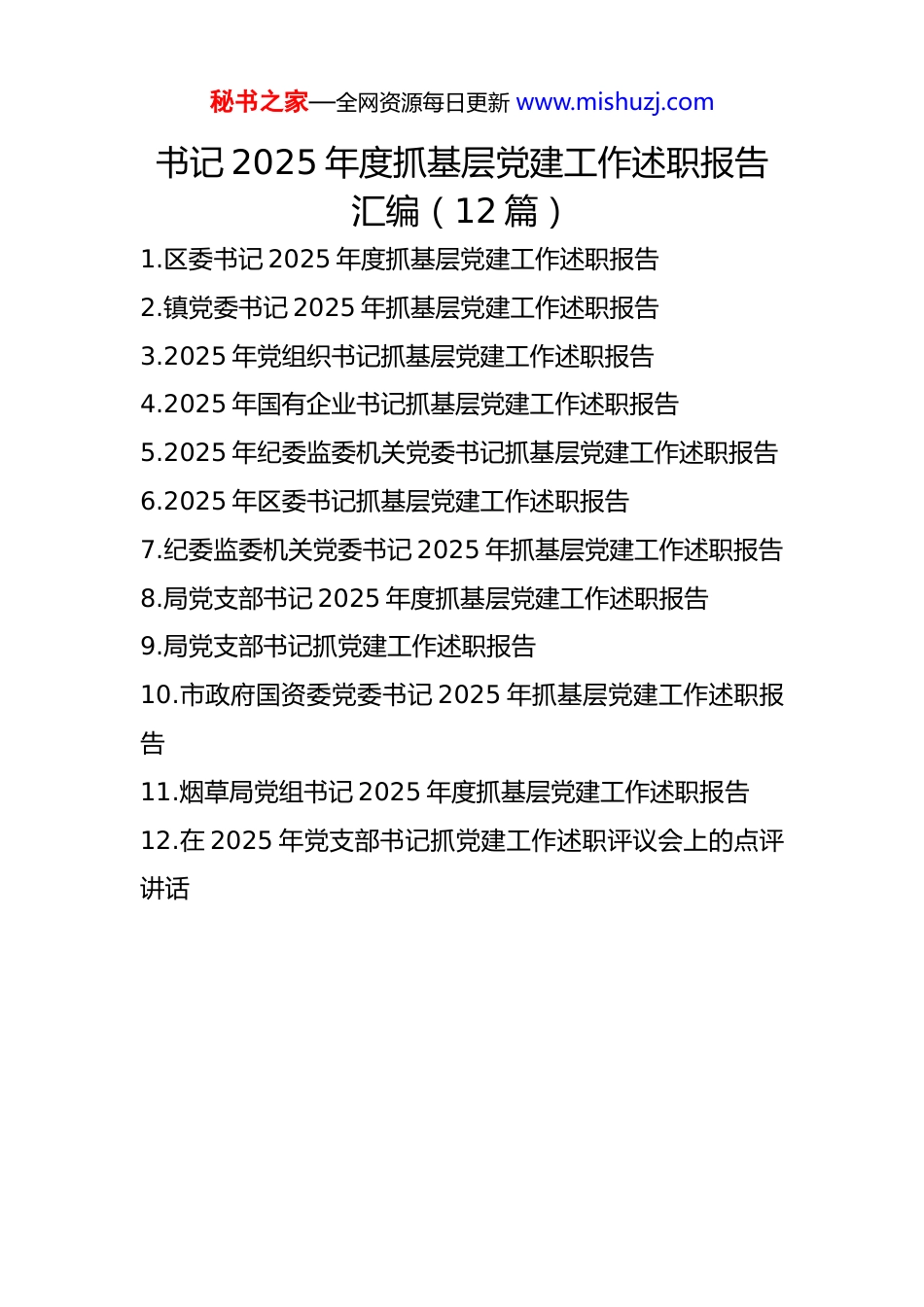 秘书之家—全网资源每日更新 www.mishuzj.com书记 2025 年度抓基层党建工作述职报告汇编(12 篇)1.区委书记 2025 年度抓基层党建工作述职报告2.镇党委书记 2025 年抓基层党建工作述职报告3.2025 年党组织书记抓基层党建工作述职报告4.2025 年国有企业书记抓基层党建工作述职报告5.2025 年纪委监委机关党委书记抓基层党建工作述职报告6.2025 年区委书记抓基层党建工作述职报告7.纪委监委机关党委书记 2025 年抓基层党建工作述职报告8.局党支部书记 2025 年度抓基层党建工作述职报告9.局党支部书记抓党建工作述职报告10.市政府国资委党委书记 2025 年抓基层党建工作述职报告11.烟草局党组书记 2025 年度抓基层党建工作述职报告12.在 2025 年党支部书记抓党建工作述职评议会上的点评讲话秘书之家—全网资源每日更新 www.mishuzj.com区委书记 2025 年度抓基层党建工作述职报告.在过去的一年里,区委在市委的坚强领导下,深入学习贯彻习近平新时代中国特色社会主义思想,全面贯彻党的二十大和二十届历次全会精神,牢牢把握新时代党的建设总要求,以提升组织力为重点,突出政治功能,全面推进基层党组织建设,为全区经济社会高质量发展提供了坚强政治保证和组织保障。现将 2025 年度抓基层党建工作情况述职如下。一、工作开展情况一年来,区委始终把抓基层党建作为主责主业,摆在突出位置,以实际行动践行“两个维护”,推动各项工作取得新进展、新成效。(一)聚焦政治建设,铸魂固本强根基。区委始终将加强党的政治建设放在首位,以党的创新理论凝心铸魂。一是深化理论武装。全年组织区委理论学习中心组集体学习 XX 次,举办各类专题培训班 XX 期,覆盖党员干部 XX余人次。通过“三会一课”、主题党日、线上学习等多种形式,推动习近平新时代中国特色社会主义思想、党的二秘书之家—全网资源每日更新 www.mishuzj.com十大精神和习近平总书记对 XX 工作的重要指示批示精神深入基层、深入人心,引导广大党员干部深刻领悟“两个确立”的决定性意义,增强“四个意识”、坚定“四个自信”、做到“两个维护”。二是严肃党内政治生活。严格落实民主生活会和组织生活会制度,会前广泛征求意见,会上深入查摆问题,开展批评和自我批评,确保会议质量严格执行《中国共产党党内监督条例》,强化政治监督,对 XX 个基层党组织开展巡察,发现并督促整改问题 XX 个,使党内政治生活更加规范化、常态化、实效化。三是强化意识形态工作责任制。定期召开意识形态工作专题会议,分析研判形势,部署重点任务。加强阵地管理,创新宣传形式,讲好 XX 故事,传播党的好声音,牢牢掌握意识形态工作领导权、主动权。(二)建强组织体系,提升基层组织力。坚持大抓基层的鲜明导向,全面提升基层党组织政治功能和组织功能一是优化组织设置。针对城市社区、农村基层、机关企事业单位、“两新”组织等不同领域特点,分类指导,精准施策。新组建 XX 个楼宇党支部、XX 个新兴领域党组织,实现党组织和党的工作有效覆盖。完成 XX 个社区党群服务中心提档升级,使其成为党组织开展活动、服务群众的坚强阵地。二是严格党员教育管理。深入开展党员教育管理,秘书之家—全网资源每日更新 www.mishuzj.com推行党员积分管理制度,引导党员发挥先锋模范作用。全年发展党员 XX 名,组织党性教育轮训 XX 期,引导党员在服务群众、推动发展中亮身份、作表率。三是创新基层治理模式。深入推广“党建引领+网格化管理”模式,将全区划分为 XX 个网格,配备网格员 XX 名,构建起“区委—街道(乡镇)—社区(村)—网格—楼栋(户)”五级联动体系,有效整合各类资源力量,实现小事不出网格、大事不出社区,提升了基层治理精细化水平。(三)淬炼过硬队伍,激发干事创业劲头。坚持德才兼备、以德为先,着力建设高素质专业化干部队伍。一是强化干部教育培训。聚焦提升基层党组织书记政治素养和业务能力,举办专题培训班 XX 期,对 XX 名村(社区)党组织书记进行全覆盖轮训。实施“墩苗育苗”计划,选派XX 名优秀年轻干部到基层一线挂职锻炼,提升其处理复杂问题的能力...