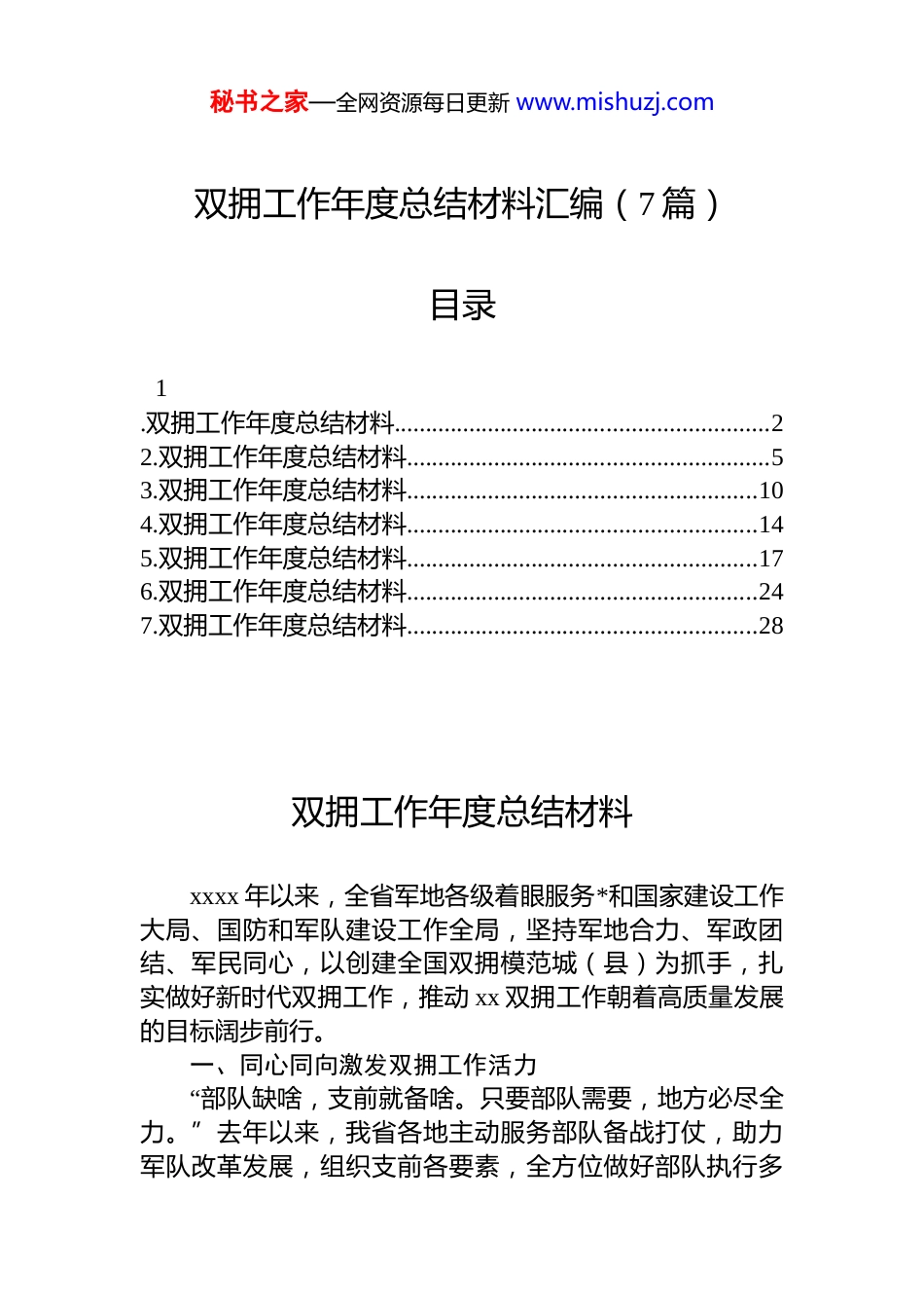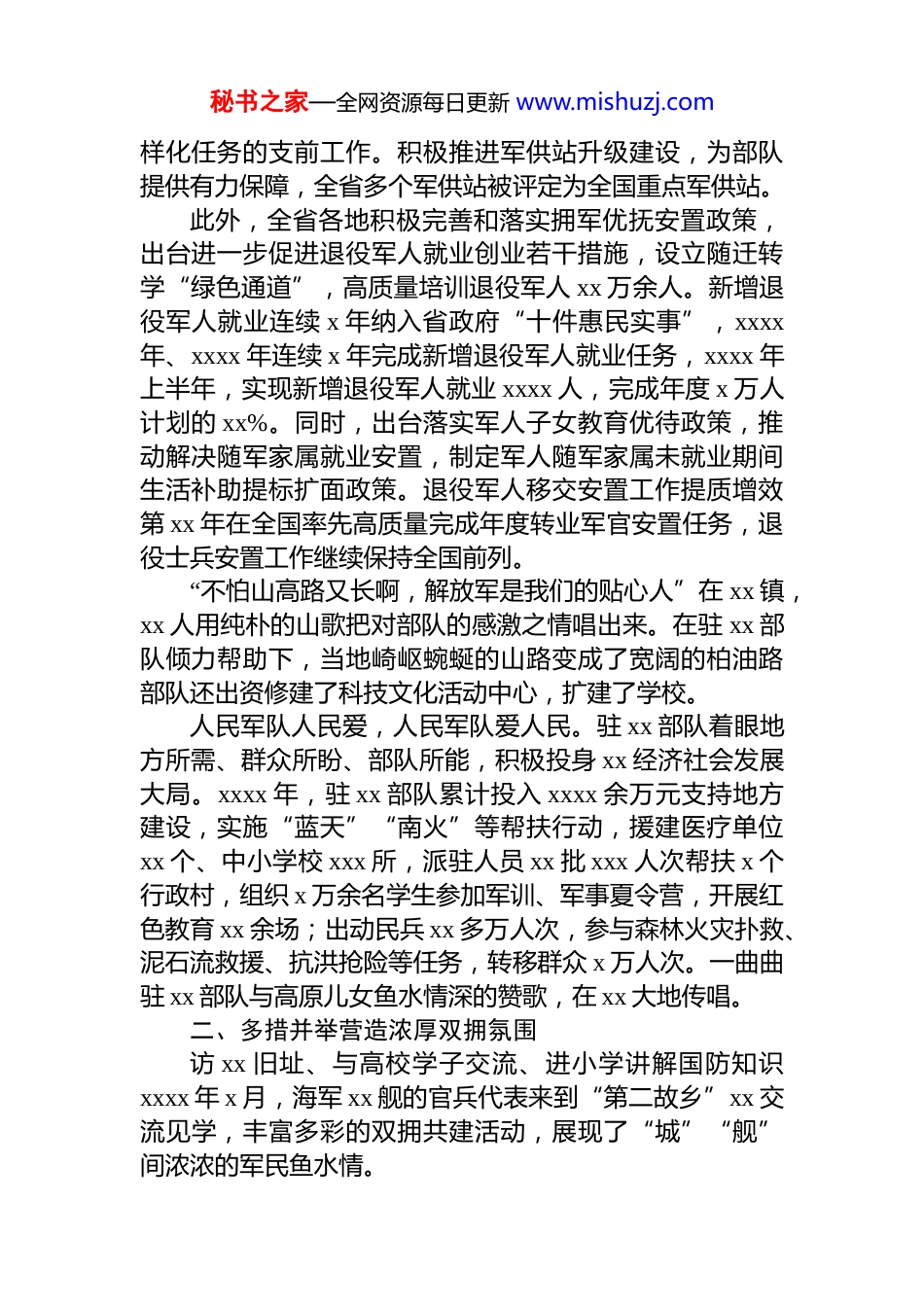 秘书之家—全网资源每日更新 www.mishuzj.com双拥工作年度总结材料汇编(7 篇)目录1.双拥工作年度总结材料............................................................22.双拥工作年度总结材料..........................................................53.双拥工作年度总结材料........................................................104.双拥工作年度总结材料........................................................145.双拥工作年度总结材料........................................................176.双拥工作年度总结材料........................................................247.双拥工作年度总结材料........................................................28双拥工作年度总结材料xxxx 年以来,全省军地各级着眼服务*和国家建设工作大局、国防和军队建设工作全局,坚持军地合力、军政团结、军民同心,以创建全国双拥模范城(县)为抓手,扎实做好新时代双拥工作,推动 xx 双拥工作朝着高质量发展的目标阔步前行。一、同心同向激发双拥工作活力“部队缺啥,支前就备啥。只要部队需要,地方必尽全力。”去年以来,我省各地主动服务部队备战打仗,助力军队改革发展,组织支前各要素,全方位做好部队执行多秘书之家—全网资源每日更新 www.mishuzj.com样化任务的支前工作。积极推进军供站升级建设,为部队提供有力保障,全省多个军供站被评定为全国重点军供站。此外,全省各地积极完善和落实拥军优抚安置政策,出台进一步促进退役军人就业创业若干措施,设立随迁转学“绿色通道”,高质量培训退役军人 xx 万余人。新增退役军人就业连续 x 年纳入省政府“十件惠民实事”,xxxx年、xxxx 年连续 x 年完成新增退役军人就业任务,xxxx 年上半年,实现新增退役军人就业 xxxx 人,完成年度 x 万人计划的 xx%。同时,出台落实军人子女教育优待政策,推动解决随军家属就业安置,制定军人随军家属未就业期间生活补助提标扩面政策。退役军人移交安置工作提质增效第 xx 年在全国率先高质量完成年度转业军官安置任务,退役士兵安置工作继续保持全国前列。“不怕山高路又长啊,解放军是我们的贴心人”在 xx 镇,xx 人用纯朴的山歌把对部队的感激之情唱出来。在驻 xx 部队倾力帮助下,当地崎岖蜿蜒的山路变成了宽阔的柏油路部队还出资修建了科技文化活动中心,扩建了学校。人民军队人民爱,人民军队爱人民。驻 xx 部队着眼地方所需、群众所盼、部队所能,积极投身 xx 经济社会发展大局。xxxx 年,驻 xx 部队累计投入 xxxx 余万元支持地方建设,实施“蓝天”“南火”等帮扶行动,援建医疗单位xx 个、中小学校 xxx 所,派驻人员 xx 批 xxx 人次帮扶 x 个行政村,组织 x 万余名学生参加军训、军事夏令营,开展红色教育 xx 余场;出动民兵 xx 多万人次,参与森林火灾扑救、泥石流救援、抗洪抢险等任务,转移群众 x 万人次。一曲曲驻 xx 部队与高原儿女鱼水情深的赞歌,在 xx 大地传唱。二、多措并举营造浓厚双拥氛围访 xx 旧址、与高校学子交流、进小学讲解国防知识xxxx 年 x 月,海军 xx 舰的官兵代表来到“第二故乡”xx 交流见学,丰富多彩的双拥共建活动,展现了“城”“舰”间浓浓的军民鱼水情。秘书之家—全网资源每日更新 www.mishuzj.com去年以来,全省各地扎实开展军地联动、军政协同、军民共建各项工作,持续推动联创联建活动取得明显成效其中,xx 市分别与 xx 市基层连队开展“城连共建”,x 个城市与海军 x 艘舰艇开展“城舰共建”,具有 xx 边疆特色、民族地区特点的新时代军政军民团结局面持续巩固。去年以来,我省广泛开展“尊崇英模、学习英模、关爱英模”活动,积极组织军地广泛开展军营开放日、送立功喜报、悬挂光荣牌等,在全社会营造了尊崇军人、向往军营、关爱军人的浓厚氛围。今年 x 月,省委宣传部、省退役军人事务厅、省军区政治工作局联合举办 xxxx 年 xx 省“最美退役军人”“最美拥军人物”发布仪式,通过军地联合开展先进典型学习宣传活动,不仅展示了我省传承...