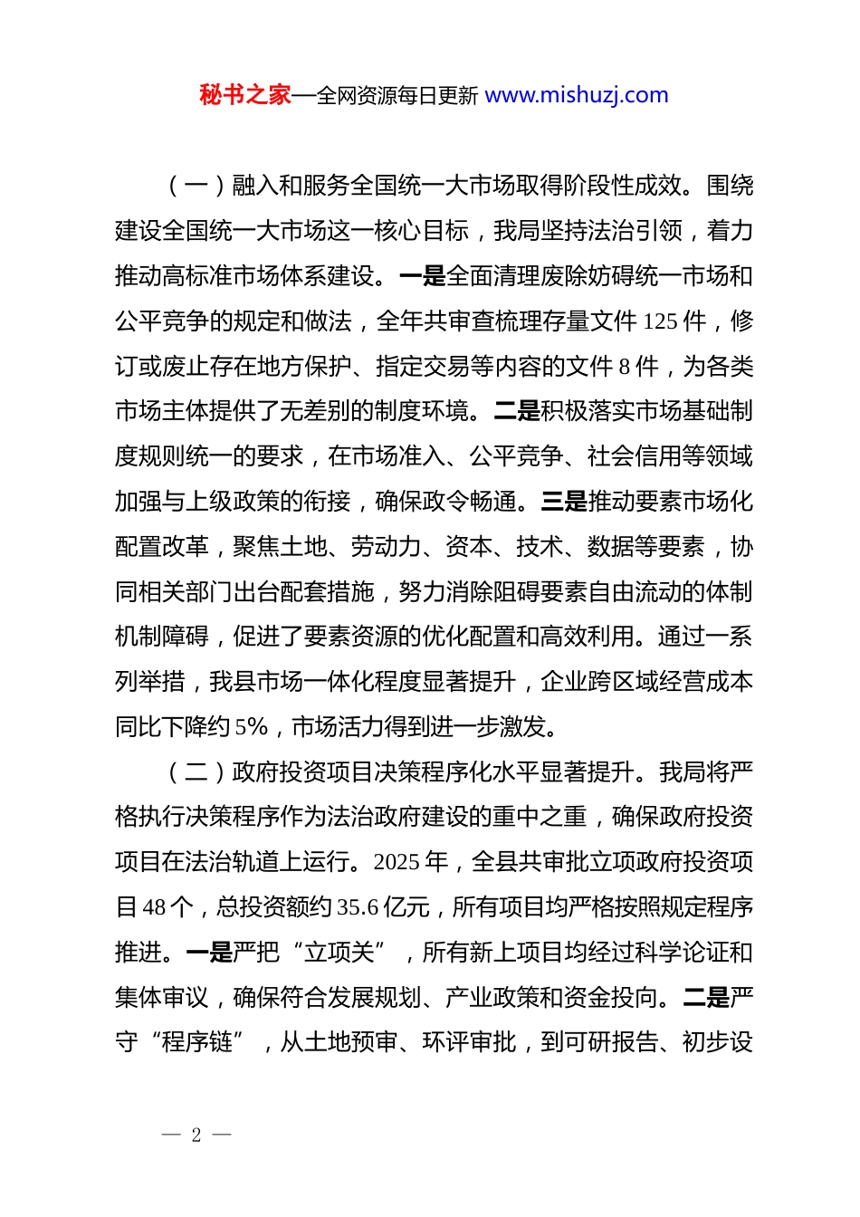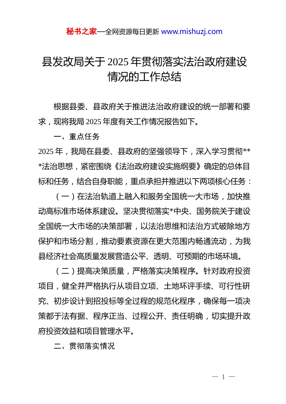 秘书之家—全网资源每日更新 www.mishuzj.com县发改局关于 2025 年贯彻落实法治政府建设情况的工作总结根据县委、县政府关于推进法治政府建设的统一部署和要求,现将我局 2025 年度有关工作情况报告如下。一、重点任务2025 年,我局在县委、县政府的坚强领导下,深入学习贯彻***法治思想,紧密围绕《法治政府建设实施纲要》确定的总体目标和任务,结合自身职能,重点承担并推进以下两项核心任务:(一)在法治轨道上融入和服务全国统一大市场,加快推动高标准市场体系建设。坚决贯彻落实*中央、国务院关于建设全国统一大市场的决策部署,以法治思维和法治方式破除地方保护和市场分割,推动要素资源在更大范围内畅通流动,为我县经济社会高质量发展营造公平、透明、可预期的市场环境。(二)提高决策质量,严格落实决策程序。针对政府投资项目,健全并严格执行从项目立项、土地环评手续、可行性研究、初步设计到招投标等全过程的规范化程序,确保每一项决策都于法有据、程序正当、过程公开、责任明确,切实提升政府投资效益和项目管理水平。二、贯彻落实情况— 1 —秘书之家—全网资源每日更新 www.mishuzj.com(一)融入和服务全国统一大市场取得阶段性成效。围绕建设全国统一大市场这一核心目标,我局坚持法治引领,着力推动高标准市场体系建设。一是全面清理废除妨碍统一市场和公平竞争的规定和做法,全年共审查梳理存量文件 125 件,修订或废止存在地方保护、指定交易等内容的文件 8 件,为各类市场主体提供了无差别的制度环境。二是积极落实市场基础制度规则统一的要求,在市场准入、公平竞争、社会信用等领域加强与上级政策的衔接,确保政令畅通。三是推动要素市场化配置改革,聚焦土地、劳动力、资本、技术、数据等要素,协同相关部门出台配套措施,努力消除阻碍要素自由流动的体制机制障碍,促进了要素资源的优化配置和高效利用。通过一系列举措,我县市场一体化程度显著提升,企业跨区域经营成本同比下降约 5%,市场活力得到进一步激发。(二)政府投资项目决策程序化水平显著提升。我局将严格执行决策程序作为法治政府建设的重中之重,确保政府投资项目在法治轨道上运行。2025 年,全县共审批立项政府投资项目 48 个,总投资额约 35.6 亿元,所有项目均严格按照规定程序推进。一是严把“立项关”,所有新上项目均经过科学论证和集体审议,确保符合发展规划、产业政策和资金投向。二是严守“程序链”,从土地预审、环评审批,到可研报告、初步设— 2 —秘书之家—全网资源每日更新 www.mishuzj.com计的编制与审查,均明确了各环节的责任主体、工作时限和审查标准,形成闭环管理。三是规范“招投标”,严格执行招投标法律法规,所有达到规模标准的项目一律进入公共资源交易平台进行公开招标,全年完成政府投资项目招投标 32 宗,中标金额 28.3 亿元,未发生一起投诉或违规事件,有效防范了廉政风险。(三)法治机关建设基础不断夯实。除重点任务外,我局全面推进依法行政能力建设。一是建立健全法律顾问制度,聘请专业律师团队参与重大行政决策、合同审查和规范性文件制定,全年提供法律意见书 56 份。二是加强法治宣传教育,组织干部职工学习《招标投标法》《政府投资条例》等法律法规 12次,参学率达 100%,干部职工的法治素养和程序意识明显增强。三是全面推进政务公开,通过政府门户网站及时公开项目审批、价格管理等信息 300 余条,保障了公众的知情权和监督权。三、贯彻落实举措(一)健全工作机制,压实法治建设责任。我局将法治政府建设纳入年度工作要点,与业务工作同部署、同落实、同考核。成立由局主要领导任组长的法治政府建设工作领导小组,定期召开专题会议研究解决法治建设中的重点难点问题。制定— 3 —秘书之家—全网资源每日更新 www.mishuzj.com《xx 县发改局法治政府建设任务清单》,将各项任务分解到岗、责任到人,形成了主要领导负责抓、分管领导具体抓、业务科室抓落实的工作格局,确保法治建设各项要求落到实处。(二)完善制度体系,规范行政权力运行。围绕两项重点任务,我局着力构建系统完备、科学规范、运...