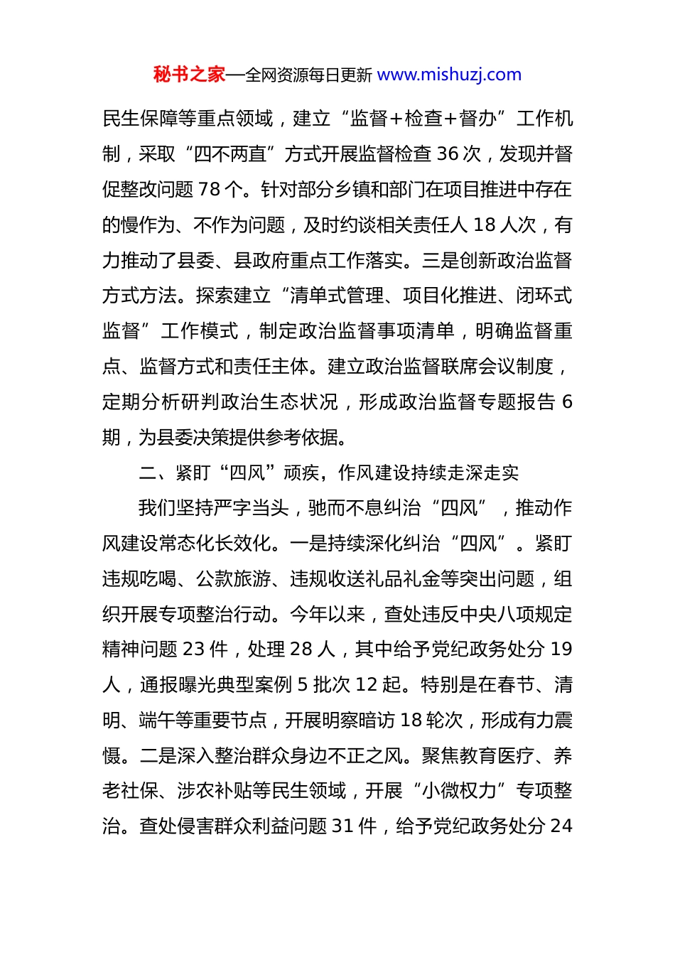 秘书之家—全网资源每日更新 www.mishuzj.com县纪委监委 2025 年工作情况汇报 尊敬的各位领导、同志们:2025 年以来,*县纪委监委坚持以习近平新时代中国特色社会主义思想为指导,深入贯彻党的二十大和二十届三中、四中全会精神,认真落实二十届中央纪委四次全会、省纪委四次全会、市纪委四次全会部署要求,在市纪委监委的坚强领导和县委的直接领导下,聚焦主责主业,强化政治监督,深化正风肃纪,一体推进不敢腐、不能腐、不想腐,持续营造风清气正的政治生态。现将有关情况汇报如下:一、聚焦“两个维护”,政治监督更加精准有力我们始终把政治监督作为首要任务,紧盯“国之大者”,推动党中央决策部署和省委、市委工作要求在*落地生根。一是坚持把党的政治建设摆在首位。围绕学习贯彻习近平新时代中国特色社会主义思想主题教育,加强对各级党组织和党员干部政治忠诚、政治担当、政治能力的监督检查。今年以来,开展政治监督谈话 120 余人次,下发政治监督建议书 15 份,推动各级党组织切实把“两个维护”体现在坚决贯彻党中央决策部署的实际行动上。二是紧盯重大决策部署落实情况。围绕乡村振兴、生态环保、秘书之家—全网资源每日更新 www.mishuzj.com民生保障等重点领域,建立“监督+检查+督办”工作机制,采取“四不两直”方式开展监督检查 36 次,发现并督促整改问题 78 个。针对部分乡镇和部门在项目推进中存在的慢作为、不作为问题,及时约谈相关责任人 18 人次,有力推动了县委、县政府重点工作落实。三是创新政治监督方式方法。探索建立“清单式管理、项目化推进、闭环式监督”工作模式,制定政治监督事项清单,明确监督重点、监督方式和责任主体。建立政治监督联席会议制度,定期分析研判政治生态状况,形成政治监督专题报告 6期,为县委决策提供参考依据。二、紧盯“四风”顽疾,作风建设持续走深走实我们坚持严字当头,驰而不息纠治“四风”,推动作风建设常态化长效化。一是持续深化纠治“四风”。紧盯违规吃喝、公款旅游、违规收送礼品礼金等突出问题,组织开展专项整治行动。今年以来,查处违反中央八项规定精神问题 23 件,处理 28 人,其中给予党纪政务处分 19人,通报曝光典型案例 5 批次 12 起。特别是在春节、清明、端午等重要节点,开展明察暗访 18 轮次,形成有力震慑。二是深入整治群众身边不正之风。聚焦教育医疗、养老社保、涉农补贴等民生领域,开展“小微权力”专项整治。查处侵害群众利益问题 31 件,给予党纪政务处分 24秘书之家—全网资源每日更新 www.mishuzj.com人,挽回经济损失 120 余万元。在全县推行村级“小微权力”清单制度,绘制权力运行流程图,让基层权力在阳光下运行。三是严肃整治形式主义官僚主义。围绕文山会海、过度留痕、检查考核过多过频等问题,开展集中整治。督促县直部门精简文件 28%、压减会议 35%,切实为基层减负。查处形式主义官僚主义问题 17 件,处理 21人,推动全县干部作风持续好转。三、保持高压态势,反腐败斗争纵深推进我们坚持无禁区、全覆盖、零容忍,保持惩治腐败高压态势,一体推进不敢腐、不能腐、不想腐。一是严肃查办违纪违法案件。今年以来,全县纪检监察机关共接收信访举报 215 件次,立案审查调查 78 件,处置问题线索189 件,运用“四种形态”批评教育帮助和处理 342 人次。其中,运用第一种形态处理 236 人次,占比 69%;第二种形态 74 人次,占比 21.6%;第三种形态 19 人次,占比 5.6%;第“四种形态”13 人次,占比 3.8%。移送司法机关 5 人,追缴违纪违法资金 360 余万元。二是突出重点领域监督。紧盯工程建设、土地出让、政府采购、资源开发等关键领域,深挖细查权钱交易、利益输送等腐败问题。查处工程建设领域腐败案件 12 件、资源开发领域案件8 件、民生领域案件 15 件。同时,加大对“一把手”和关秘书之家—全网资源每日更新 www.mishuzj.com键岗位人员的监督力度,立案查处科级干部 9 人,释放越往后执纪越严的强烈信号。三是深化以案促改工作。坚持查办案件、教育警示、堵塞漏洞一体推进,针对查办案件中发现的制...