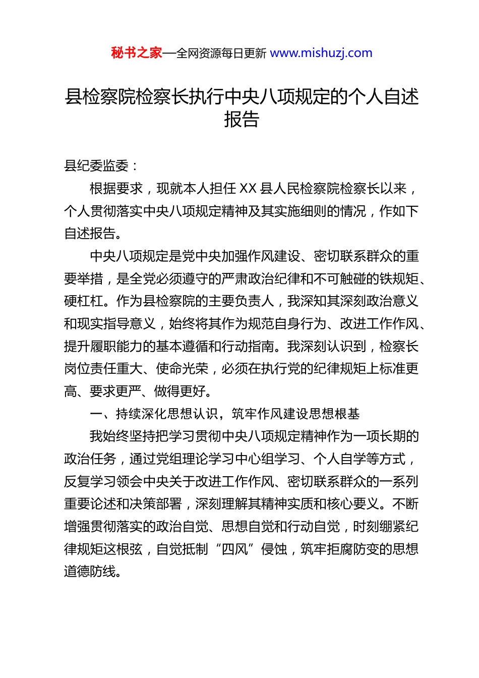 秘书之家—全网资源每日更新 www.mishuzj.com县检察院检察长执行中央八项规定的个人自述报告县纪委监委:根据要求,现就本人担任 XX 县人民检察院检察长以来,个人贯彻落实中央八项规定精神及其实施细则的情况,作如下自述报告。中央八项规定是党中央加强作风建设、密切联系群众的重要举措,是全党必须遵守的严肃政治纪律和不可触碰的铁规矩、硬杠杠。作为县检察院的主要负责人,我深知其深刻政治意义和现实指导意义,始终将其作为规范自身行为、改进工作作风、提升履职能力的基本遵循和行动指南。我深刻认识到,检察长岗位责任重大、使命光荣,必须在执行党的纪律规矩上标准更高、要求更严、做得更好。一、持续深化思想认识,筑牢作风建设思想根基我始终坚持把学习贯彻中央八项规定精神作为一项长期的政治任务,通过党组理论学习中心组学习、个人自学等方式,反复学习领会中央关于改进工作作风、密切联系群众的一系列重要论述和决策部署,深刻理解其精神实质和核心要义。不断增强贯彻落实的政治自觉、思想自觉和行动自觉,时刻绷紧纪律规矩这根弦,自觉抵制“四风”侵蚀,筑牢拒腐防变的思想道德防线。秘书之家—全网资源每日更新 www.mishuzj.com二、严格规范个人行为,自觉遵守各项纪律要求在日常工作和生活中,我始终坚持以身作则、率先垂范,要求别人做到的自己首先做到,要求别人不做的自己坚决不做,努力做到清清白白做人、干干净净做事。(一)在公务用车方面。严格执行公务用车使用管理规定。单位配备的公务用车,完全用于履行检察职责所需的公务活动,从未发生公车私用、私车公养等违规行为。本人上下班及私人事务,均使用个人车辆或其他合规方式解决,未占用任何公务用车资源。(二)在办公用房方面。严格按标准使用办公用房,面积符合相关规定,无超标使用、豪华装修或多处占用办公用房的情况。(三)在公务接待方面。严格执行公务接待制度和标准,所有公务接待活动均履行审批程序,控制陪餐人数,厉行勤俭节约,未发生超标准、超范围接待或利用公款相互吃请、赠送礼品等行为。(四)在会议活动方面。严格控制会议数量、规模和会期,能合并召开的会议坚决合并,能开视频会议的不集中召开,切实改进会风,提高效率。未组织或参加各类不必要的庆典、论坛等活动。(五)在文件简报方面。大力精简文件简报,可发可不发的文件坚决不发,能通过电话、网络等方式沟通解决的事项不秘书之家—全网资源每日更新 www.mishuzj.com再印发文件,切实改进文风。(六)在调查研究方面。坚持深入基层、深入群众开展调查研究,注重实效,轻车简从,减少陪同,不搞形式主义,不增加基层负担。(七)在廉洁自律方面。严格遵守廉洁从政各项规定,管好自己、管好家人和身边工作人员。未利用职权或职务影响为个人、亲属及他人谋取不正当利益;未违规收受礼品、礼金、有价证券等财物;未违规出入私人会所或持有会员卡。三、认真履行主体责任,推动全院作风建设常态化作为院党组书记、检察长,我切实履行全面从严治党、从严治检第一责任人职责,将贯彻落实中央八项规定精神作为加强我院党风廉政建设和反腐败工作的重要内容来抓。通过健全制度、强化教育、严格监督等方式,持续推动中央八项规定精神在我院落地生根、化风成俗。定期组织全院干警学习相关纪律规定,开展警示教育,对苗头性、倾向性问题及时提醒、批评纠正,营造风清气正的良好政治生态。四、自觉接受各方监督,保持清正廉洁政治本色我深知权力来自人民,必须接受人民监督。在工作中,我始终坚持民主集中制,主动将个人执行中央八项规定精神等情况置于党组织、人大、社会各界和全院干警的监督之下。对于组织谈话、函询以及群众反映的问题,均能做到如实说明情况,有则改之、无则加勉。秘书之家—全网资源每日更新 www.mishuzj.com综上所述,自担任现职以来,我始终以高度的政治责任感严格遵守并带头落实中央八项规定精神及各项廉洁自律要求。经认真自查,在公务用车、办公用房、公务接待、会议活动、文件简报、调查研究、廉洁自律等方面,均未发生违反中央八项规定精神的情况。今后,我将继续以身作则,率先垂范,毫不动摇、持...