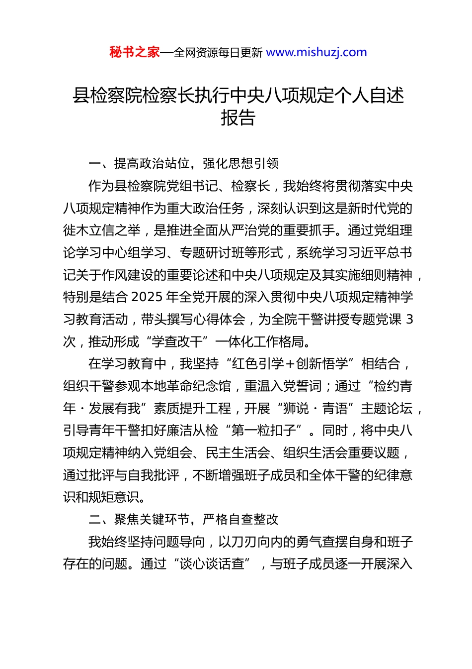 秘书之家—全网资源每日更新 www.mishuzj.com县检察院检察长执行中央八项规定个人自述报告一、提高政治站位,强化思想引领作为县检察院党组书记、检察长,我始终将贯彻落实中央八项规定精神作为重大政治任务,深刻认识到这是新时代党的徙木立信之举,是推进全面从严治党的重要抓手。通过党组理论学习中心组学习、专题研讨班等形式,系统学习习近平总书记关于作风建设的重要论述和中央八项规定及其实施细则精神,特别是结合 2025 年全党开展的深入贯彻中央八项规定精神学习教育活动,带头撰写心得体会,为全院干警讲授专题党课 3次,推动形成“学查改干”一体化工作格局。在学习教育中,我坚持“红色引学+创新悟学”相结合,组织干警参观本地革命纪念馆,重温入党誓词;通过“检约青年・发展有我”素质提升工程,开展“狮说・青语”主题论坛,引导青年干警扣好廉洁从检“第一粒扣子”。同时,将中央八项规定精神纳入党组会、民主生活会、组织生活会重要议题,通过批评与自我批评,不断增强班子成员和全体干警的纪律意识和规矩意识。二、聚焦关键环节,严格自查整改我始终坚持问题导向,以刀刃向内的勇气查摆自身和班子存在的问题。通过“谈心谈话查”,与班子成员逐一开展深入秘书之家—全网资源每日更新 www.mishuzj.com交流,既谈自身不足,也点出对方问题;通过“回头审视查”,对巡视巡察、政治督察反馈问题进行全面梳理,建立整改台账,实行销号管理;通过“广开言路查”,依托“党建+”邻里中心等机制,深入 169 个小区听取基层群众意见建议,收集问题线索 23 条,全部纳入整改范围。针对查摆出的问题,我牵头制定《县检察院贯彻落实中央八项规定精神整改方案》,明确整改措施、责任人和时限。例如,针对审计监督发现的财务管理不规范问题,成立内部控制领导小组,修订完善《财务报销管理办法》,严格执行公务卡结算制度,公务接待费用同比下降 35%;针对形式主义问题,精简文件 20%,压缩会议时长,推行“无会周”制度,让干警有更多时间投入办案一线。三、以身作则,带头执行各项规定作为“关键少数”,我始终坚持以身作则、以上率下,严格遵守中央八项规定及其实施细则精神。在公务接待中,严格执行“工作餐不得提供香烟、不上酒”的规定,杜绝超标准接待;在公车使用上,带头使用新能源汽车,节假日期间严格落实公车封存制度,近三年未发生公车私用问题。同时,严格规范个人言行,自觉净化“八小时外”社交圈、生活圈,从未接受管理服务对象礼品礼金或宴请。为强化监督制约,我推动建立“360”闭环管理风险防控机制,对廉政风险点进行动态排查,开展检务督察 6 次,发现并秘书之家—全网资源每日更新 www.mishuzj.com纠正会风会纪、窗口服务等问题 12 个。通过设立举报信箱、公布举报电话等方式,主动接受群众监督,确保中央八项规定精神落地见效。四、以作风建设促检察工作高质量发展我始终将贯彻中央八项规定精神与检察业务工作紧密结合以优良作风推动高质效履职办案。针对“一取消三不再”后检察队伍建设新情况,制定做实“三个管理”提升办案质效 24项措施,将管案与管人有机结合,激发干警干事创业活力。2025 年以来,我院办理的 2 起公益诉讼案件入选全省典型案例,1 起司法救助案件被最高检评为“全国检察机关依法维护妇女儿童权益典型案例”。同时,扎实开展违规异地执法和趋利性执法司法专项监督等活动,监督纠正执法不规范问题 8 件,切实维护司法公正和群众合法权益。通过开展“我为群众办实事”实践活动,为企业解决涉法涉诉问题 15 个,为困难群众发放司法救助金 23 万元,以实际行动践行司法为民宗旨。五、存在的不足与改进方向虽然在执行中央八项规定精神方面取得了一定成效,但对照高标准严要求,仍存在一些不足:一是对隐形变异“四风”问题的监督手段还不够丰富;二是制度执行的刚性还需进一步加强;三是作风建设与检察业务融合的深度和广度还需拓展。下一步,我将以习近平新时代中国特色社会主义思想为指秘书之家—全网资源每日更新 www.mishuzj.com导,持续深化中央八项规定精神学习教育,重点抓好三个方面工作:一是加...