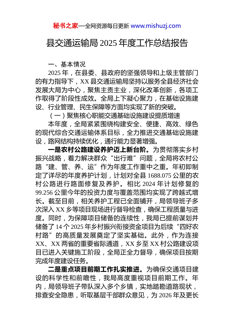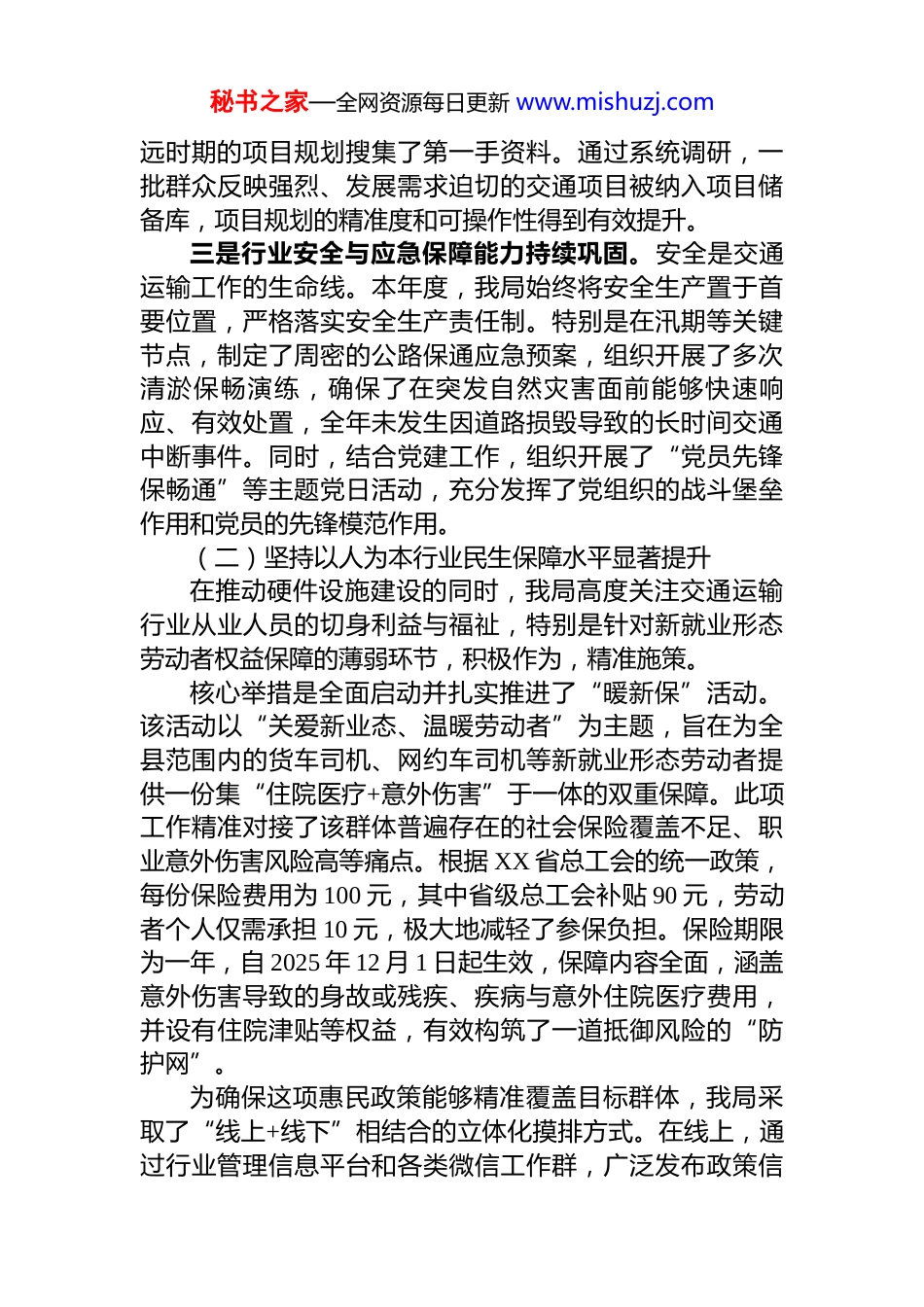 秘书之家—全网资源每日更新 www.mishuzj.com县交通运输局 2025 年度工作总结报告一、基本情况2025 年,在县委、县政府的坚强领导和上级主管部门的有力指导下,XX 县交通运输局坚持以服务全县经济社会发展大局为中心,聚焦主责主业,深化改革创新,各项工作取得了阶段性成效。全局上下凝心聚力,在基础设施建设、行业管理、民生保障等方面均实现了新的突破。(一)聚焦核心职能交通基础设施建设提质增速本年度,全局紧紧围绕构建安全、便捷、高效、绿色的现代综合交通运输体系目标,全力推进交通基础设施建设,路网结构持续优化,通行能力显著增强。一是农村公路建设养护迈上新台阶。为贯彻落实乡村振兴战略,着力解决群众“出行难”问题,全局将农村公路“建、管、养、运”作为年度工作重中之重。年初即制定了详尽的年度养护计划,计划对全县 1688.075 公里的农村公路进行路面修复及养护。相比 2024 年计划修复的99.256 公里今年的投资力度与覆盖范围均实现了跨越式增长。截至目前,相关养护工程已全面铺开,局领导班子多次深入 XX 乡等项目现场进行督导检查,确保工程质量与进度。同时,为保障项目储备的连续性,我局已提前谋划并储备了 14 个 2025 年乡村振兴衔接资金项目为后续“四好农村路”的高质量发展奠定了坚实基础。此外,作为连接XX、XX 两省的重要省际通道,XX 乡至 XX 村公路建设项目已进入关键施工阶段,全局正全力督导,确保项目按期完成年度建设任务。二是重点项目前期工作扎实推进。为确保交通项目建设的科学性和前瞻性,我局高度重视项目前期工作。年内,局领导班子带队深入多个乡镇,实地踏勘道路现状,排查安全隐患,听取基层干部群众意见,为 2026 年及更长秘书之家—全网资源每日更新 www.mishuzj.com远时期的项目规划搜集了第一手资料。通过系统调研,一批群众反映强烈、发展需求迫切的交通项目被纳入项目储备库,项目规划的精准度和可操作性得到有效提升。三是行业安全与应急保障能力持续巩固。安全是交通运输工作的生命线。本年度,我局始终将安全生产置于首要位置,严格落实安全生产责任制。特别是在汛期等关键节点,制定了周密的公路保通应急预案,组织开展了多次清淤保畅演练,确保了在突发自然灾害面前能够快速响应、有效处置,全年未发生因道路损毁导致的长时间交通中断事件。同时,结合党建工作,组织开展了“党员先锋保畅通”等主题党日活动,充分发挥了党组织的战斗堡垒作用和党员的先锋模范作用。(二)坚持以人为本行业民生保障水平显著提升在推动硬件设施建设的同时,我局高度关注交通运输行业从业人员的切身利益与福祉,特别是针对新就业形态劳动者权益保障的薄弱环节,积极作为,精准施策。核心举措是全面启动并扎实推进了“暖新保”活动。该活动以“关爱新业态、温暖劳动者”为主题,旨在为全县范围内的货车司机、网约车司机等新就业形态劳动者提供一份集“住院医疗+意外伤害”于一体的双重保障。此项工作精准对接了该群体普遍存在的社会保险覆盖不足、职业意外伤害风险高等痛点。根据 XX 省总工会的统一政策,每份保险费用为 100 元,其中省级总工会补贴 90 元,劳动者个人仅需承担 10 元,极大地减轻了参保负担。保险期限为一年,自 2025 年 12 月 1 日起生效,保障内容全面,涵盖意外伤害导致的身故或残疾、疾病与意外住院医疗费用,并设有住院津贴等权益,有效构筑了一道抵御风险的“防护网”。为确保这项惠民政策能够精准覆盖目标群体,我局采取了“线上+线下”相结合的立体化摸排方式。在线上,通过行业管理信息平台和各类微信工作群,广泛发布政策信秘书之家—全网资源每日更新 www.mishuzj.com息并推送信息采集表,引导从业者自主申报。在线下,组织专门工作力量,深入货运站场、物流园区等新业态劳动者聚集地,面对面宣讲政策,并详细登记从业人员的姓名、联系方式、从业类型及具体的保障需求。经过第一阶段的细致摸排,初步确定我县交通运输领域符合条件的货车司机共计 21 名,并已完成信息核对与参保准备工作。这一精准的摸排为后续工作的深入开展和政策优化提供了坚实的数据支撑。“...