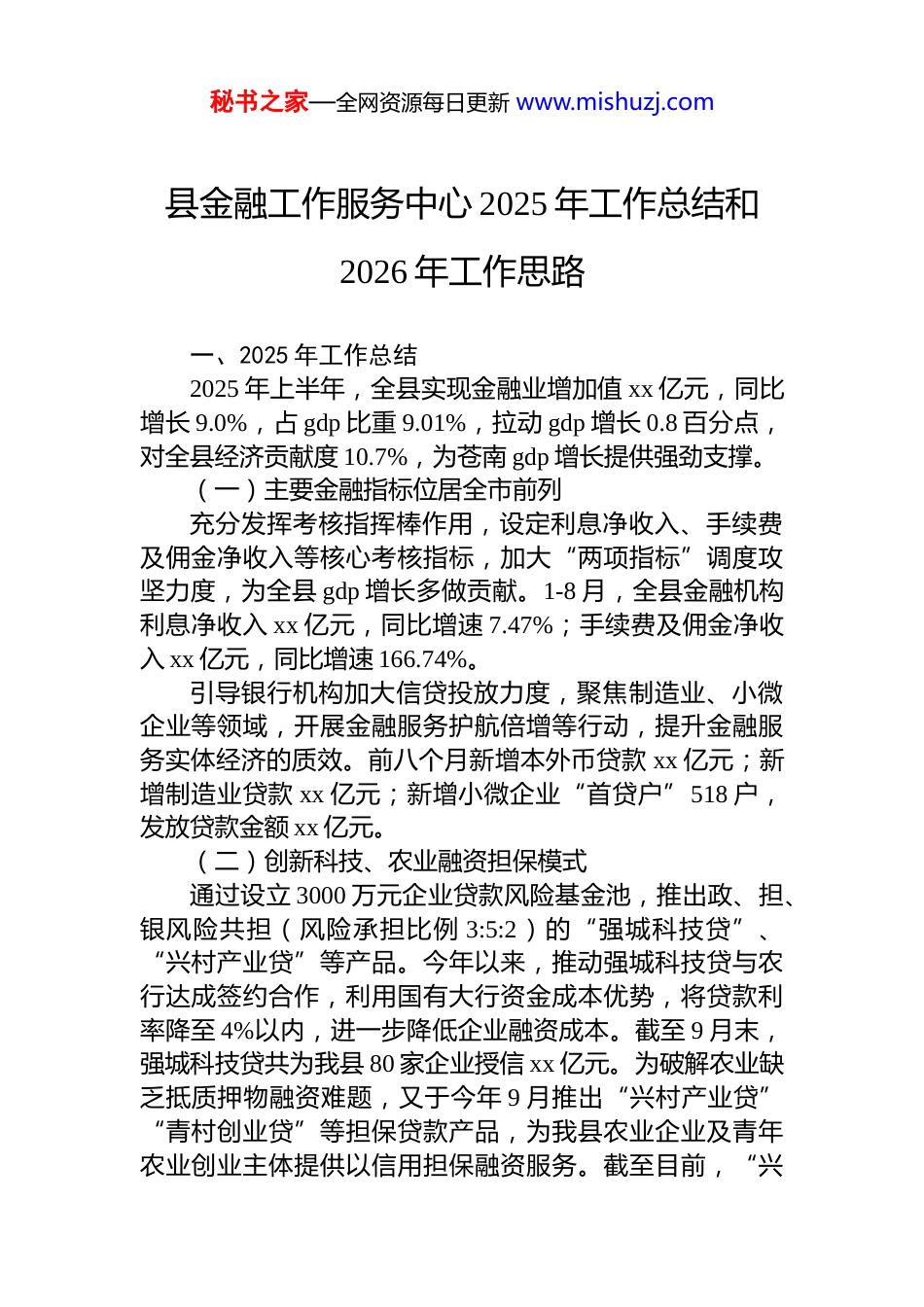 秘书之家—全网资源每日更新 www.mishuzj.com县金融工作服务中心 2025 年工作总结和2026 年工作思路一、2025 年工作总结2025 年上半年,全县实现金融业增加值 xx 亿元,同比增长 9.0%,占 gdp 比重 9.01%,拉动 gdp 增长 0.8 百分点,对全县经济贡献度 10.7%,为苍南 gdp 增长提供强劲支撑。(一)主要金融指标位居全市前列充分发挥考核指挥棒作用,设定利息净收入、手续费及佣金净收入等核心考核指标,加大“两项指标”调度攻坚力度,为全县 gdp 增长多做贡献。1-8 月,全县金融机构利息净收入 xx 亿元,同比增速 7.47%;手续费及佣金净收入 xx 亿元,同比增速 166.74%。引导银行机构加大信贷投放力度,聚焦制造业、小微企业等领域,开展金融服务护航倍增等行动,提升金融服务实体经济的质效。前八个月新增本外币贷款 xx 亿元;新增制造业贷款 xx 亿元;新增小微企业“首贷户”518 户,发放贷款金额 xx 亿元。(二)创新科技、农业融资担保模式通过设立 3000 万元企业贷款风险基金池,推出政、担、银风险共担(风险承担比例 3:5:2)的“强城科技贷”、“兴村产业贷”等产品。今年以来,推动强城科技贷与农行达成签约合作,利用国有大行资金成本优势,将贷款利率降至 4%以内,进一步降低企业融资成本。截至 9 月末,强城科技贷共为我县 80 家企业授信 xx 亿元。为破解农业缺乏抵质押物融资难题,又于今年 9 月推出“兴村产业贷”“青村创业贷”等担保贷款产品,为我县农业企业及青年农业创业主体提供以信用担保融资服务。截至目前,“兴秘书之家—全网资源每日更新 www.mishuzj.com村产业贷”共为我县 4 家企业授信 xx 万元。(三)持续优化县域金融生态环境一是防范化解银行机构风险。推动不良率保持低位运行。8 月末,全县不良贷款率**%,低于全市不良率 0.24 个百分点,居全市第 4。二是推进企业金融风险帮扶。帮扶暂时性困难企业和增资扩产企业协调解决融资和化解风险,推动实体企业健康稳定发展。今年以来累计出具工作联系函 8 份,帮助 3 家企业获取银行信贷支持 xx 万元,白名单企业帮扶销号率 100%。三是规范整治地方金融组织。完成*家正常展业地方金融组织 2024 年度现场检查工作;开展打击整治不法贷款中介专项行动;清退*家民间投融资中介机构和*家未经审批的典当行、移送*家非正常经营农村资金互助会到民政部门进行撤销。四是开展辖内涉非风险排摸工作。开展“天罗地网”等金融大数据平台预警风险企业排查,核查销号*家预警风险企业;组织开展第三方财富管理公司等类金融企业风险排查行动,移送*家经营异常主体到市监等部门分类处置。五是协助做好防非处非工作。发布“中融投资”、“外快理财”等非吸案件资金清退公告组织开展防范和处置非法集资系列宣传活动。加强涉非风险排摸工作,以工作提示函形式下发*条涉非线索到相关乡镇落实风险排查。六是落实维稳安保各项工作。严格落实地方金融领域维稳安保各项工作,今年以来,苍南辖内未发生涉众型金融风险以及金融领域信访维稳事件,整体风险可防可控。二、2026 年工作思路(一)推动主要金融指标稳步增长。一是加强和经信、发改、科技、资规、投促等相关部门的联动,排摸梳理企业融资需求清单,并向辖内各金融机构推送融资项目做好服务保障。二是聚焦县级重点工程项目融资需求,建立全流程跟踪服务机制,加强与国有平台的联动协作,优化项目贷款包装方案,加快贷款投放进程。秘书之家—全网资源每日更新 www.mishuzj.com(二)持续畅通小微企业融资渠道。一是引导银行机构深度开展“千企万户大走访”与“金融专员进千企”行动,对接我县制造业、科技型等中小微企业金融需求,让金融“活水”精准滴灌企业田间。二是引导银行机构聚焦制造业企业特点,创新金融产品与服务,提升贷款投放效率与精准度,助力制造业高质量发展。三是持续开展小微企业和个体工商户融资破难、“首贷户拓展行动”升级版等活动,激发市场主体活力,营造良好金融生态环境。(三)探索创新政府融资担保模式。针对我县科技型企业、“三农”等重点扶持领域及融资薄弱环节,进一步...