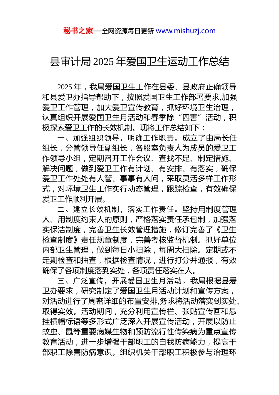 秘书之家—全网资源每日更新 www.mishuzj.com县审计局 2025 年爱国卫生运动工作总结2025 年,我局爱国卫生工作在县委、县政府正确领导和县爱卫办指导帮助下,按照爱国卫生工作部署要求,加强爱卫工作管理,加大爱卫宣传教育,抓好环境卫生治理,认真组织开展爱国卫生月活动和春季除“四害”活动,积极探索爱卫工作的长效机制。现将工作总结如下:一、加强组织领导,明确工作职责。成立了由局长任组长,分管领导任副组长,各股室负责人为成员的爱卫工作领导小组,定期召开工作会议、查找不足、制定措施、解决问题,做到爱卫工作有计划、有安排、有落实,确保爱卫工作处处有人管、事事有人问,采取灵活多样工作形式,对环境卫生工作实行动态管理,跟踪检查,有效确保爱卫工作顺利开展。二、建立长效机制,落实工作责任。坚持用制度管理人、用制度约束人的原则,严格落实责任承包制,加强落实保洁制度,完善卫生长效管理措施,修订完善了《卫生检查制度》责任规章制度,完善考核监督机制。抓好单位内部卫生管理,做到每日小扫除,每周大扫除。定期或不定期检查和抽查,根据检查情况,进行打分并通报,有效确保了各项制度落到实处,各项责任落实在人。三、广泛宣传,开展爱国卫生月活动。我局根据县爱卫办要求,研究制定了爱国卫生月活动计划和宣传方案,对活动进行了周密详细的布置安排,务求将活动落实到实处、取得实效。活动期间,充分利用宣传栏、张贴宣传画和悬挂横幅标语等多形式广泛深入开展宣传活动,开展以防止蚊虫、鼠等重要病媒生物和预防流行性传染病为重点宣传教育活动,进一步增强干部职工的自我防病能力,提高干部职工除害防病意识。组织机关干部职工积极参与治理环秘书之家—全网资源每日更新 www.mishuzj.com境卫生脏、乱、差现象,清除卫生死角,对办公场所等地进行了全面彻底清理,有效清除“四害”孳生场所,营造干部职工人人参与的疾病防控氛围,倡导干部职工形成文明健康的生活方式。四、加强宣传教育,提高干部职工健康意识。利用召开全体干部职工大会的时间,向全体干部职工学习传达市县有关爱国卫生文件精神,倡导全体干部职工从身边做起从自己做起,带头爱护环境卫生。采用宣传栏、召开专题会等多种形式,在审计系统大力开展爱卫工作宣传,提高干部职工的爱卫知识。充分认识到爱卫工作的重要性、紧迫性,从思想上重视爱卫工作,支持爱卫工作,珍惜整洁卫生的工作生活环境,自觉的用心去参与爱卫工作,把践行爱卫工作成为干部职工的良好习惯。用干部职工喜闻乐见的形式,开展健康教育、促进健康活劲,传播健康知识。五、开展专项整治,有效清除“四害”。组织干部职工在办公区内开展以灭蚊、灭鼠为重点的除“四害”活动定期投放药物和喷洒药水,设置投药点进行杀灭。同时设置标识,避免人畜误食同时,有效地预防了疾病的发生和流行。对局机关办公室及两边花坛、公共场所的环境进行综合整治,组织进行卫生大扫除,彻底清理卫生死角,疏通水沟,清运垃圾等,加强卫生基础设施配置,通过广泛发动、群防群治,大力加强环境综合整治,确保环境卫生达标,改善干部职工的办公环境。