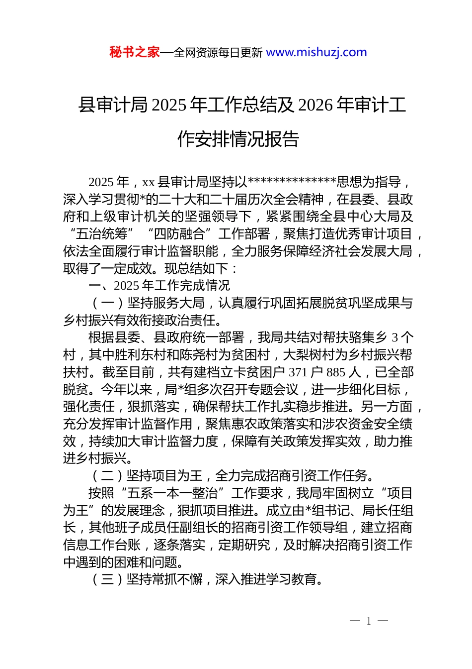 秘书之家—全网资源每日更新 www.mishuzj.com县审计局 2025 年工作总结及 2026 年审计工作安排情况报告2025 年,xx 县审计局坚持以**************思想为指导,深入学习贯彻*的二十大和二十届历次全会精神,在县委、县政府和上级审计机关的坚强领导下,紧紧围绕全县中心大局及“五治统筹”“四防融合”工作部署,聚焦打造优秀审计项目,依法全面履行审计监督职能,全力服务保障经济社会发展大局,取得了一定成效。现总结如下:一、2025 年工作完成情况(一)坚持服务大局,认真履行巩固拓展脱贫巩坚成果与乡村振兴有效衔接政治责任。根据县委、县政府统一部署,我局共结对帮扶骆集乡 3 个村,其中胜利东村和陈尧村为贫困村,大梨树村为乡村振兴帮扶村。截至目前,共有建档立卡贫困户 371 户 885 人,已全部脱贫。今年以来,局*组多次召开专题会议,进一步细化目标,强化责任,狠抓落实,确保帮扶工作扎实稳步推进。另一方面,充分发挥审计监督作用,聚焦惠农政策落实和涉农资金安全绩效,持续加大审计监督力度,保障有关政策发挥实效,助力推进乡村振兴。(二)坚持项目为王,全力完成招商引资工作任务。按照“五系一本一整治”工作要求,我局牢固树立“项目为王”的发展理念,狠抓项目推进。成立由*组书记、局长任组长,其他班子成员任副组长的招商引资工作领导组,建立招商信息工作台账,逐条落实,定期研究,及时解决招商引资工作中遇到的困难和问题。(三)坚持常抓不懈,深入推进学习教育。— 1 —秘书之家—全网资源每日更新 www.mishuzj.com3 月 24 日,xx 县审计局*组召开专题会议,安排部署深入贯彻中央八项规定精神学习教育工作,传达学以***同志为核心的*中央*的建设工作领导小组会议精神和省委、市委常委(扩大)会议暨*的建设工作领导小组会议精神,并研究审议《xx县审计局关于在全局*员中开展深入贯彻中央八项规定精神学习教育的工作方案》,成立工作专班,明确专人负责并定期对局属各*支部深入贯彻中央八项规定精神学习教育工作开展情况进行全覆盖、全过程指导。一是中共 xx 县审计局总支部委员会、第一支部委员会及第二支部委员分别召开深入贯彻中央八项规定精神学习教育工作部署会,传达学习县委相关文件及局*组专题会议精神。二是聚焦“两个清单”28 条问题(夏学教专发〔2025〕4 号)、四个方面突出问题(夏学教专发〔2025〕8 号、夏学教专发〔2025〕9 号),从讲政治的高度,深挖思想根源,深入具体查摆问题,充分发挥了审计机关廉政建设排头兵的作用。截至 8 月底,共排查出 20 个问题,已基本整改完毕。三是紧紧围绕县委、县政府中心工作,结合学习教育工作成效,突出抓好财政预决算、专项资金、政府重点投资项目和经济责任四大板块审计,积极参与上级纪检监察机关案件查处。先后抽调 16 人(次)配合市县纪检监察机关、信访部门开展对落实中央八项规定精神、三公经费、公共工程建设、房地产开发、土地出让转让等重点领域、重点环节的清查整顿,着力整治涉及民生领域的突出问题。(四)聚焦主责主业,依法全面履行审计监督职责。紧紧围绕《县政府工作报告》明确的重要指标、重点工作重点项目、重点民生实事等工作,科学谋划 2025 年审计项目计划。(五)狠抓工作落实,扛牢意识形态工作主体责任2025 年县审计局*组根据人事变动,重新调整意识形态工作领导小组,制定意识形态工作要点,细化任务分解,梳理责— 2 —秘书之家—全网资源每日更新 www.mishuzj.com任清单,建立健全意识形态工作责任制。2025 年共召开 4 次意识形态工作分析研判会,2 次意识形态专题研讨会,向县委专题汇报一次意识形态工作。同时,将意识形态工作纳入领导干部民主生活会对照检查、领导干部述职及年度综合目标考核内容,做到与审计业务工作同部署、同落实、同检查、同考评。二、2025 年审计工作做法和经验(一)工作做法。一是坚持*对审计工作的全面领导,强化政治机关意识,坚决把准审计方向,始终把讲政治贯穿于审计工作的全过程、各环节。严格落实重大事项请示报告制度,积极主动上级审计机关和县委审计委员会报告重大事项。坚持围...
