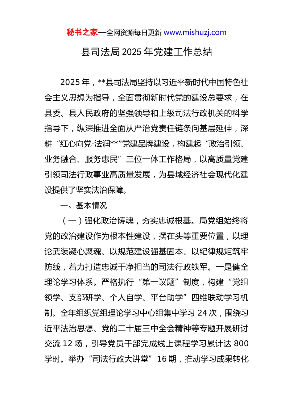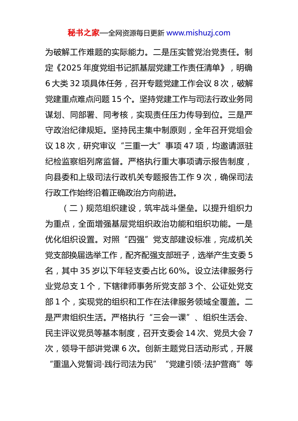秘书之家—全网资源每日更新 www.mishuzj.com县司法局 2025 年党建工作总结 2025 年,**县司法局坚持以习近平新时代中国特色社会主义思想为指导,全面贯彻新时代党的建设总要求,在县委、县人民政府的坚强领导和上级司法行政机关的科学指导下,纵深推进全面从严治党责任链条向基层延伸,深耕“红心向党·法润**”党建品牌建设,构建起“政治引领、业务融合、服务惠民”三位一体工作格局,以高质量党建引领司法行政事业高质量发展,为县域经济社会现代化建设提供了坚实法治保障。一、基本情况(一)强化政治铸魂,夯实忠诚根基。局党组始终将党的政治建设作为根本性建设,摆在头等重要位置,以理论武装凝心聚魂、以规范建设强基固本、以纪律规矩筑牢防线,着力打造忠诚干净担当的司法行政铁军。一是健全理论学习体系。严格执行“第一议题”制度,构建“党组领学、支部研学、个人自学、平台助学”四维联动学习机制。全年组织党组理论学习中心组集中学习 24 次,围绕习近平法治思想、党的二十届三中全会精神等专题开展研讨交流 12 场,引导党员干部完成线上课程学习累计达 800学时。举办“司法行政大讲堂”16 期,推动学习成果转化秘书之家—全网资源每日更新 www.mishuzj.com为破解工作难题的实际能力。二是压实管党治党责任。制定《2025 年度党组书记抓基层党建工作责任清单》,明确6 大类 32 项具体任务,召开专题党建工作会议 8 次,破解党建重点难点问题 15 个。坚持党建工作与司法行政业务同谋划、同部署、同考核,实现责任压力传导到位。三是严守政治纪律规矩。坚持民主集中制原则,全年召开党组会议 18 次,研究审议“三重一大”事项 47 项,均邀请派驻纪检监察组列席监督。严格执行重大事项请示报告制度,向县委和上级司法行政机关专题报告工作 9 次,确保司法行政工作始终沿着正确政治方向前进。(二)规范组织建设,筑牢战斗堡垒。以提升组织力为重点,全面增强基层党组织政治功能和组织功能。一是优化组织设置。对照“四强”党支部建设标准,完成机关党支部换届选举工作,配齐配强支部班子,选举产生支委 5名,其中 35 岁以下年轻支委占比 60%。设立法律服务行业党总支 1 个,下辖律师事务所党支部 3 个、公证处党支部 1 个,实现党的组织和工作在法律服务领域全覆盖。二是严肃组织生活。严格执行“三会一课”、组织生活会、民主评议党员等基本制度,召开支委会 14 次、党员大会 7次,领导干部讲党课 6 次。创新主题党日活动形式,开展“重温入党誓词·践行司法为民”“党建引领·法护营商”等秘书之家—全网资源每日更新 www.mishuzj.com特色主题党日活动 14 次,组织党员赴**红色教育基地开展现场教学 2 次,党内政治生活的政治性、时代性、原则性、战斗性显著增强。三是壮大党员队伍。实施“双培养”工程,把业务骨干培养成党员、把党员培养成业务骨干。全年 5 名年轻干部递交入党申请书,确定入党积极分子 3 名,接收预备党员 2 名,按期转正党员 1 名。开展党员先锋指数测评,评选表彰优秀共产党员 8 名、优秀党务工作者 3 名,营造创先争优浓厚氛围。(三)深化品牌创建,激发党建活力。紧扣“一支部一品牌、一单位一特色”创建目标,打造具有**辨识度的司法行政党建品牌矩阵。一是主品牌“红心向党·法润**”提质增效。该品牌以“党建红”引领“司法蓝”为核心内涵,整合法治宣传、法律援助、人民调解、社区矫正等职能,构建“1+4+N”党建工作模式,即 1 个党建品牌引领,4 大业务板块支撑,N 个特色项目驱动。全年开展品牌创建活动 32 场次,服务群众超 1.2 万人次,品牌知晓度和美誉度持续提升。二是子品牌竞相发展。在机关党支部打造“法治先锋·服务标兵”品牌,设立党员先锋岗 12 个,组建党员突击队 3 支,在重大任务面前冲锋在前。在法律服务行业开展“诚信执业·党员先行”活动,3 名党员律师获评县级“优秀法律服务工作者”。三是党建阵地规范化秘书之家—全网资源每日更新 www.mishuzj.com建设。投入 20 万元升级改造党员活动室,增设“法治书屋”“廉政文化长廊”等功能区...