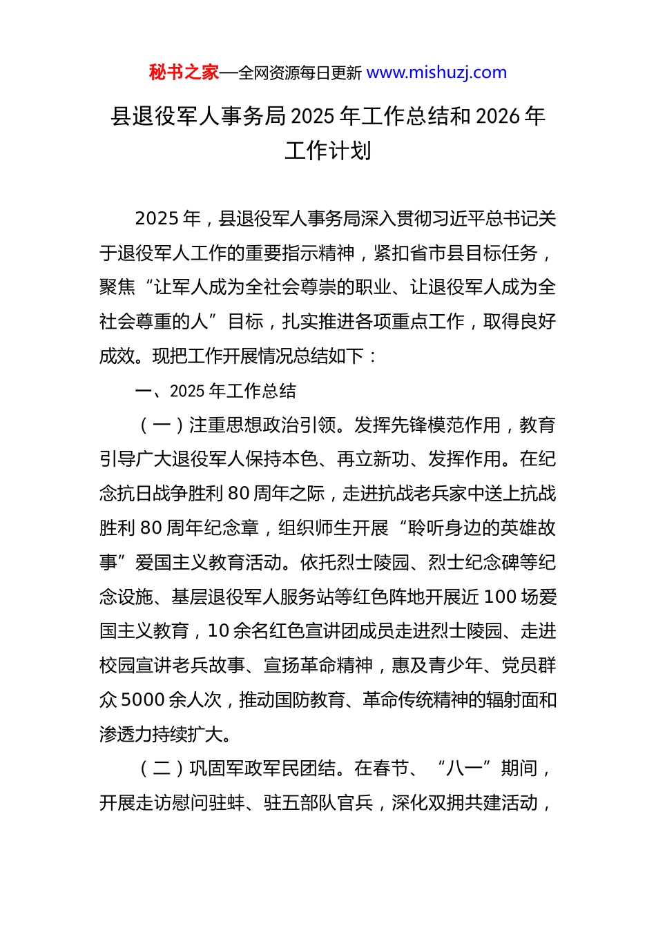 秘书之家—全网资源每日更新 www.mishuzj.com县退役军人事务局 2025 年工作总结和 2026 年工作计划 2025 年,县退役军人事务局深入贯彻习近平总书记关于退役军人工作的重要指示精神,紧扣省市县目标任务,聚焦“让军人成为全社会尊崇的职业、让退役军人成为全社会尊重的人”目标,扎实推进各项重点工作,取得良好成效。现把工作开展情况总结如下:一、2025 年工作总结(一)注重思想政治引领。发挥先锋模范作用,教育引导广大退役军人保持本色、再立新功、发挥作用。在纪念抗日战争胜利 80 周年之际,走进抗战老兵家中送上抗战胜利 80 周年纪念章,组织师生开展“聆听身边的英雄故事”爱国主义教育活动。依托烈士陵园、烈士纪念碑等纪念设施、基层退役军人服务站等红色阵地开展近 100 场爱国主义教育,10 余名红色宣讲团成员走进烈士陵园、走进校园宣讲老兵故事、宣扬革命精神,惠及青少年、党员群众 5000 余人次,推动国防教育、革命传统精神的辐射面和渗透力持续扩大。(二)巩固军政军民团结。在春节、“八一”期间,开展走访慰问驻蚌、驻五部队官兵,深化双拥共建活动,秘书之家—全网资源每日更新 www.mishuzj.com进一步加深军民“鱼水情”。解决 15 名军人子女入学入托、7 名军人子女跨学范区入学等实际困难,军人子女入学率达到 100%。用心用情服务好部队,落实“军地”需求提报 3 项次,清单化解决部队官兵“急难愁盼”问题。开展“送医进军营”1 场,“送法进军营”1 场,举办文体交流活动 1 次,群众性双拥活动 4 场。(三)彰显优抚褒扬温度。严格执行优抚标准动态调整机制,及时、足额、按月为 5000 余名重点优抚对象发放抚恤金和生活补助 3000 余万元,发放医疗补助 30.5 万元,惠及 480 人次,政策落实满意度保持 100%。开展烈士纪念设施保护工作,举行零散烈士墓迁葬仪式,将 4 位烈士的散葬墓穴集中迁移至 X 县烈士陵园。将烈士纪念设施管护经费列入县级财政预算,投入 0.95 万元修缮保护19 座零散烈士墓。开展“为烈士寻亲”活动,1 位烈士寻亲成功事迹被退役军人事务部官网报道。(四)提升安置就业质效。深入实施退役军人就业创业促进年活动,积极发挥退役军人就业创业服务促进会作用,为 42 名退役军人提供技能培训,组织 27 名退役军人参加 2 期退役军人长三角无人机定向培训班。举办退役士兵专场招聘会 4 场,用人单位 21 家、提供岗位 1157 个、达成就业意向 63 人,发放宣传资料 1000 余份。对接金融秘书之家—全网资源每日更新 www.mishuzj.com监管分局联合 8 家银行为我县有创业需求的退役军人推行创 业 贷 , 已 有 2 名 退 役 军 人 申 请 创 业 贷 款 共 计 20 万元,10 余名有意向退役军人正在申请中。(五)强化服务保障能力。推进镇、村(社区)退役军人服务站“五优”建设,基层服务能力显著提升。落实《困难退役军人帮扶援助工作规范》,对 78 名困难退役军人实施帮扶援助 15 万元,在住房保障、子女教育等方面提供精准支持。建立县镇联动信访处置机制,召开专题调度会 10 余次,重复信访率同比下降 10%,退役军人群体总体稳定。二、2026 年工作计划(一)深化思政引领,凝聚思想共识。持续开展习近平新时代中国特色社会主义思想专题学习,结合退役军人特点创新宣传形式,运用新媒体平台推送先进事迹和政策解读,强化退役军人听党话、跟党走的思想自觉。扩大退役军人志愿服务队伍规模,打造“戎耀 X”志愿服务品牌,组织开展公益服务、应急支援等活动,彰显退役军人担当。(二)优化优抚保障,提升尊崇质感。严格落实优抚政策动态调整机制,做好各项优抚资金的发放工作,义务兵家庭和其他优抚对象优待工作。谋划省级烈士纪念设施秘书之家—全网资源每日更新 www.mishuzj.com创建工作,开展“英烈事迹进课堂、进社区”活动,深化“为烈士寻亲”成果,让红色基因代代相传。拓展优待证应用场景,新增餐饮、商超等优待合作,提高优待证“含金量”。(三)强化就业赋能,促进高质量就业。深化就业服务专项行动,联合多部门建立退役军人就业数...