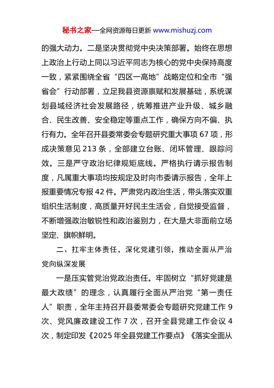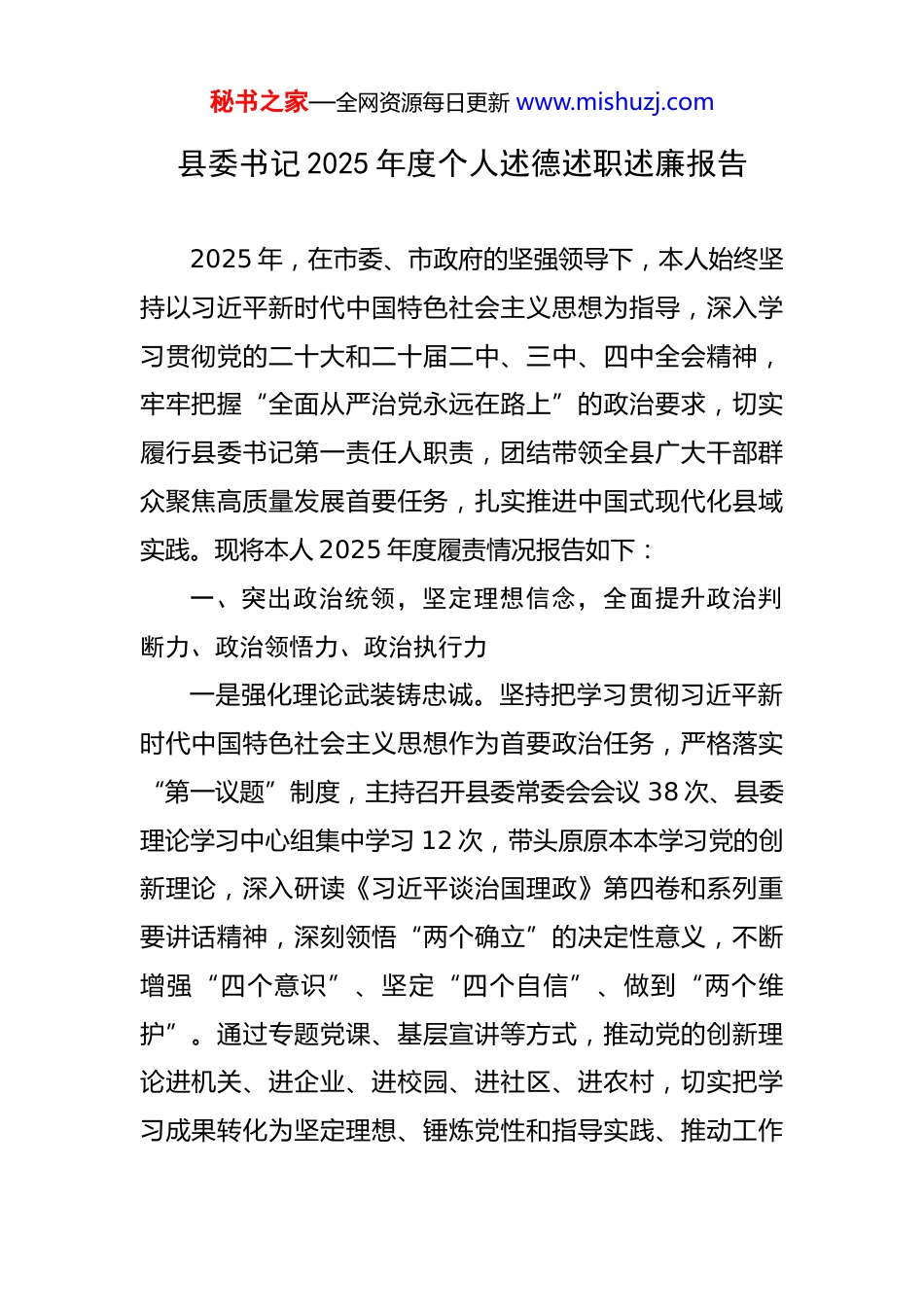 秘书之家—全网资源每日更新 www.mishuzj.com县委书记 2025 年度个人述德述职述廉报告 2025 年,在市委、市政府的坚强领导下,本人始终坚持以习近平新时代中国特色社会主义思想为指导,深入学习贯彻党的二十大和二十届二中、三中、四中全会精神,牢牢把握“全面从严治党永远在路上”的政治要求,切实履行县委书记第一责任人职责,团结带领全县广大干部群众聚焦高质量发展首要任务,扎实推进中国式现代化县域实践。现将本人 2025 年度履责情况报告如下:一、突出政治统领,坚定理想信念,全面提升政治判断力、政治领悟力、政治执行力一是强化理论武装铸忠诚。坚持把学习贯彻习近平新时代中国特色社会主义思想作为首要政治任务,严格落实“第一议题”制度,主持召开县委常委会会议 38 次、县委理论学习中心组集中学习 12 次,带头原原本本学习党的创新理论,深入研读《习近平谈治国理政》第四卷和系列重要讲话精神,深刻领悟“两个确立”的决定性意义,不断增强“四个意识”、坚定“四个自信”、做到“两个维护”。通过专题党课、基层宣讲等方式,推动党的创新理论进机关、进企业、进校园、进社区、进农村,切实把学习成果转化为坚定理想、锤炼党性和指导实践、推动工作秘书之家—全网资源每日更新 www.mishuzj.com的强大动力。二是坚决贯彻党中央决策部署。始终在思想上政治上行动上同以习近平同志为核心的党中央保持高度一致,紧紧围绕全省“四区一高地”战略定位和全市“强省会”行动部署,立足我县资源禀赋和发展基础,系统谋划县域经济社会发展路径,统筹推进产业升级、城乡融合、民生改善、安全稳定等重点工作,确保方向不偏、执行有力。全年召开县委常委会专题研究重大事项 67 项,形成决策意见 213 条,全部建立台账、闭环管理、跟踪问效。三是严守政治纪律规矩底线。严格执行请示报告制度,凡属重大事项均按规定及时向市委请示报告,全年上报重要情况专报 42 件。严肃党内政治生活,带头落实双重组织生活制度,高质量开好民主生活会,自觉接受监督,不断增强政治敏锐性和政治鉴别力,在大是大非面前立场坚定、旗帜鲜明。二、扛牢主体责任,深化党建引领,推动全面从严治党向纵深发展一是压实管党治党政治责任。牢固树立“抓好党建是最大政绩”的理念,认真履行全面从严治党“第一责任人”职责,全年主持召开县委常委会专题研究党建工作 9次、党风廉政建设工作 7 次,召开全县党建工作会议 4次,制定印发《2025 年全县党建工作要点》《落实全面从秘书之家—全网资源每日更新 www.mishuzj.com严治党主体责任清单》,逐级传导压力,层层压实责任。开展党建调研 16 次,覆盖所有乡镇(街道)和重点职能部门,现场协调解决基层党建难题 32 个。督促班子成员严格落实“一岗双责”,对履职不到位的 3 名县级领导进行提醒谈话。二是夯实基层组织战斗堡垒。持续推进党建引领基层治理提质增效,优化完善“乡镇党工委—社区党委—网格党支部—楼栋党小组”四级组织体系,新成立社区党委 8 个、网格党支部 45 个,选聘专职网格员 286 名,实现党组织链条延伸到最末梢。深化在职党员“双报到”机制,全县 263 个单位党组织、8900 余名党员常态化下沉社区,累计开展志愿服务活动 1.2 万余场次,帮助群众解决问题 5800 余个。打造“红色物业”示范点 12 个,推动物业服务与社区治理深度融合。三是树牢实干实绩用人导向。坚持新时代好干部标准,突出政治标准和实干导向,全年提拔重用在项目建设、乡村振兴、招商引资一线表现突出的干部 87 人,其中“90 后”年轻干部 23 人,女干部31 人,少数民族干部 19 人,干部队伍结构进一步优化。严格落实“三个区分开来”,为 5 名在改革创新中出现失误的干部容错免责,激励干部担当作为。组织开展干部作风专项整顿行动,调整不适宜担任现职领导干部 6 人,形成能上能下、优胜劣汰的良好氛围。秘书之家—全网资源每日更新 www.mishuzj.com三、聚焦中心大局,统筹发展和安全,奋力谱写高质量发展新篇章一是经济运行稳中有进。坚持以高质量发展统揽全局,全力稳增长、调结构、促转型,预计...