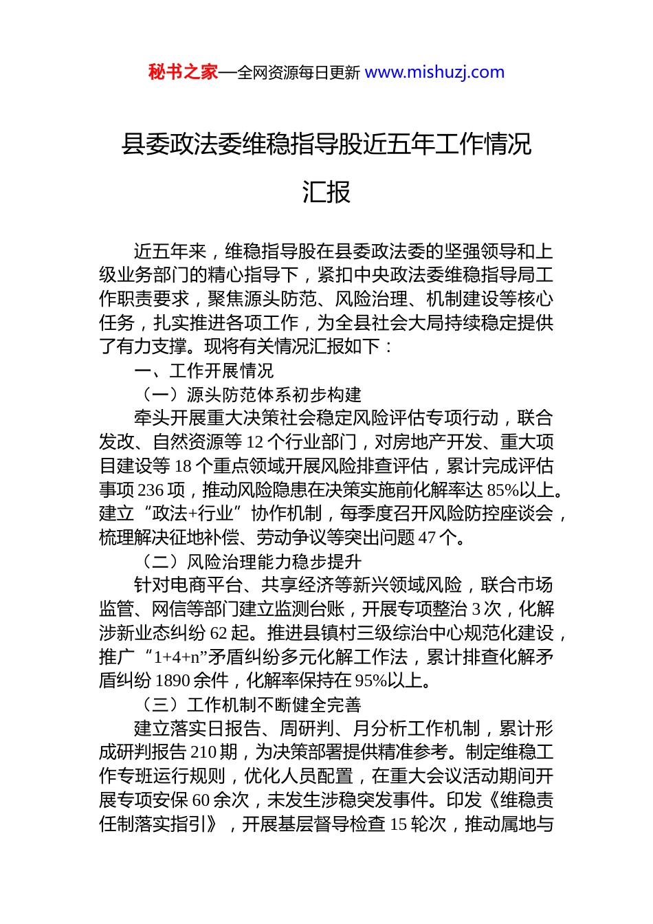 秘书之家—全网资源每日更新 www.mishuzj.com县委政法委维稳指导股近五年工作情况汇报近五年来,维稳指导股在县委政法委的坚强领导和上级业务部门的精心指导下,紧扣中央政法委维稳指导局工作职责要求,聚焦源头防范、风险治理、机制建设等核心任务,扎实推进各项工作,为全县社会大局持续稳定提供了有力支撑。现将有关情况汇报如下:一、工作开展情况(一)源头防范体系初步构建牵头开展重大决策社会稳定风险评估专项行动,联合发改、自然资源等 12 个行业部门,对房地产开发、重大项目建设等 18 个重点领域开展风险排查评估,累计完成评估事项 236 项,推动风险隐患在决策实施前化解率达 85%以上。建立“政法+行业”协作机制,每季度召开风险防控座谈会,梳理解决征地补偿、劳动争议等突出问题 47 个。(二)风险治理能力稳步提升针对电商平台、共享经济等新兴领域风险,联合市场监管、网信等部门建立监测台账,开展专项整治 3 次,化解涉新业态纠纷 62 起。推进县镇村三级综治中心规范化建设,推广“1+4+n”矛盾纠纷多元化解工作法,累计排查化解矛盾纠纷 1890 余件,化解率保持在 95%以上。(三)工作机制不断健全完善建立落实日报告、周研判、月分析工作机制,累计形成研判报告 210 期,为决策部署提供精准参考。制定维稳工作专班运行规则,优化人员配置,在重大会议活动期间开展专项安保 60 余次,未发生涉稳突发事件。印发《维稳责任制落实指引》,开展基层督导检查 15 轮次,推动属地与秘书之家—全网资源每日更新 www.mishuzj.com部门责任衔接贯通。(四)基础保障持续强化组织开展维稳业务培训 12 场次,覆盖基层干部 800 余人次,编写培训教材 3 套。围绕风险预警、事件处置等课题开展专题调研 8 项,形成的《县域新兴领域风险治理路径研究》获市级优秀调研成果奖。二、工作存在问题(一)源头防范精准度不足,责任落实存在“温差”一是风险评估质效不高。部分行业部门对风险评估重视不够,存在“重形式、轻实质”现象,如在乡村振兴项目推进中,仅简单填写评估表,未深入研判群众诉求差异导致 3 个项目实施后引发信访问题。评估标准不统一,房地产、教育等领域未形成针对性评估指标体系,同类项目评估结果差异较大。二是责任传导不够有力。属地责任、部门责任衔接不畅,存在“各自为战”情况,如涉企劳资纠纷处置中,人社部门与乡镇街道信息互通滞后,平均处置周期达 15 天,较合理时限延长 5 天。对责任落实的督查考核偏于形式,近三年专项督查仅发现共性问题 28 个,针对性整改措施不足,问题复发率达 30%。三是基层履职能力薄弱。县乡两级维稳干部中,具备专业背景的仅占 12%,部分干部对《维护社会稳定责任制规定》理解不深,在化解复杂矛盾时依赖“经验主义”,近五年因处置不当引发的矛盾升级事件达 17 起。(二)新兴领域治理滞后,风险防控存在“盲区”一是监测预警体系不健全。针对直播带货、跨境电商等新商业模式,未建立专门监测机制,缺乏数据共享平台近三年新增涉新兴领域信访事项年均增长 22%,其中 60%未能提前预警。跨部门协作机制流于表面,网信、金融等部门数据壁垒未打破,联合研判仅停留在季度会议层面,无法实现实时联动。秘书之家—全网资源每日更新 www.mishuzj.com二是风险处置能力不足。缺乏新兴领域风险处置规范流程,如面对平台经济“爆雷”事件,因无明确责任分工首次处置平均耗时 20 天,较传统领域延长 40%。专业力量匮乏,未组建新兴领域风险治理专家团队,处置过程中多依赖常规手段,对技术漏洞、数据安全等问题束手无策。三是行业监管协同缺位。行业主管部门“重发展、轻监管”,在新能源项目审批中未同步开展风险评估,导致 2个项目因环保问题引发群体性诉求。政法机关与行业部门联动不足,提前介入指导不够,仅在风险爆发后参与处置错失防控最佳时机。(三)机制建设存在短板,运行效能有待提升一是监测预警体系不完善。风险监测指标设置偏于传统,涵盖政治安全、社会治安等传统领域的指标占比达85%,而数据安全、算法歧视等新兴风险指标缺失。“雪亮工程”“天网工程”融合应...