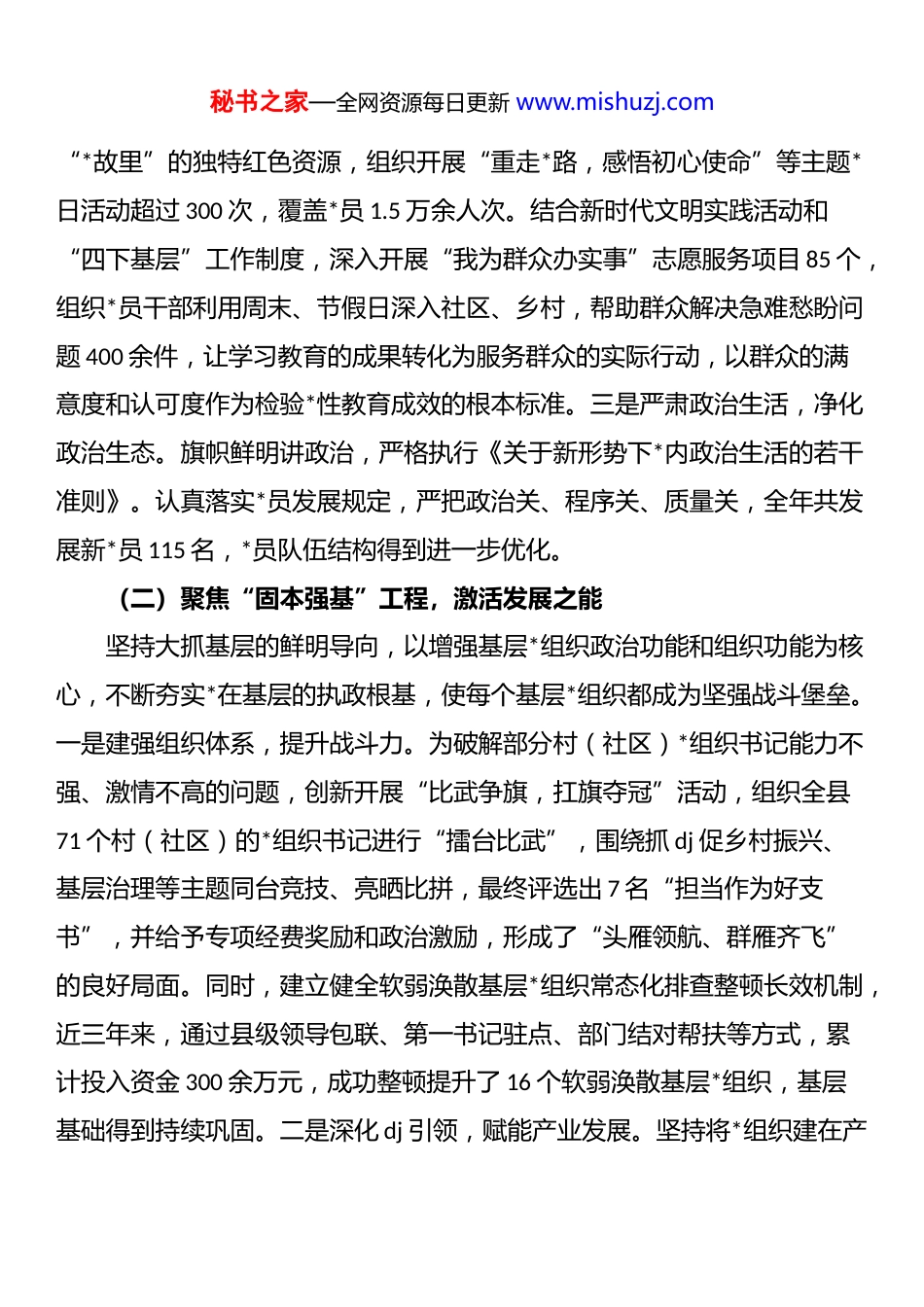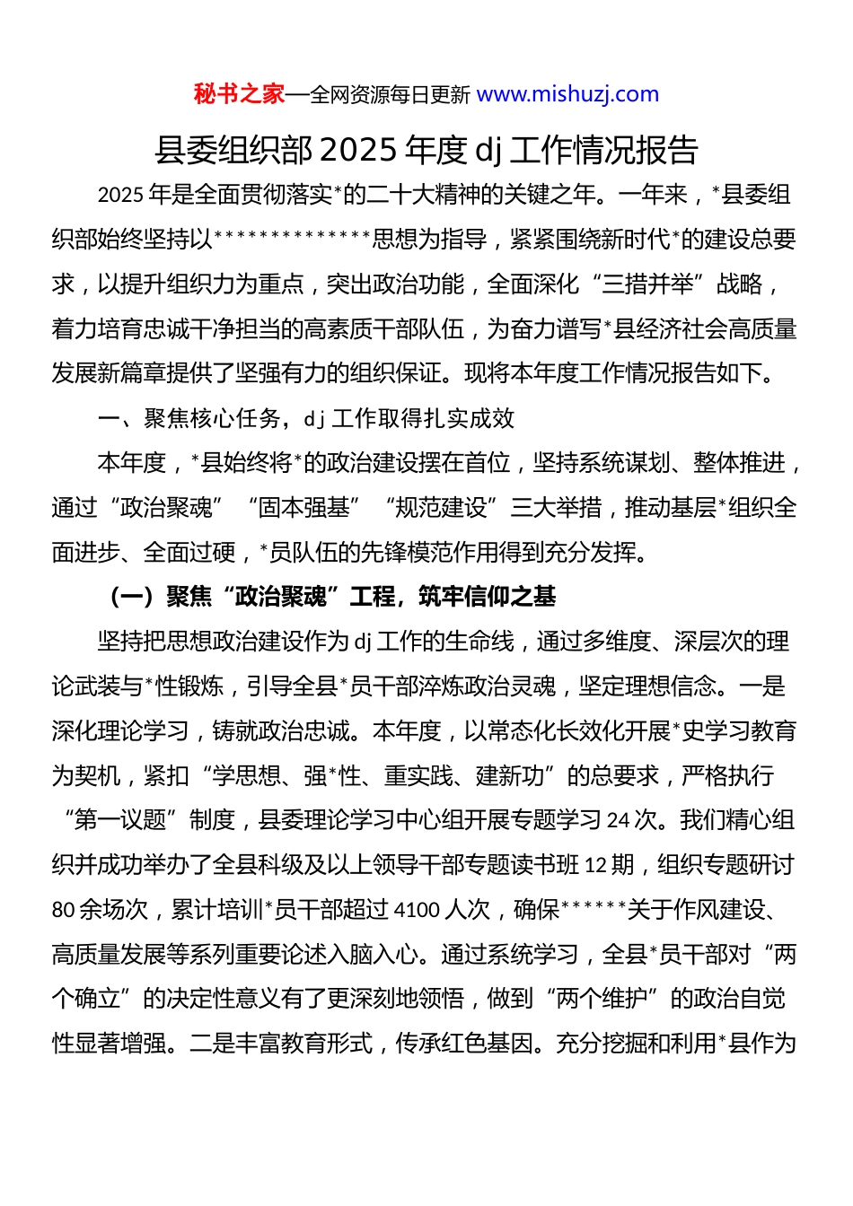 秘书之家—全网资源每日更新 www.mishuzj.com县委组织部 2025 年度 dj 工作情况报告2025 年是全面贯彻落实*的二十大精神的关键之年。一年来,*县委组织部始终坚持以**************思想为指导,紧紧围绕新时代*的建设总要求,以提升组织力为重点,突出政治功能,全面深化“三措并举”战略,着力培育忠诚干净担当的高素质干部队伍,为奋力谱写*县经济社会高质量发展新篇章提供了坚强有力的组织保证。现将本年度工作情况报告如下。一、聚焦核心任务,dj 工作取得扎实成效本年度,*县始终将*的政治建设摆在首位,坚持系统谋划、整体推进,通过“政治聚魂”“固本强基”“规范建设”三大举措,推动基层*组织全面进步、全面过硬,*员队伍的先锋模范作用得到充分发挥。(一)聚焦“政治聚魂”工程,筑牢信仰之基坚持把思想政治建设作为 dj 工作的生命线,通过多维度、深层次的理论武装与*性锻炼,引导全县*员干部淬炼政治灵魂,坚定理想信念。一是深化理论学习,铸就政治忠诚。本年度,以常态化长效化开展*史学习教育为契机,紧扣“学思想、强*性、重实践、建新功”的总要求,严格执行“第一议题”制度,县委理论学习中心组开展专题学习 24 次。我们精心组织并成功举办了全县科级及以上领导干部专题读书班 12 期,组织专题研讨80 余场次,累计培训*员干部超过 4100 人次,确保******关于作风建设、高质量发展等系列重要论述入脑入心。通过系统学习,全县*员干部对“两个确立”的决定性意义有了更深刻地领悟,做到“两个维护”的政治自觉性显著增强。二是丰富教育形式,传承红色基因。充分挖掘和利用*县作为秘书之家—全网资源每日更新 www.mishuzj.com“*故里”的独特红色资源,组织开展“重走*路,感悟初心使命”等主题*日活动超过 300 次,覆盖*员 1.5 万余人次。结合新时代文明实践活动和“四下基层”工作制度,深入开展“我为群众办实事”志愿服务项目 85 个,组织*员干部利用周末、节假日深入社区、乡村,帮助群众解决急难愁盼问题 400 余件,让学习教育的成果转化为服务群众的实际行动,以群众的满意度和认可度作为检验*性教育成效的根本标准。三是严肃政治生活,净化政治生态。旗帜鲜明讲政治,严格执行《关于新形势下*内政治生活的若干准则》。认真落实*员发展规定,严把政治关、程序关、质量关,全年共发展新*员 115 名,*员队伍结构得到进一步优化。(二)聚焦“固本强基”工程,激活发展之能坚持大抓基层的鲜明导向,以增强基层*组织政治功能和组织功能为核心,不断夯实*在基层的执政根基,使每个基层*组织都成为坚强战斗堡垒。一是建强组织体系,提升战斗力。为破解部分村(社区)*组织书记能力不强、激情不高的问题,创新开展“比武争旗,扛旗夺冠”活动,组织全县71 个村(社区)的*组织书记进行“擂台比武”,围绕抓 dj 促乡村振兴、基层治理等主题同台竞技、亮晒比拼,最终评选出 7 名“担当作为好支书”,并给予专项经费奖励和政治激励,形成了“头雁领航、群雁齐飞”的良好局面。同时,建立健全软弱涣散基层*组织常态化排查整顿长效机制,近三年来,通过县级领导包联、第一书记驻点、部门结对帮扶等方式,累计投入资金 300 余万元,成功整顿提升了 16 个软弱涣散基层*组织,基层基础得到持续巩固。二是深化 dj 引领,赋能产业发展。坚持将*组织建在产秘书之家—全网资源每日更新 www.mishuzj.com业链上、*员聚在产业链上、群众富在产业链上,大力推行“*支部+龙头企业+合作社+农户”的融合发展模式。例如,在*镇的特色水果产业和*乡的生态旅游产业中,通过成立产业功能区*组织,有效整合了土地、资金、技术、人才等要素。截至 2025 年 10 月底,全县已有 7 个村集体经济年收入突破 50 万元大关,其中*村和*村的“dj 引领绿色产业发展”案例成功入选省级乡村振兴典型案例库,为全省提供了可复制、可推广的经验。三是夯实群众根基,凝聚治理合力。聚焦群众工作“石榴子”工程,深入开展平安建设、环境整治、文明创建等“六大行动”。全面推行县级领导联系乡镇、县直部门联系村(社区)、*员干部联系户的“三联”工作机制...