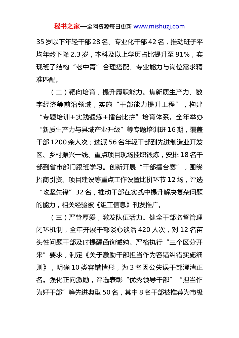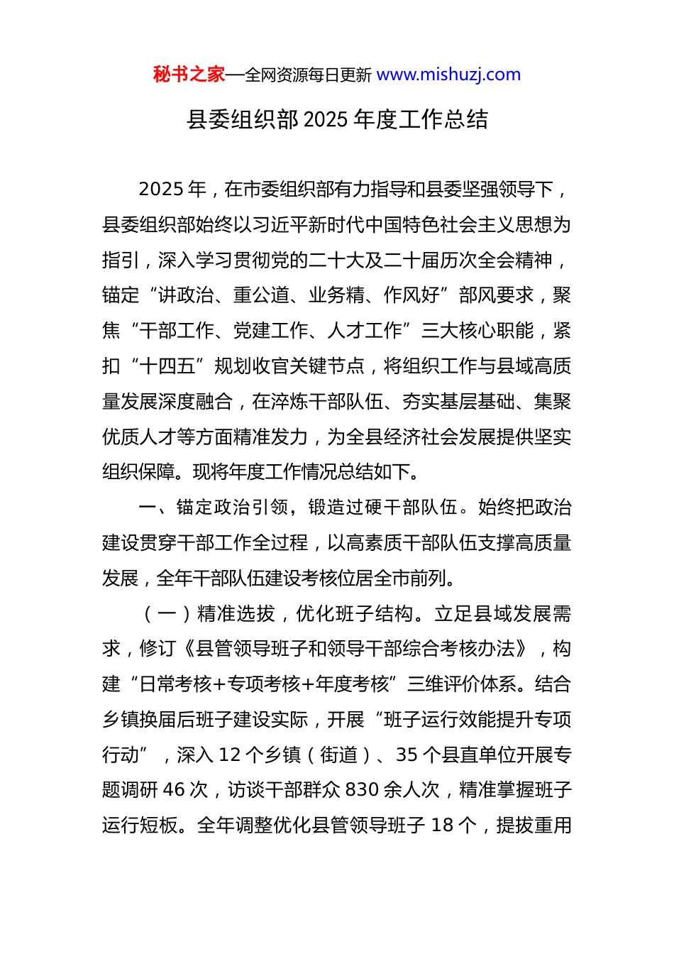 秘书之家—全网资源每日更新 www.mishuzj.com县委组织部 2025 年度工作总结 2025 年,在市委组织部有力指导和县委坚强领导下,县委组织部始终以习近平新时代中国特色社会主义思想为指引,深入学习贯彻党的二十大及二十届历次全会精神,锚定“讲政治、重公道、业务精、作风好”部风要求,聚焦“干部工作、党建工作、人才工作”三大核心职能,紧扣“十四五”规划收官关键节点,将组织工作与县域高质量发展深度融合,在淬炼干部队伍、夯实基层基础、集聚优质人才等方面精准发力,为全县经济社会发展提供坚实组织保障。现将年度工作情况总结如下。一、锚定政治引领,锻造过硬干部队伍。始终把政治建设贯穿干部工作全过程,以高素质干部队伍支撑高质量发展,全年干部队伍建设考核位居全市前列。(一)精准选拔,优化班子结构。立足县域发展需求,修订《县管领导班子和领导干部综合考核办法》,构建“日常考核+专项考核+年度考核”三维评价体系。结合乡镇换届后班子建设实际,开展“班子运行效能提升专项行动”,深入 12 个乡镇(街道)、35 个县直单位开展专题调研 46 次,访谈干部群众 830 余人次,精准掌握班子运行短板。全年调整优化县管领导班子 18 个,提拔重用秘书之家—全网资源每日更新 www.mishuzj.com35 岁以下年轻干部 28 名、专业化干部 42 名,推动班子平均年龄下降 2.3 岁,本科及以上学历占比提升至 91%,实现班子结构“老中青”合理搭配、专业能力与岗位需求精准匹配。(二)靶向培育,提升履职能力。焦新质生产力、数字经济等前沿领域,实施“干部能力提升工程”,构建“专题培训+实践锻炼+擂台比拼”培育体系。全年举办“新质生产力与县域产业升级”等专题培训班 16 期,覆盖干部 1200 余人次;选派 56 名年轻干部到先进制造业开发区、乡村振兴一线、重点项目现场挂职锻炼,安排 18 名干部到省市部门跟班学习。创新开展“干部擂台赛”,围绕招商引资、项目建设等重点工作设置比拼环节 12 场,评选“攻坚先锋”32 名,推动干部在实战中提升解决复杂问题的能力,相关经验被《组工信息》刊发推广。(三)严管厚爱,激发队伍活力。健全干部监督管理闭环机制,全年开展干部谈心谈话 420 人次,对 12 名苗头性问题干部及时提醒函询诫勉。严格执行“三个区分开来”要求,制定《关于激励干部担当作为容错纠错实施细则》,明确 10 类容错情形,为 3 名因公失误干部澄清正名。强化正向激励,评选表彰“优秀领导干部”“担当作为好干部”等先进典型 50 名,其中 8 名干部被推荐为市级秘书之家—全网资源每日更新 www.mishuzj.com先进典型;落实干部待遇保障政策,改造提升乡镇干部周转房 120 套,开展干部健康体检、心理疏导等关爱活动,干部队伍干事热情持续高涨。二、聚焦强基赋能,筑牢基层战斗堡垒。坚持大抓基层的鲜明导向,以党建引领基层治理和乡村振兴,全年基层党建工作获市级表彰 6 项,2 个基层党组织获评省级先进。(一)深化主题教育成果,强化思想引领。建立“不忘初心、牢记使命”主题教育长效机制,开展“重温初心使命、建功 2025”专题活动,组织基层党组织书记专题培训 4 期,覆盖 420 余人次。创新“党建+理论宣讲”模式,组建“部长宣讲团”“党员志愿宣讲队”等队伍 36支,深入田间地头、企业车间开展宣讲 280 余场次,覆盖党员群众 1.2 万人次。打造“线上学习平台”,推送学习资料 320 余期,组织线上测试 12 次,党员理论学习参与率达 98%以上,推动党的创新理论在基层落地生根。(二)推进标准化建设,夯实基层基础。实施“基层党组织标准化规范化建设提升行动”,投入 280 万元用于村级活动场所升级改造,完成 32 个薄弱村党组织阵地提质,打造“红色驿站”“党群服务中心示范点”18 个。分类推进各领域党建工作,在农村深化“党建+乡村振兴”模秘书之家—全网资源每日更新 www.mishuzj.com式,培育“党建引领产业发展示范村”25 个;在社区推行“党建+网格治理”,划分网格 420 个,配备网格员 1260名,解决群众诉求 3800 余件;在机关开展“党建+业务融合”攻坚,...