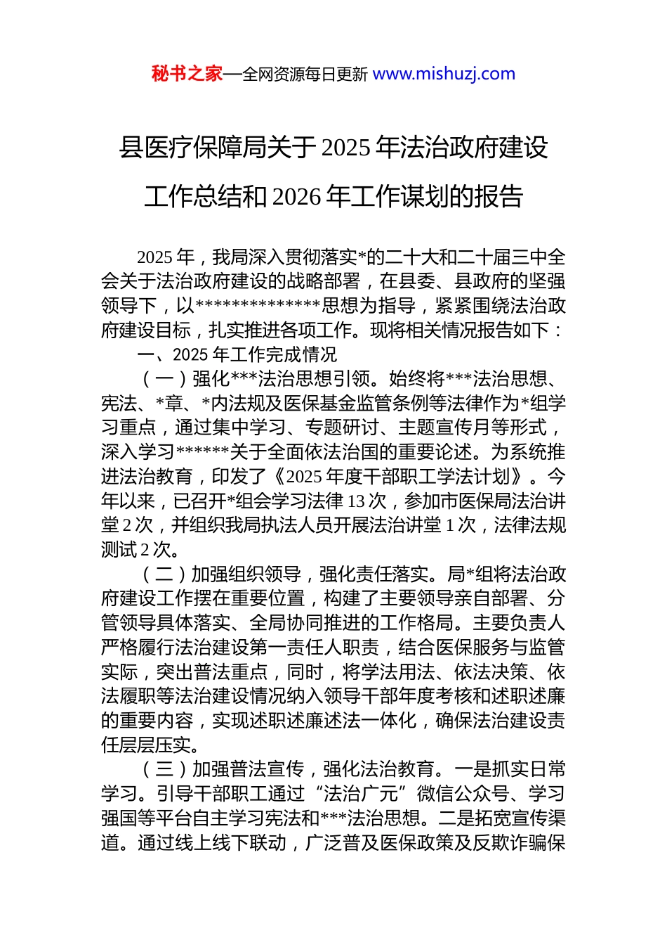 秘书之家—全网资源每日更新 www.mishuzj.com县医疗保障局关于 2025 年法治政府建设工作总结和 2026 年工作谋划的报告2025 年,我局深入贯彻落实*的二十大和二十届三中全会关于法治政府建设的战略部署,在县委、县政府的坚强领导下,以**************思想为指导,紧紧围绕法治政府建设目标,扎实推进各项工作。现将相关情况报告如下:一、2025 年工作完成情况(一)强化***法治思想引领。始终将***法治思想、宪法、*章、*内法规及医保基金监管条例等法律作为*组学习重点,通过集中学习、专题研讨、主题宣传月等形式,深入学习******关于全面依法治国的重要论述。为系统推进法治教育,印发了《2025 年度干部职工学法计划》。今年以来,已召开*组会学习法律 13 次,参加市医保局法治讲堂 2 次,并组织我局执法人员开展法治讲堂 1 次,法律法规测试 2 次。(二)加强组织领导,强化责任落实。局*组将法治政府建设工作摆在重要位置,构建了主要领导亲自部署、分管领导具体落实、全局协同推进的工作格局。主要负责人严格履行法治建设第一责任人职责,结合医保服务与监管实际,突出普法重点,同时,将学法用法、依法决策、依法履职等法治建设情况纳入领导干部年度考核和述职述廉的重要内容,实现述职述廉述法一体化,确保法治建设责任层层压实。(三)加强普法宣传,强化法治教育。一是抓实日常学习。引导干部职工通过“法治广元”微信公众号、学习强国等平台自主学习宪法和***法治思想。二是拓宽宣传渠道。通过线上线下联动,广泛普及医保政策及反欺诈骗保秘书之家—全网资源每日更新 www.mishuzj.com知识,有效预防和化解矛盾风险。三是强化重点宣传。以国家宪法日、民法典颁布五周年等为契机,组织*员志愿服务队深入乡镇、社区,开展医保政策宣传及文明城市创建活动 10 余场。四是突出专项宣传。4 月份,我局集中开展“基金监管集中宣传月”活动,通过悬挂横幅、发放宣传手册、举办专题讲座等形式,重点宣传医保基金监管法律法规,曝光典型案例,增强群众法治意识,营造了全社会共同维护医保基金安全的良好氛围。(四)加强法治建设,提升服务水平。1.规范执法程序,推进阳光决策。一是坚持持证执法。严格落实行政执法人员持证上岗和培训制度,聚焦通用法律与医保专业法规,定期组织执法人员参加培训和学习,确保熟练掌握相关法律法规和执法程序。目前,我局已有21 名执法人员通过行政执法资格考试。二是完善决策机制。我局始终将科学民主决策作为依法行政的核心,严格执行“三重一大”事项集体研究制度,明确要求一把手末位表态,确保每一项决议、决定都经过充分讨论、程序规范、内容合法。同时,为提升决策的专业性和法律保障,我局专门选聘了 1 名资深律师担任常年法律顾问,全程参与重大行政决策、合同审查、规范性文件制定等关键环节,确保行政事务处理公正、廉洁、高效。三是强化执法公开。为增强执法公信力,我局严格落实执法信息公示制度,通过官方网站、政务公开栏等渠道,全面公示执法主体、执法人员、执法事项清单及执法依据,主动接受社会监督,推动执法内容透明化、执法过程规范化。2.优化医保服务,做好民生保障。一是聚焦民生需求,解决实际困难。结合“我为群众办实事”实践活动,我局组织工作人员深入街道、社区和医药机构,广泛搜集群众在医保领域遇到的难点、痛点问题,并逐一研究解决。截至目前,已累计救助 11.47 万人次,支出救助资金 xx 万元,切实减轻了困难群众医疗负担。二是优化服务流程,提升秘书之家—全网资源每日更新 www.mishuzj.com办事效率。在业务办理过程中,我局工作人员主动向群众普及医保政策知识,耐心解答疑难问题,确保服务公开透明。同时,设立专门的医保政策咨询热线,安排专人接听及时为群众提供精准的政策解读和业务指导。三是规范信访办理。严格按照信访工作条例要求,建立信访事项登记转办、督办、反馈闭环机制,确保群众诉求件件有落实、事事有回音,切实维护群众合法权益。今年累计办理 12345等各类信访平台信访及求助 200 余件,办结率 100%,满意率 100%。3.严格执法监管,维护基金安全。坚...