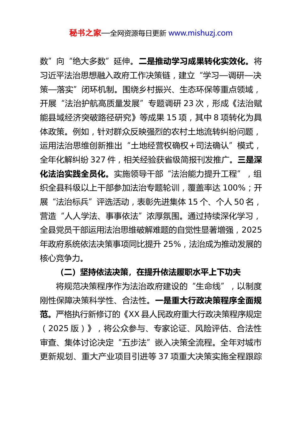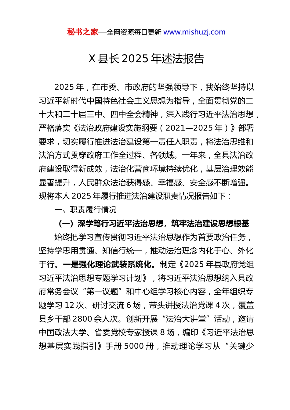 秘书之家—全网资源每日更新 www.mishuzj.comX 县长 2025 年述法报告2025 年,在市委、市政府的坚强领导下,我始终坚持以习近平新时代中国特色社会主义思想为指导,全面贯彻党的二十大和二十届三中、四中全会精神,深入践行习近平法治思想,严格落实《法治政府建设实施纲要(2021—2025 年)》部署要求,切实履行推进法治建设第一责任人职责,将法治思维和法治方式贯穿政府工作全过程、各领域。一年来,全县法治政府建设取得新成效,法治化营商环境持续优化,基层治理效能显著提升,人民群众法治获得感、幸福感、安全感不断增强。现将本人 2025 年履行推进法治建设职责情况报告如下:一、职责履行情况(一)深学笃行习近平法治思想,筑牢法治建设思想根基始终把学习宣传贯彻习近平法治思想作为首要政治任务,坚持学思用贯通、知信行统一,推动法治理念内化于心、外化于行。一是强化理论武装系统化。制定《2025 年县政府党组习近平法治思想专题学习计划》,将习近平法治思想纳入县政府常务会议“第一议题”和中心组学习核心内容,全年组织专题学习 12 次、研讨交流 6 场,带头讲授法治党课 4 次,覆盖县乡干部 2800 余人次。创新开展“法治大讲堂”活动,邀请中国政法大学、省委党校专家授课 8 场,编印《习近平法治思想基层实践指引》手册 5000 册,推动理论学习从“关键少秘书之家—全网资源每日更新 www.mishuzj.com数”向“绝大多数”延伸。二是推动学习成果转化实效化。将习近平法治思想融入政府工作决策链,建立“学习—调研—决策—落实”闭环机制。围绕乡村振兴、生态环保等重点领域,开展“法治护航高质量发展”专题调研 23 次,形成《法治赋能县域经济突破路径研究》等成果 15 项,其中 8 项转化为具体政策。例如,针对群众反映强烈的农村土地流转纠纷问题,运用法治思维创新推出“土地经营权确权+司法确认”模式,全年化解纠纷 327 件,相关经验获省级简报刊发推广。三是深化法治实践全员化。实施领导干部“法治能力提升工程”,组织全县科级以上干部参加法治专题轮训,覆盖率达 100%;开展“法治标兵”评选活动,表彰先进集体 15 个、个人 50 名,营造“人人学法、事事依法”浓厚氛围。通过持续深化学习,全县党员干部运用法治思维破解难题的自觉性显著增强,2025年政府系统依法决策事项同比提升 25%,法治成为推动发展的核心竞争力。(二)坚持依法决策,在提升依法履职水平上下功夫将规范决策程序作为法治政府建设的“生命线”,以制度刚性保障决策科学性、合法性。一是重大行政决策程序全面规范。严格执行新修订的《XX 县人民政府重大行政决策程序规定(2025 版)》,将公众参与、专家论证、风险评估、合法性审查、集体讨论决定“五步法”嵌入决策全流程。全年对城市更新规划、重大产业项目引进等 37 项重大决策实施全程跟踪秘书之家—全网资源每日更新 www.mishuzj.com管理,召开听证会 21 场,征集群众意见 1850 条,采纳合理建议 236 条;组织专家论证会 19 次,涉及法律、经济、环保等领域专家 152 人次;完成社会稳定风险评估 37 项,评估率达100%,确保决策“零风险”落地。例如,在总投资 15 亿元的新能源产业园项目决策中,通过多轮专家论证和公众听证,优化了征地补偿方案,实现项目“零阻工”推进。二是合法性审查质效双提升。强化司法行政部门“法治守门人”作用,建立“前置审查+动态清理”双机制。全年审查行政规范性文件 48件、重大行政协议 26 份,提出修改意见 189 条,审查意见采纳率 100%;开展规范性文件集中清理行动 3 次,废止与上位法冲突文件 12 件,修订滞后条款 27 项,确保制度“立改废”与法治要求同步。创新推行“审查意见书+风险提示函”双反馈模式,对县住建局拟出台的《老旧小区改造管理办法》指出8 处法律风险,避免潜在行政诉讼 20 余起。三是法律顾问作用深度发挥。优化“1+N”法律顾问体系(1 个县级中心+28 个乡镇分站),新聘法学教授、实务专家等高端顾问 15 名,实现县乡法律顾问全覆盖。全年参与政府事务 420 件次,包括审查文件 186 件、...